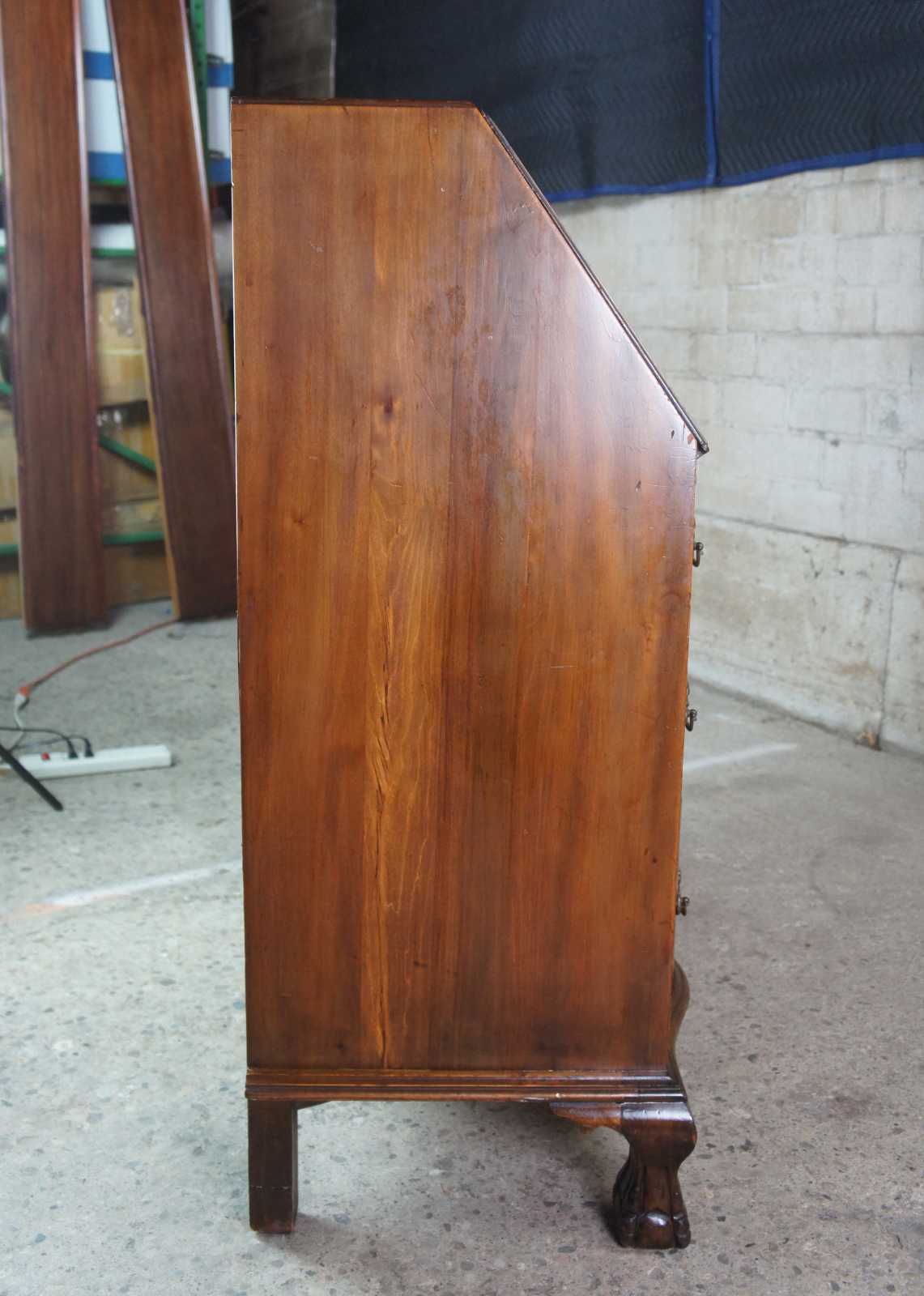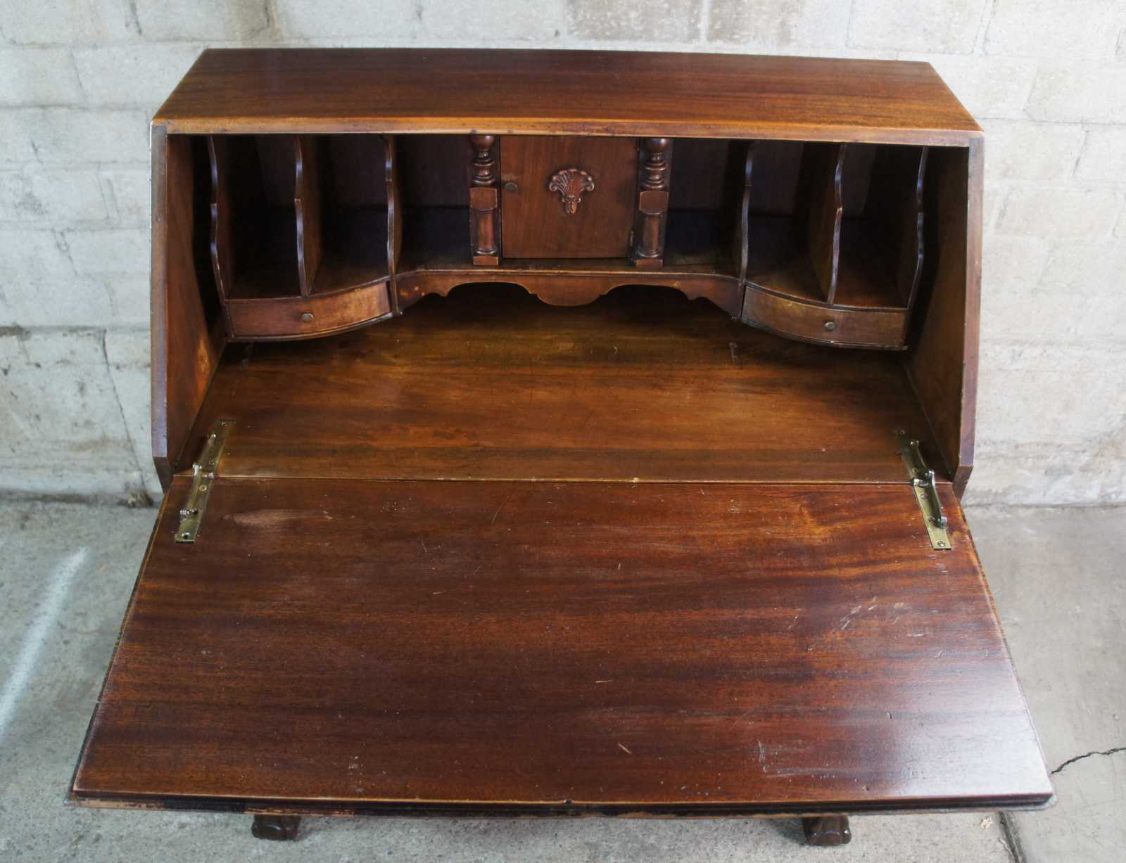 Antique Chippendale secretary, bureau or writing desk. Made from mahogany featuring a flip top that opens to multiple drawers and file storage. The dresser is constructed with an oxbow front with three drawers and federal style hardware over ball and claw feet.