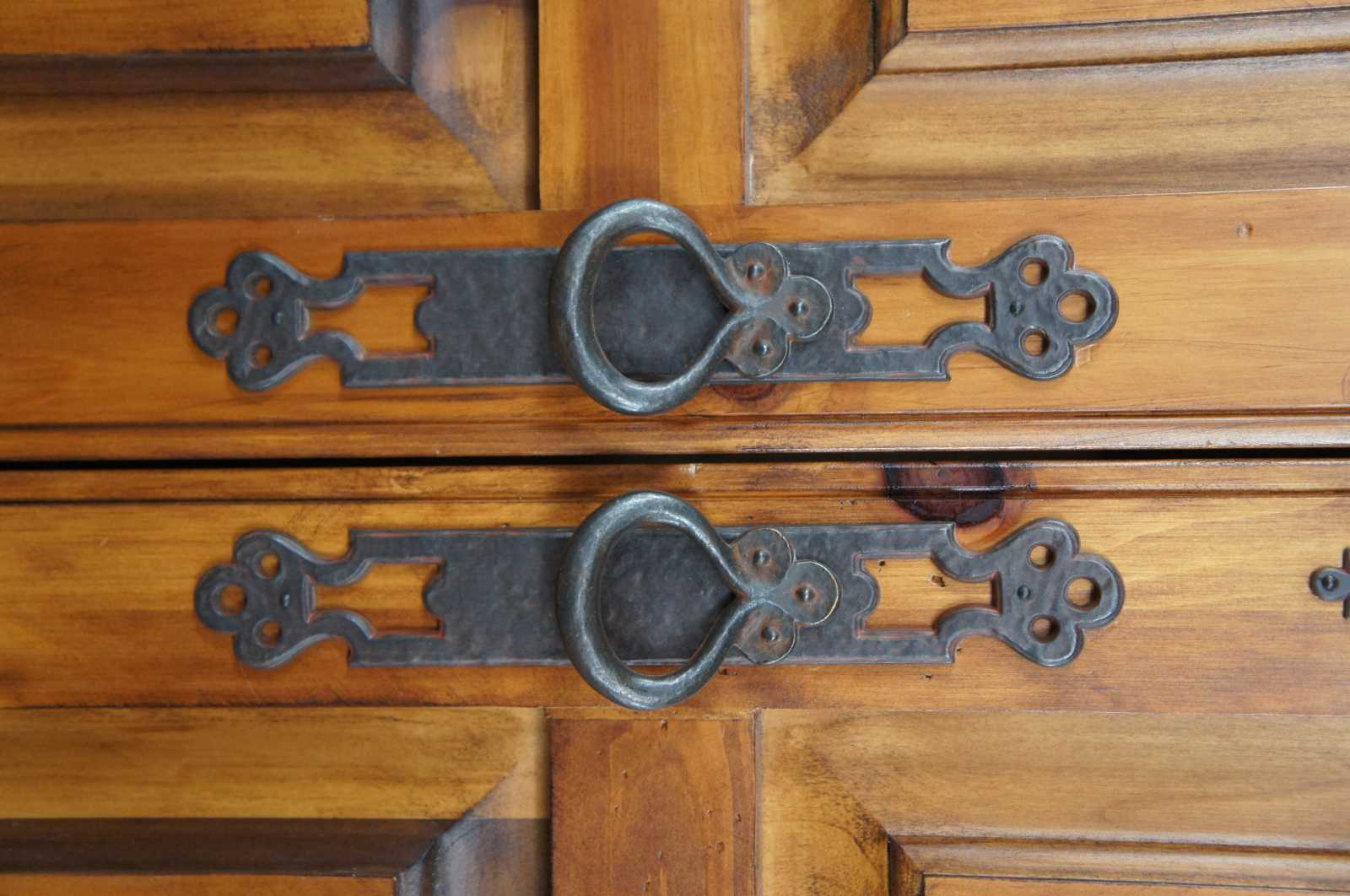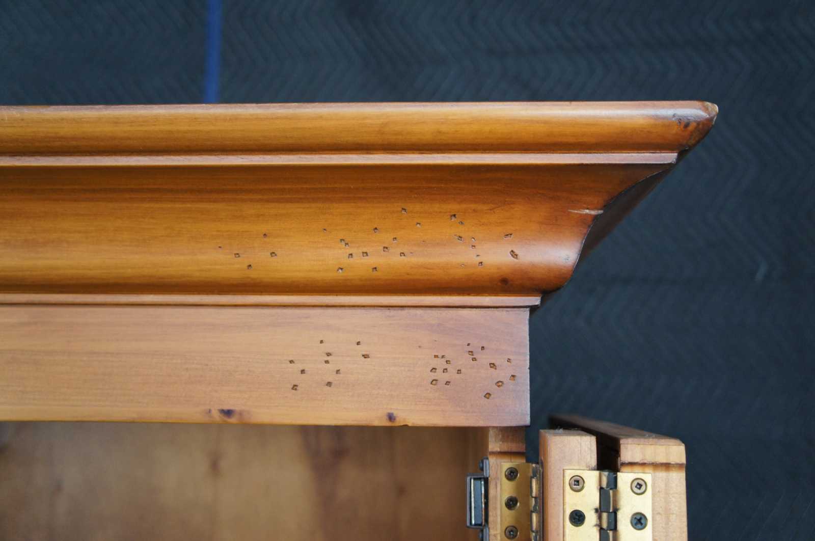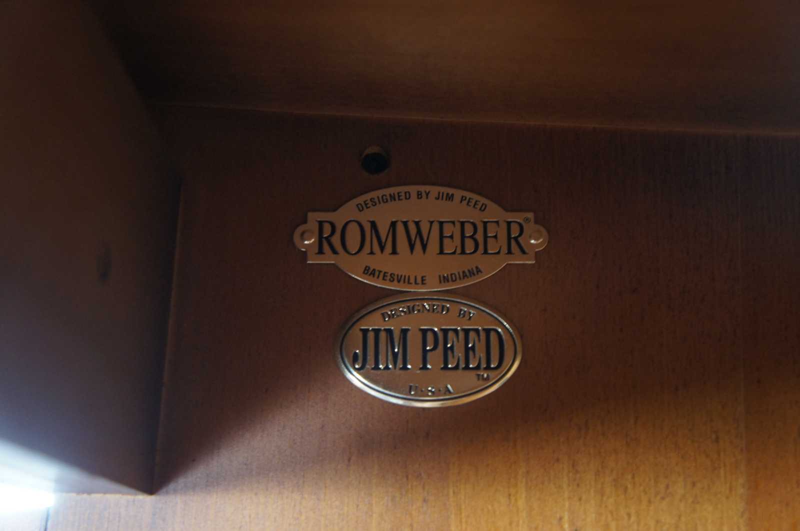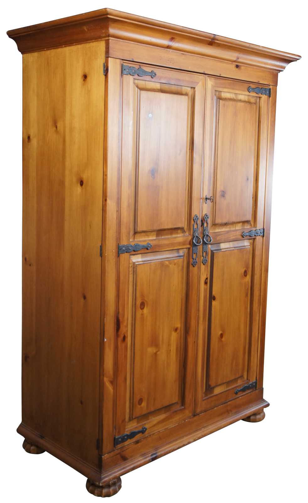 Vintage Jim Peed for Romweber furniture TV entertainment cabinet or armoire. Made of pine featuring iron hardware with paneled doors, round scalloped feet and double hinged doors.