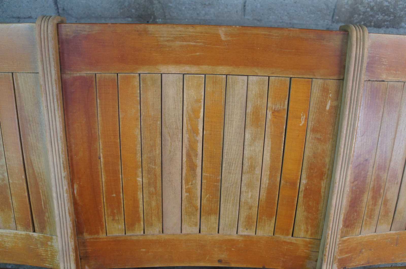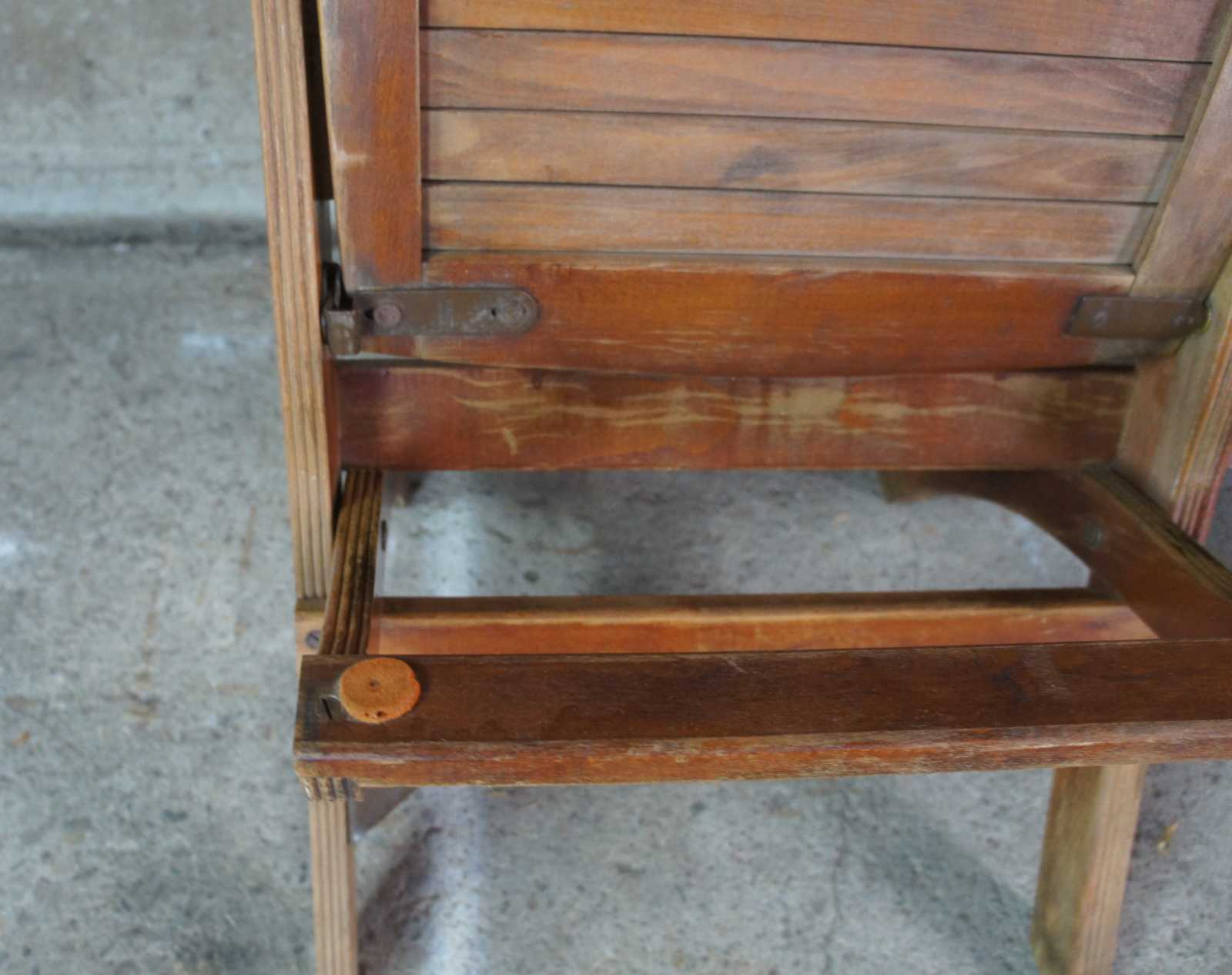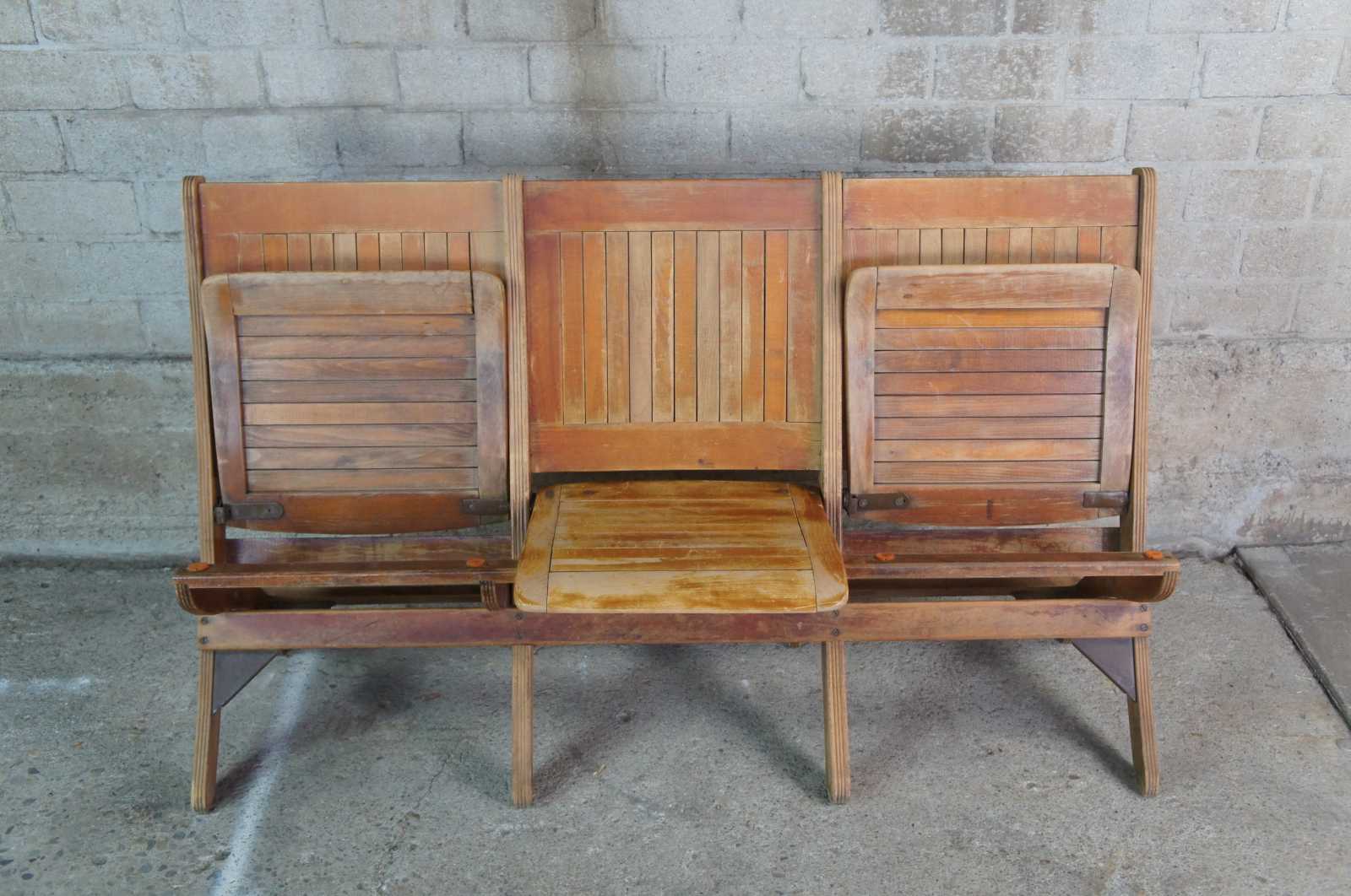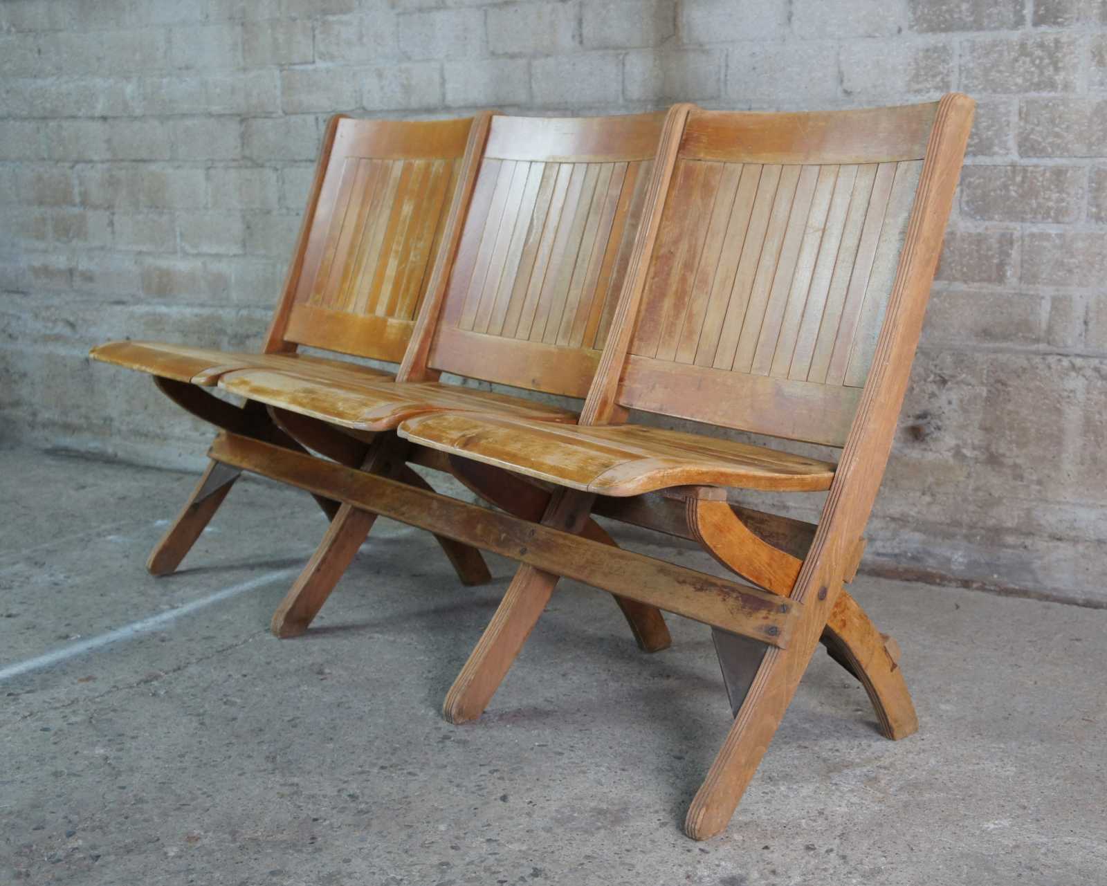 Antique oak folding country farmhouse bench or pew. Made of oak featuring mission styling with a slat back and double folding action. Great for use in office waiting room.