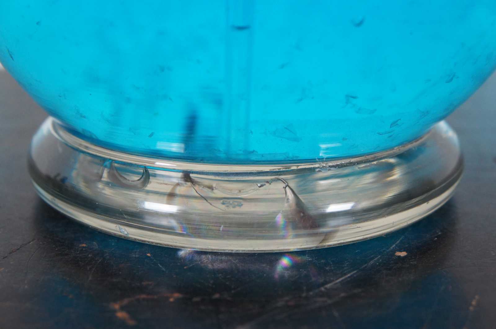 Rare antique Standard English Seltzogene by the British Syphon Manufacturing Company; filled with blue tinted water by a previous owner. This bottle is likely to date to the late 1800's and sports an art nouveau, double globe/gourd design. The gourd shape had a purpose, the top section was used for Tartaric Acid and Bicarbonate of soda (which reacted to create Carbon Dioxide), while the bottom section was used for water or other substances which needed to be made sparkling. The resultant gas would then force the water up through the glass tube attached to the nozzle. Many of these bottles originated in France, though this example has an English inscription which may indicate a slightly later date. The body of such bottles were originally fitted with metal netting and has a pewter spout which bears the inscribed hallmark of the manufacturer. The metal netting was fitted to prevent glass from dispersing in case of an explosion which occasionally happened with such bottles.