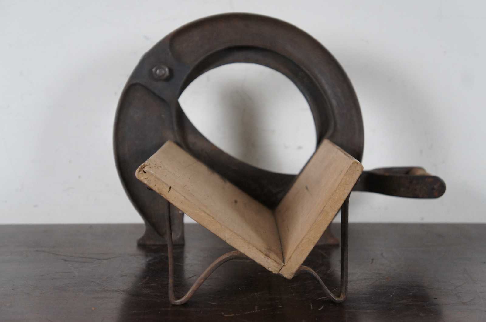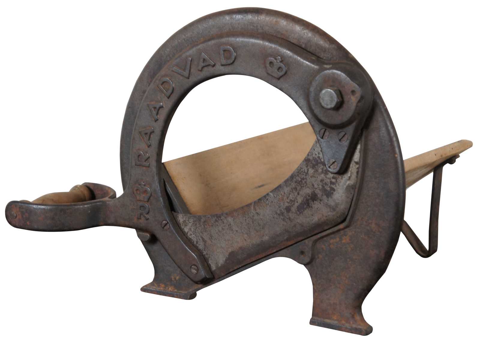 All original and rare Danish cast iron and wood bread or baguette slicer by Raadvad.