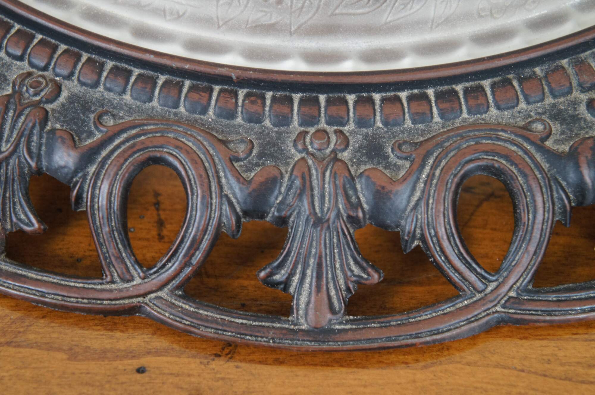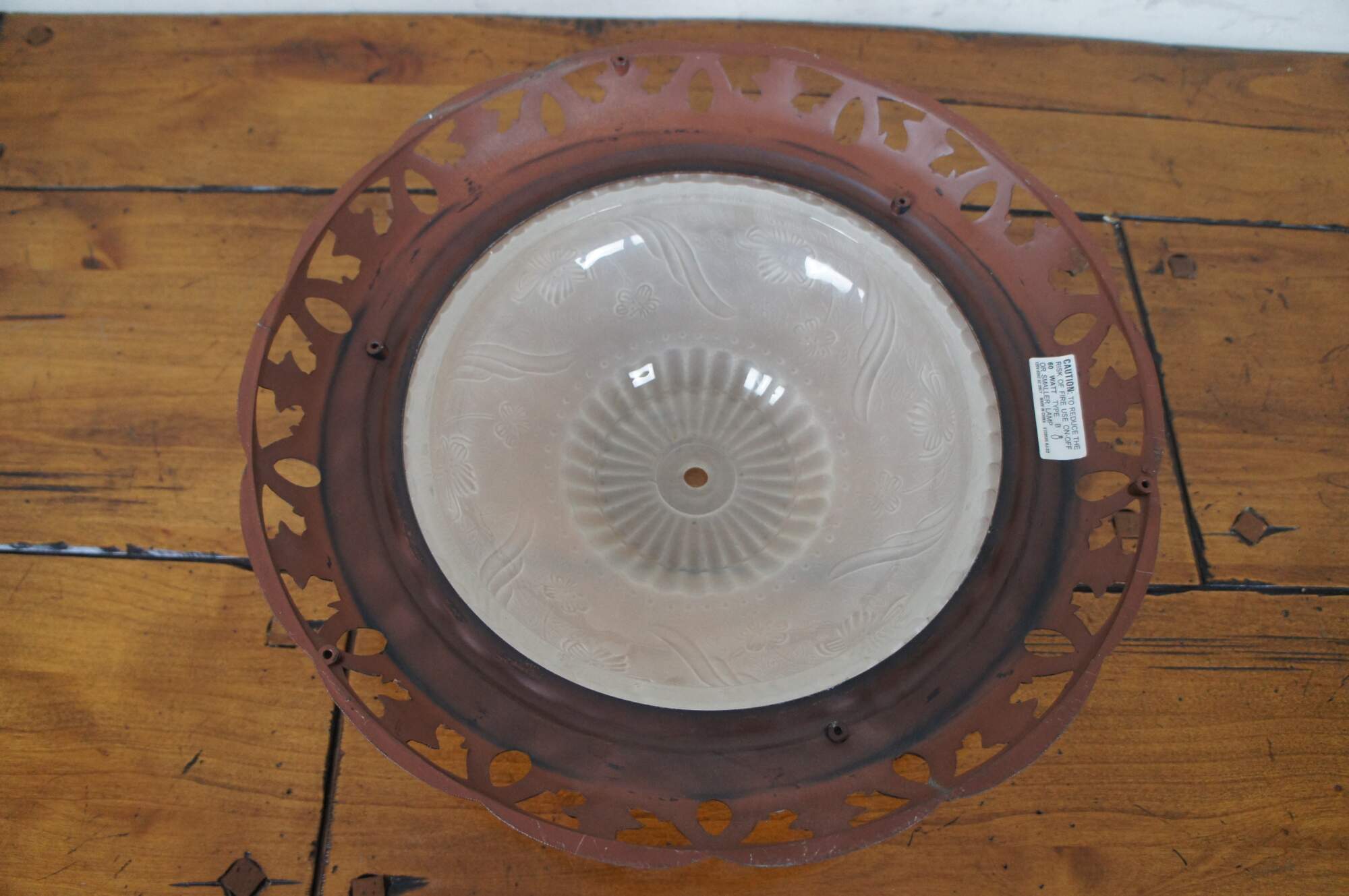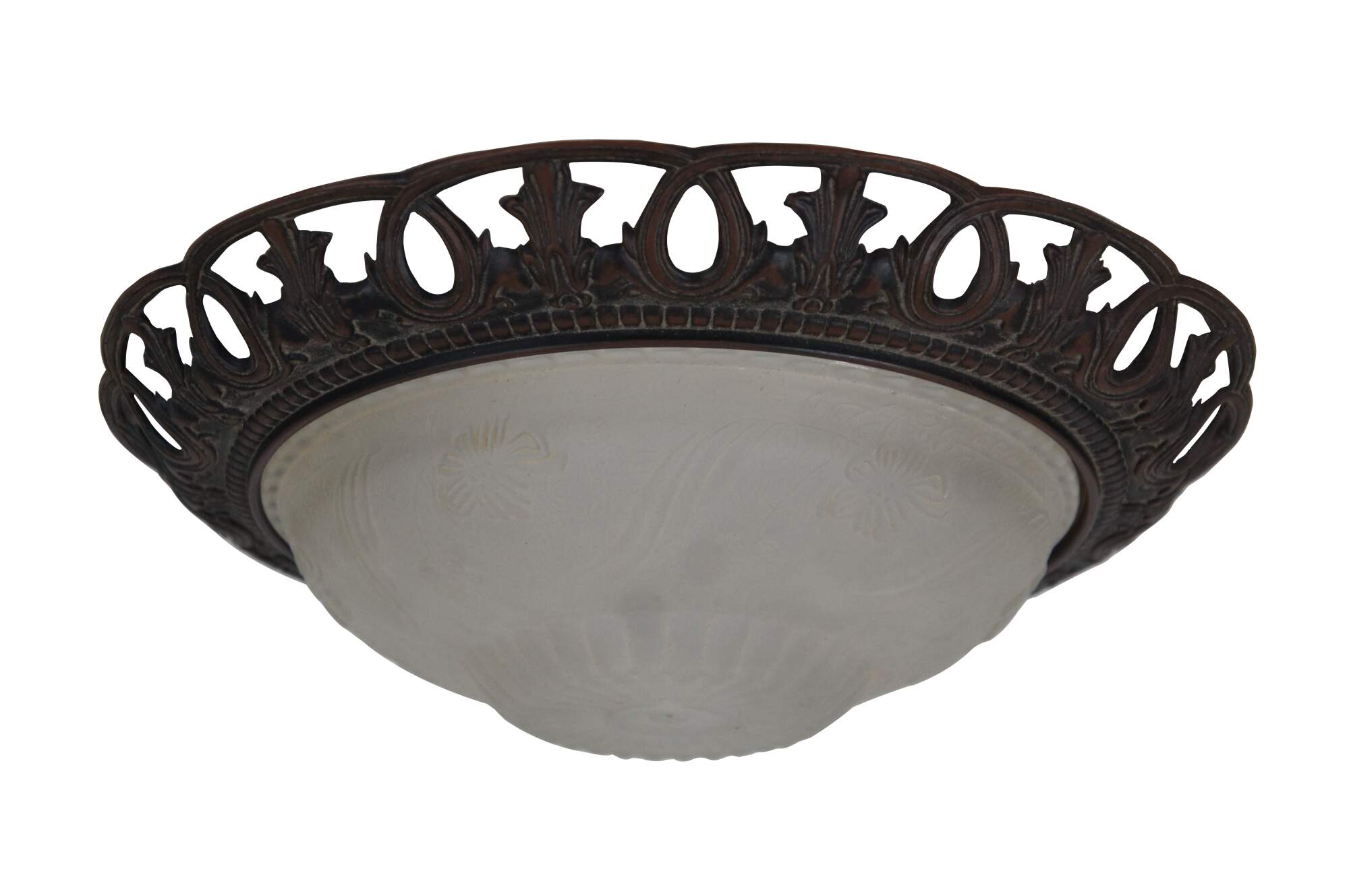 French Provincial / country style flush mount ceiling light medallion in an antique copper finish with a frosted glass shade decorated with flowers and swirls.