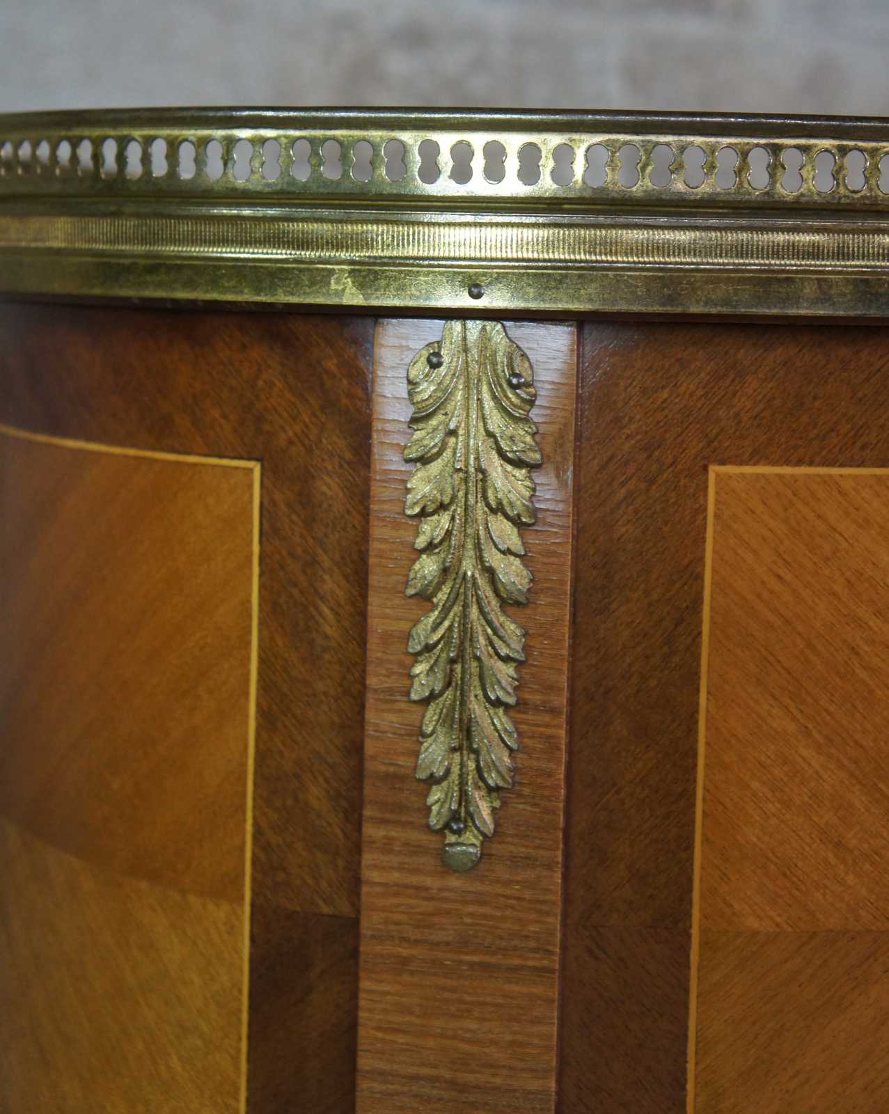 An elegant pair of French Louis XVI style kidney bean shaped bedside tables or commode chests, circa 1940s. Made from walnut with a nice matchbook veneer, brass ormolu mounts, inset marble tops and a brass gallery. Each chest features three drawers and is supported by long cabriole legs. Made in Spain