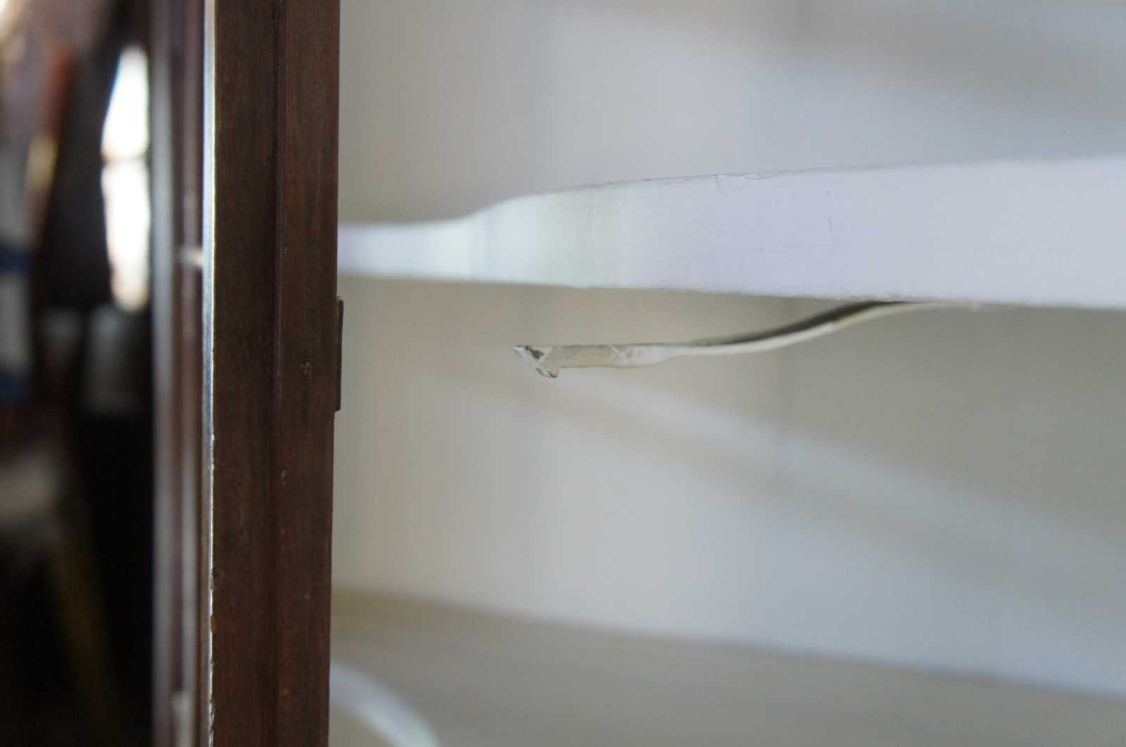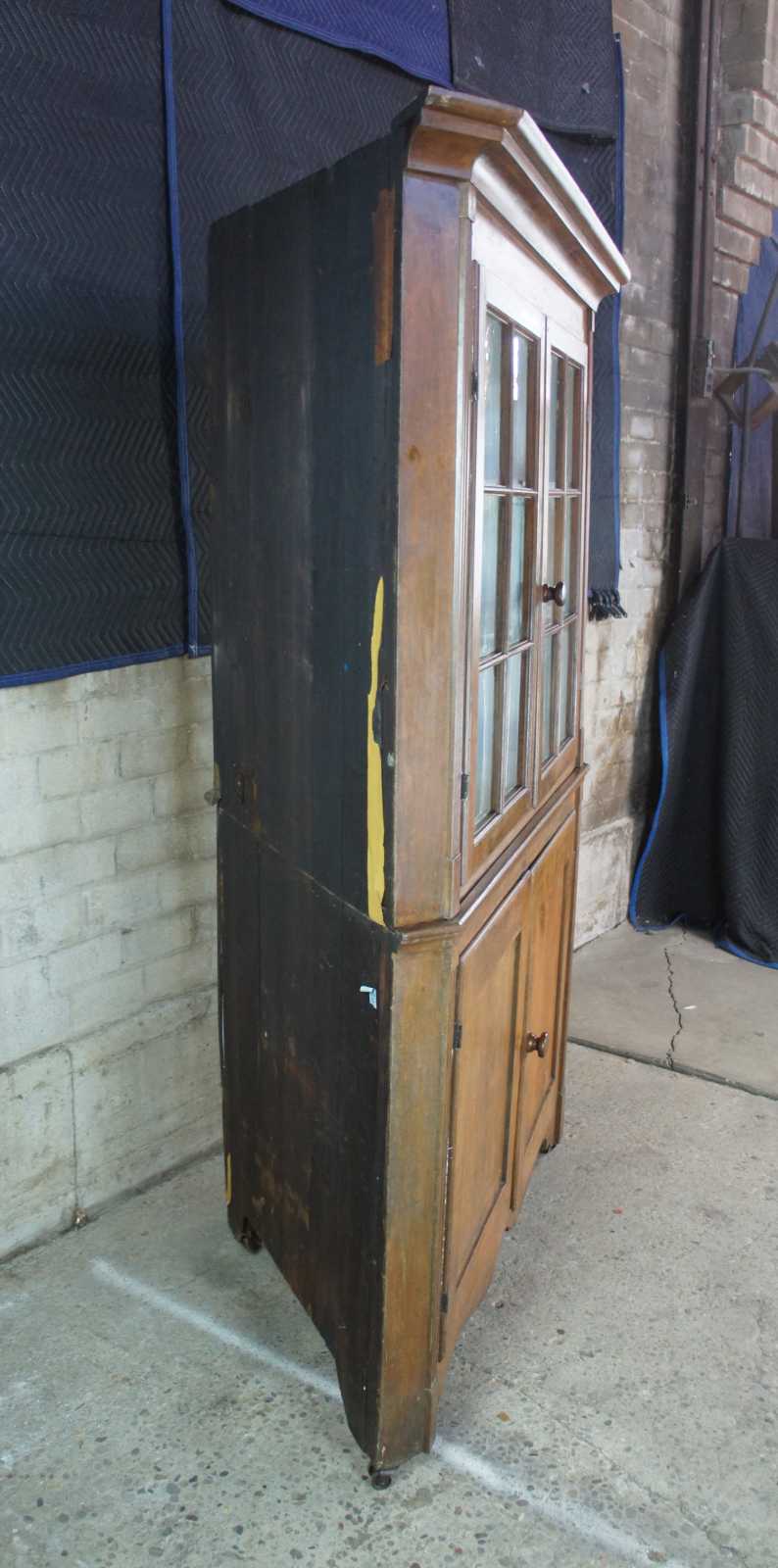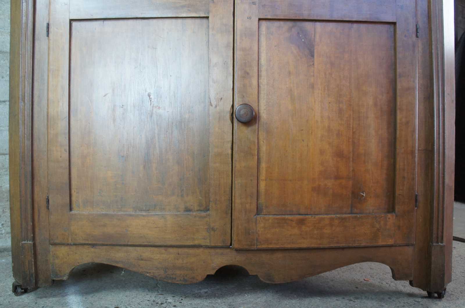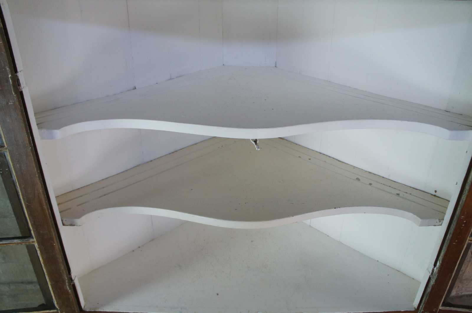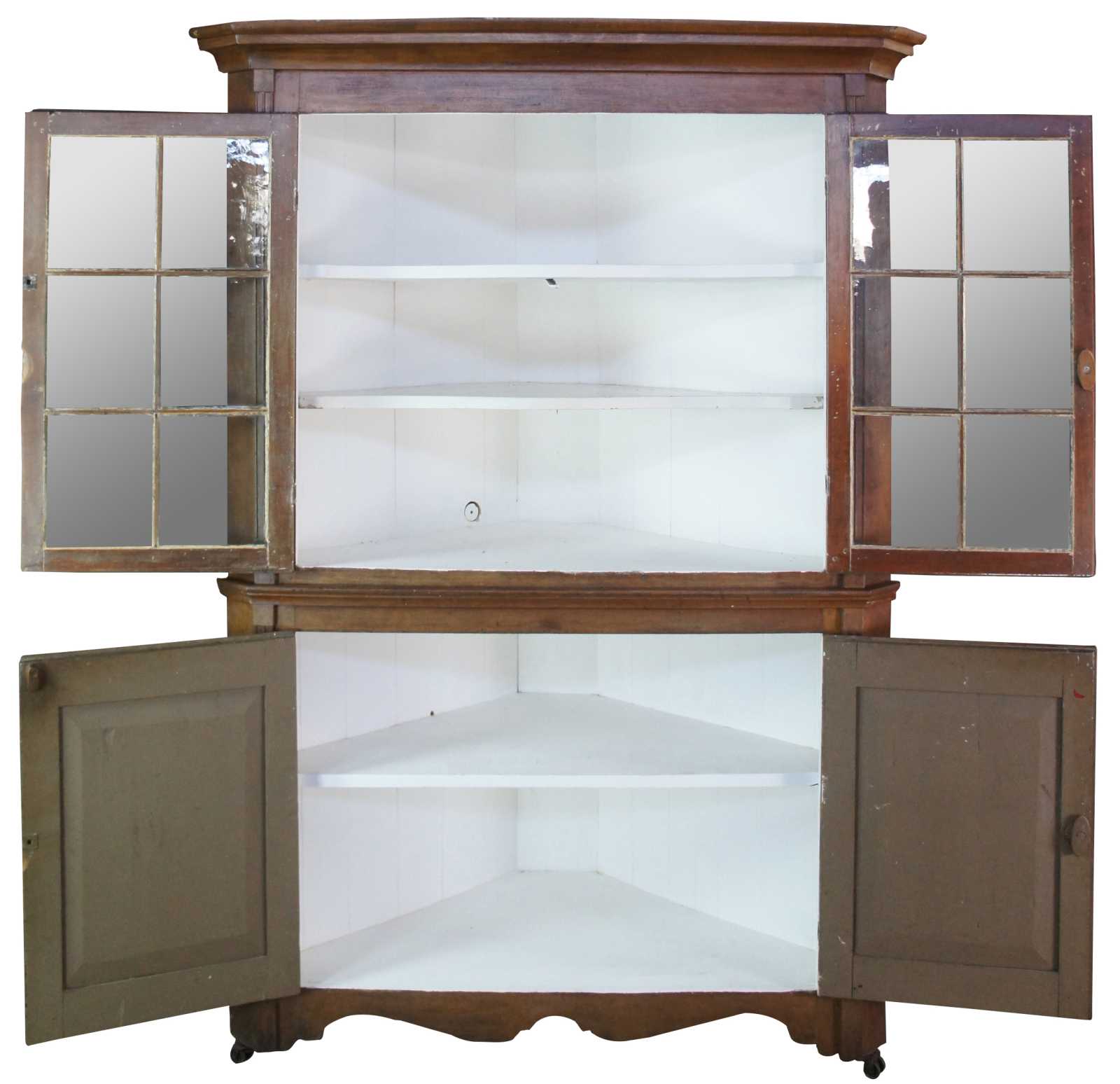 A stately late 18th Century Early American Pennsylvania corner cupboard or cabinet. Made of pine featuring triangular form with serpentine and fluted accents, original glazed wavy glass doors and double casters.