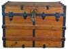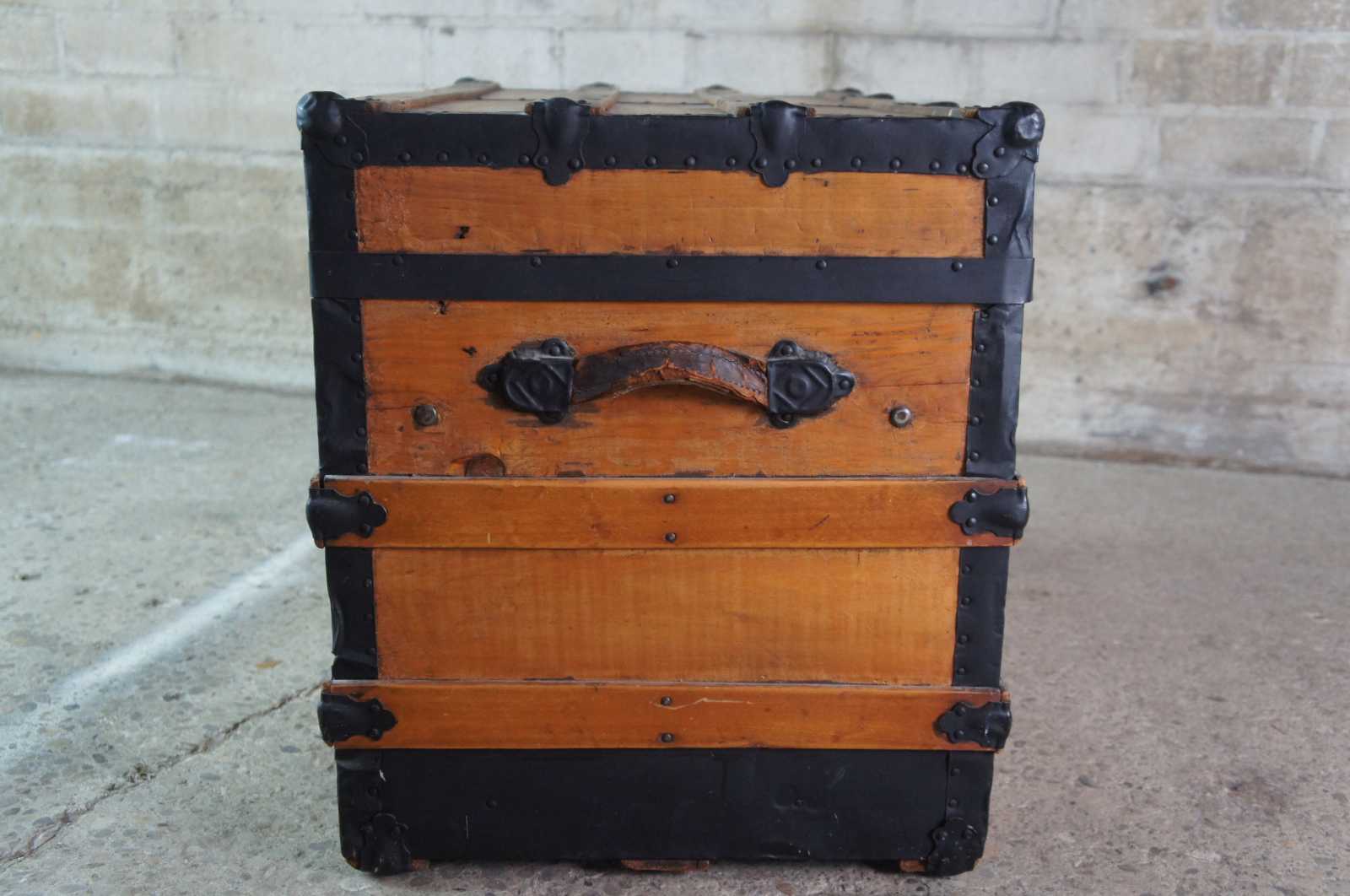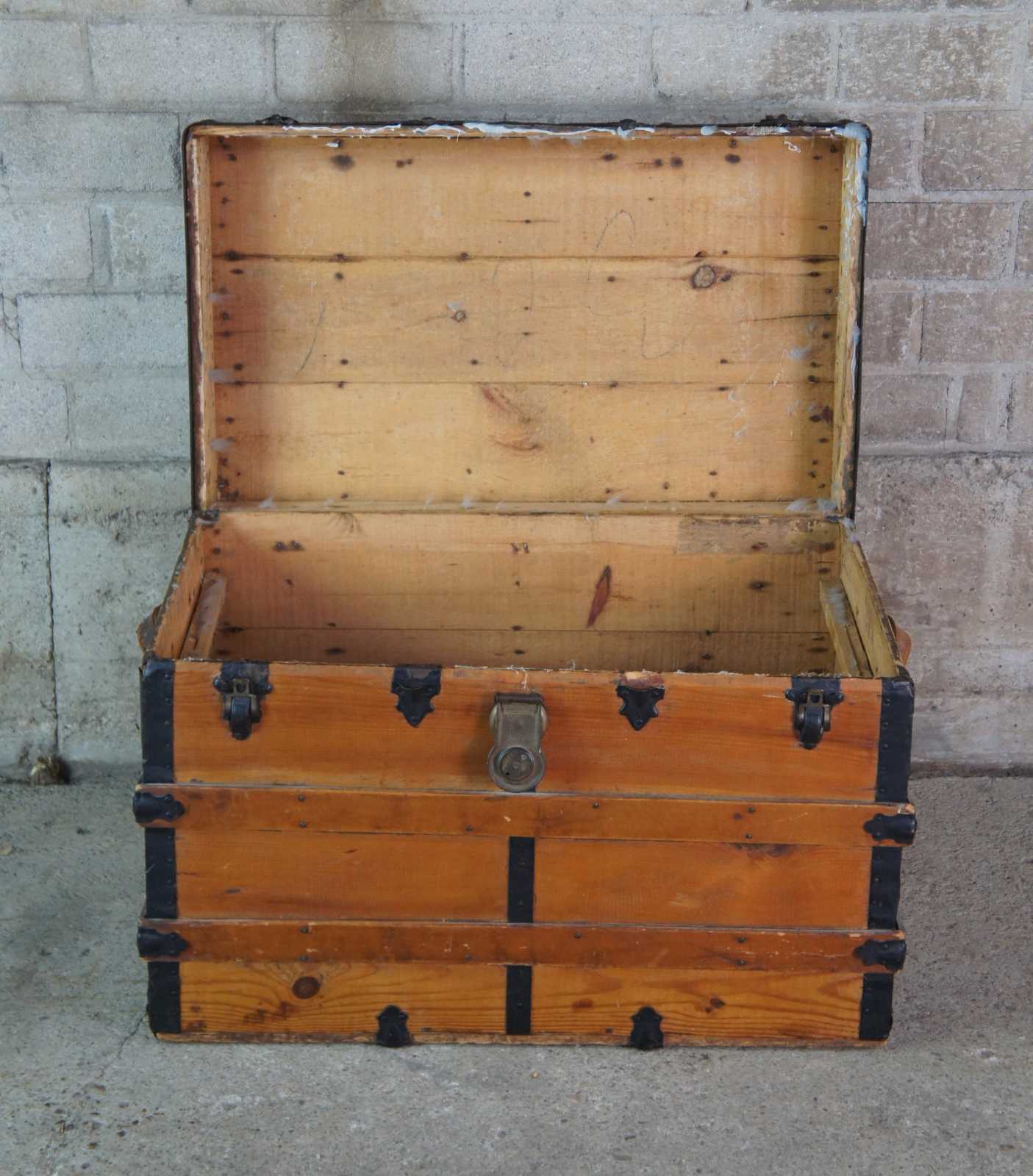 Antique Victorian steamer trunk or chest. Made of pine featuring metal and wood banding, and leather straps.