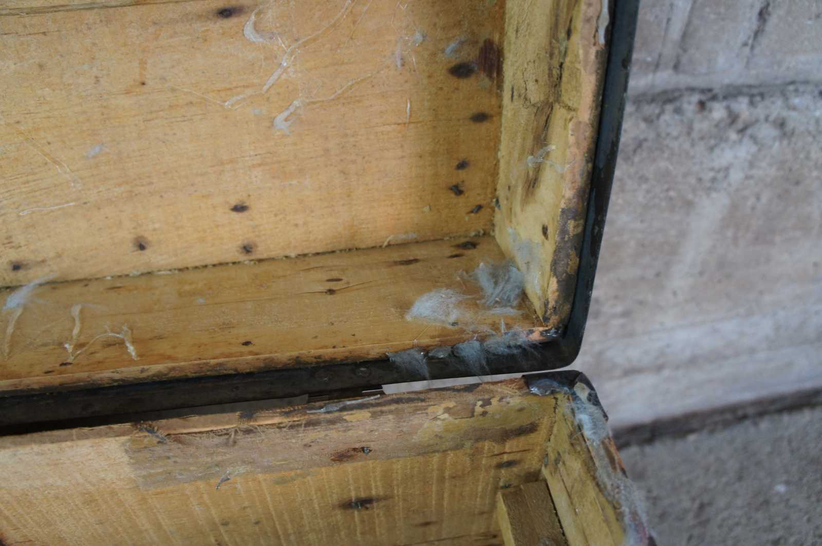 Good antique condition, wear and distressing commesnsurate with age and use, edge wear,scuffing, dents, residue left from old lining, no key.