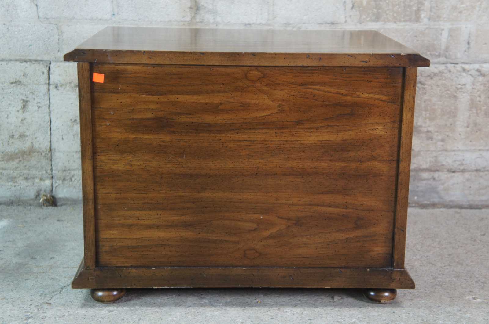 Vintage Hispana Drexel Heritage low chest, nightstand or side table, circa 1960s. Made of walnut featuring two drawers with paneled fronts, brass knocker pulls, and turned bun feet. Item number 493-312-6.