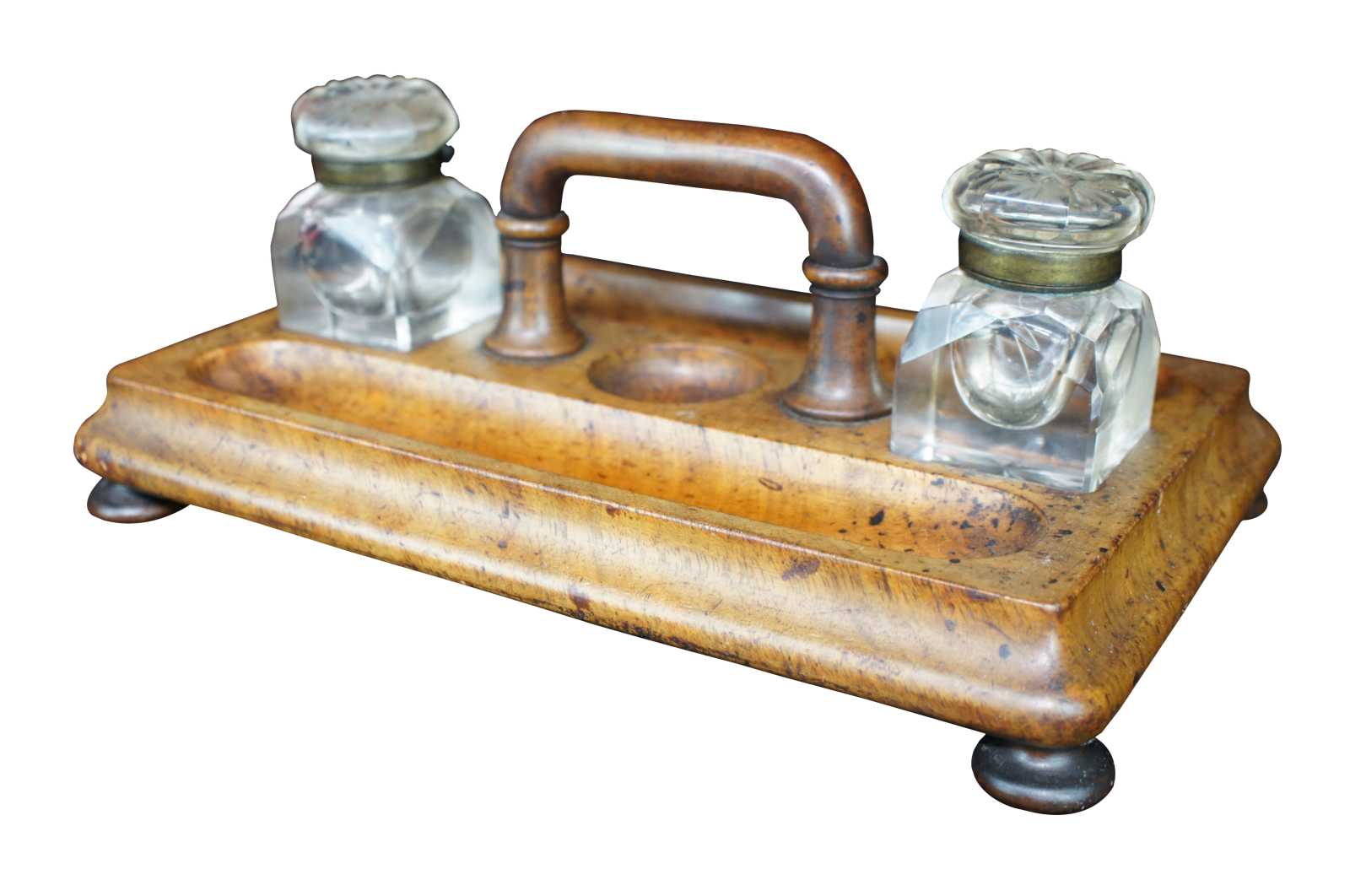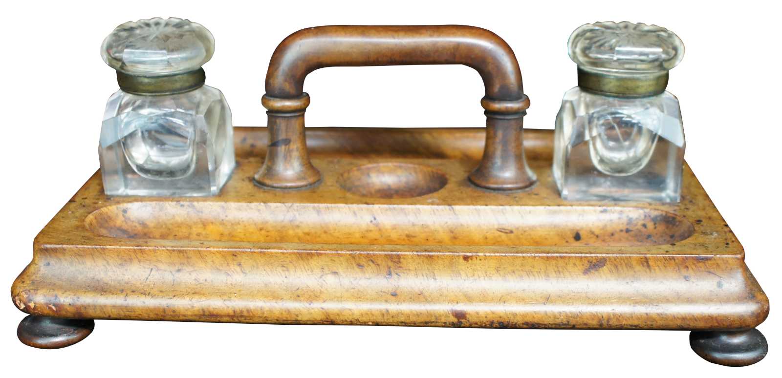 Early 20th century Edwardian Era Ink Stand. Made from walnut with a rectangular form and centrally located handle flanked by two crystal cut inkwells. The beautiful caddy is double sided with trough shaped molded pen holders. The stand is supported by hand turned bun feet. An exquisite addition to any desktop.
