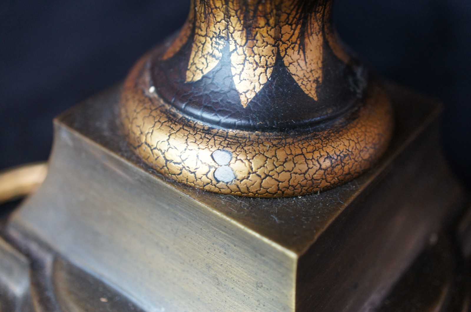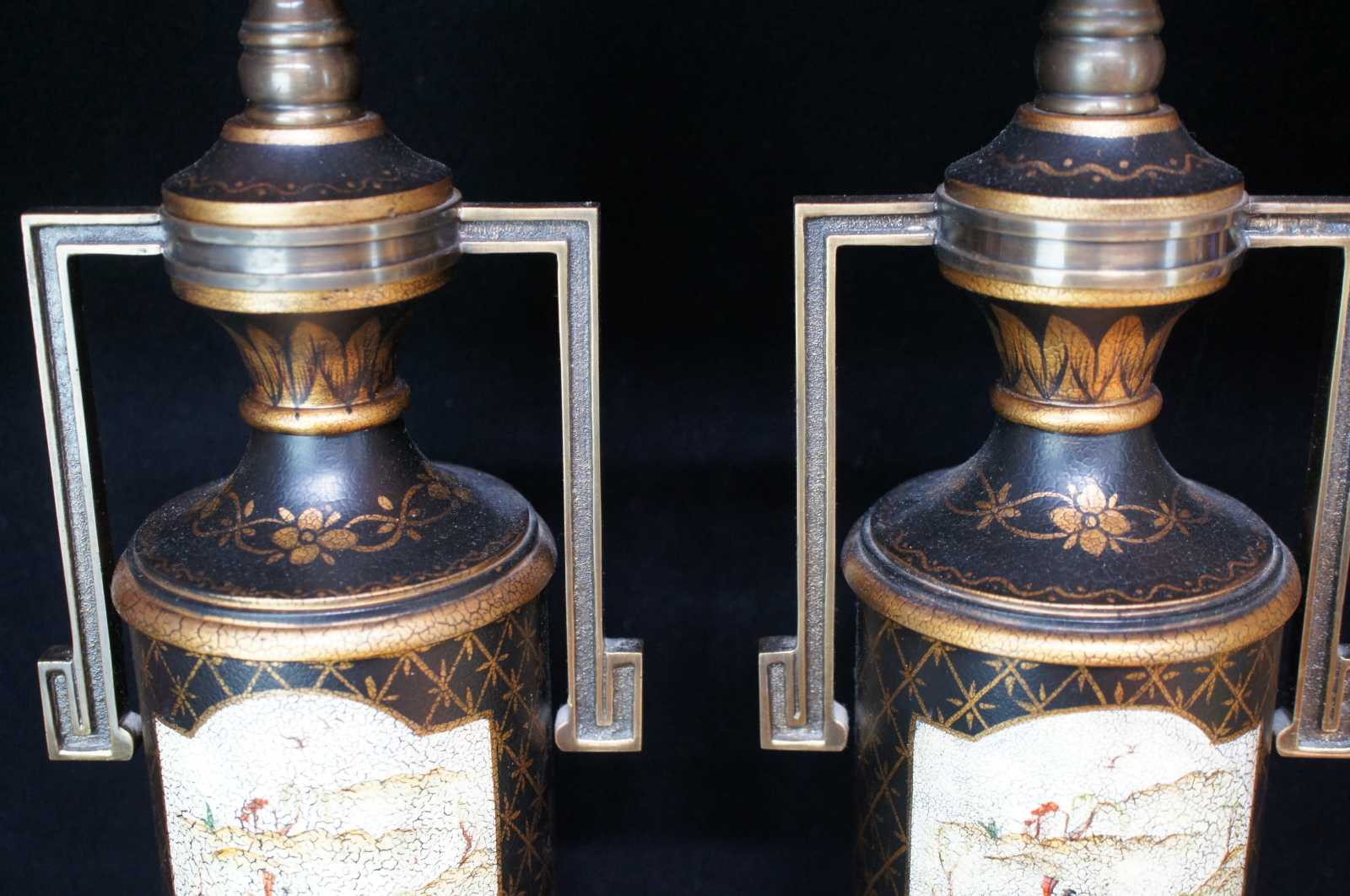 Pair of two Asian Dynasty handled trophy urn table lamps featuring a distressed crackled or crazed finish with pagoda landscape scenes. Model #L011B, Dated November 2001, RL-194.