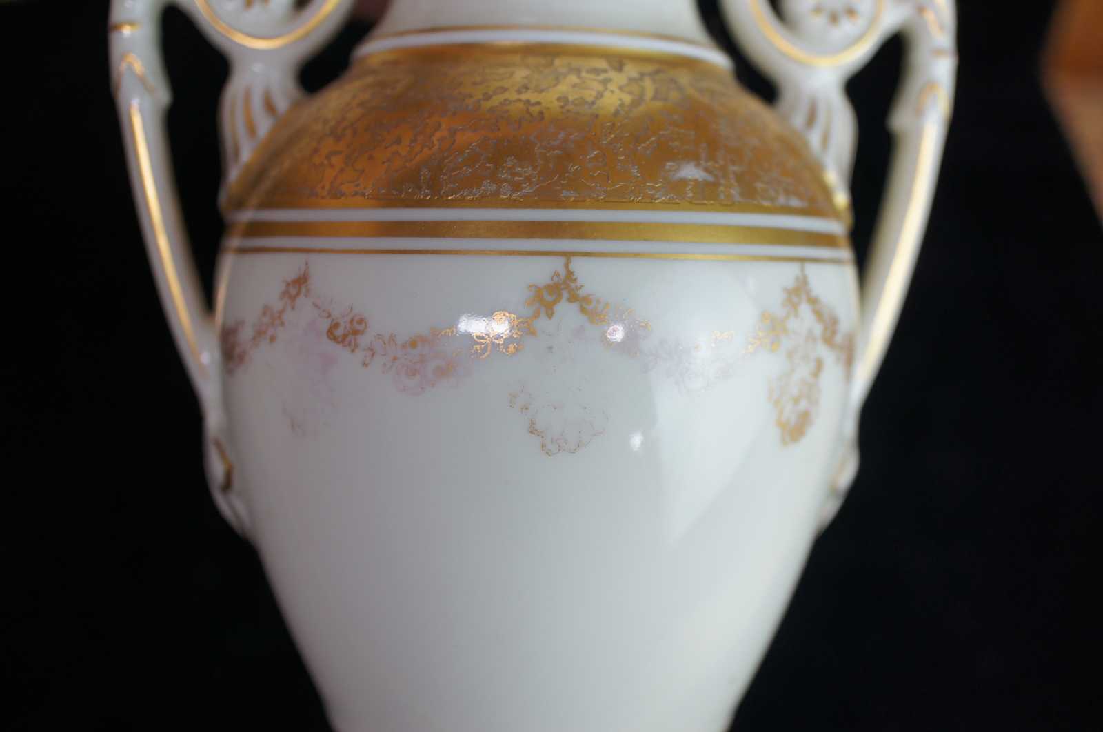 Vintage mid century porcelain trophy urn lamp featuring ornate handles and neoclassical gold details.