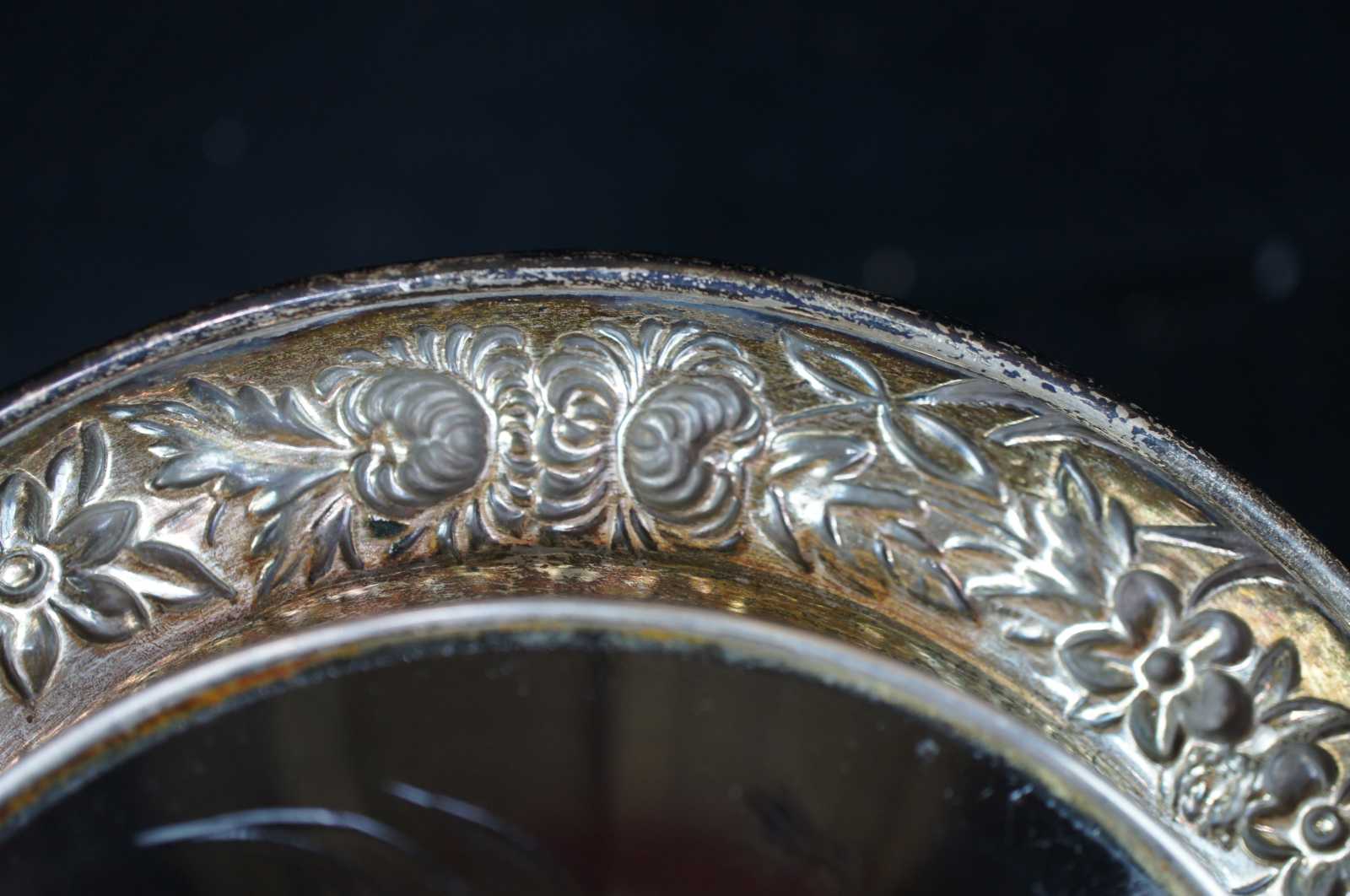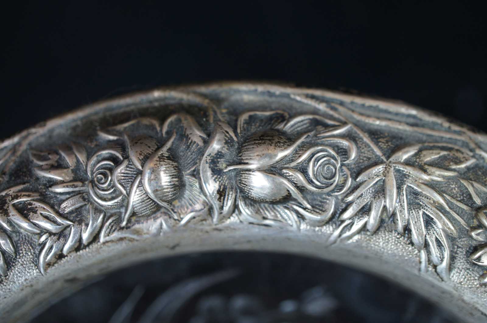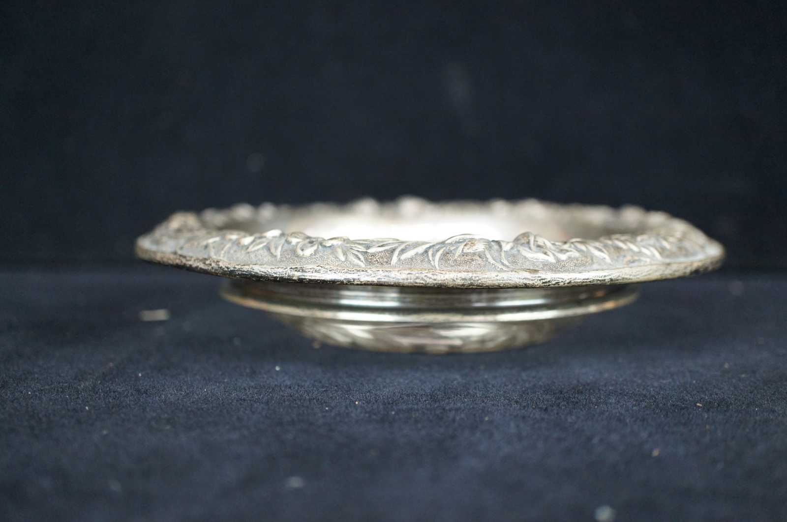 Antique repousse sterling silver and glass dish or bowl featuring floral etchings and high relief.