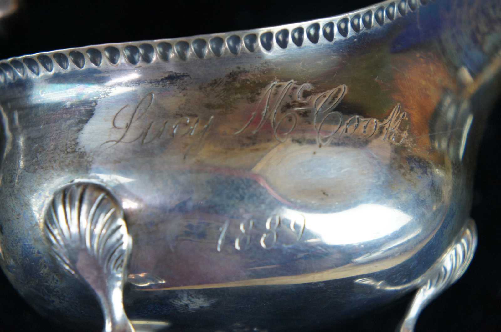 Ornate antique Georgian style A. Newsalt creamer, pitcher or gravy boat featuring elongated spout with patterned edge, serpentine handle, and angled hooved / footed base. Engraved Lucy McCook 1889. Marked Sterling 925 164 on base.