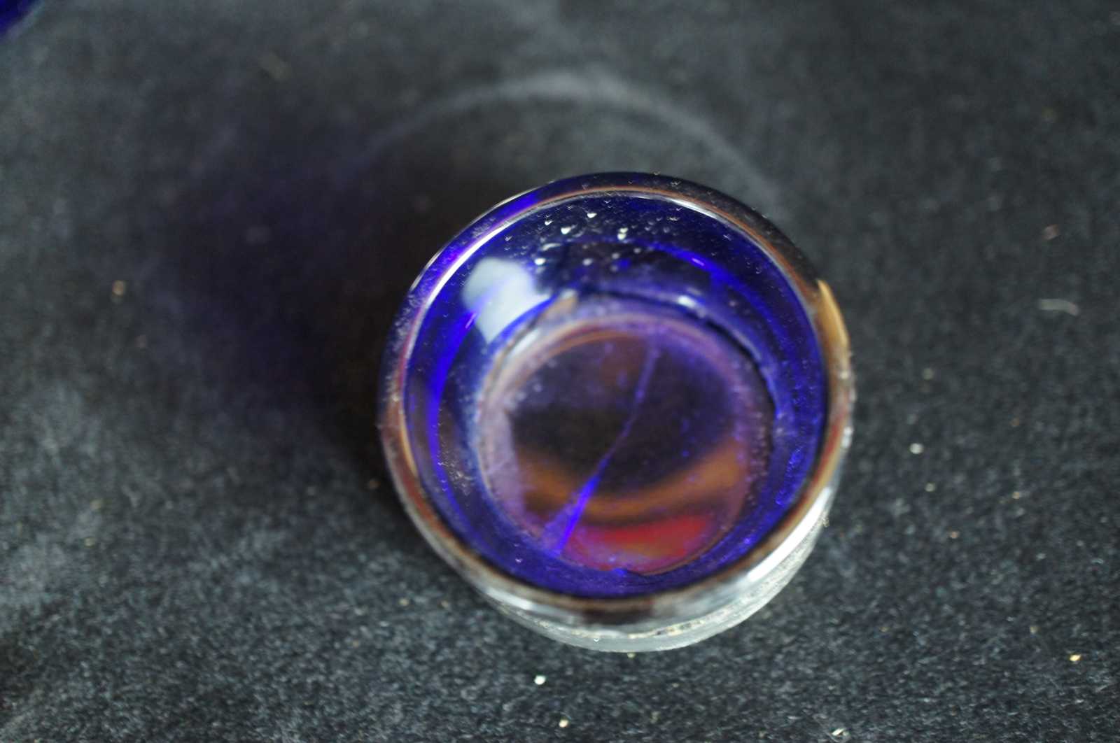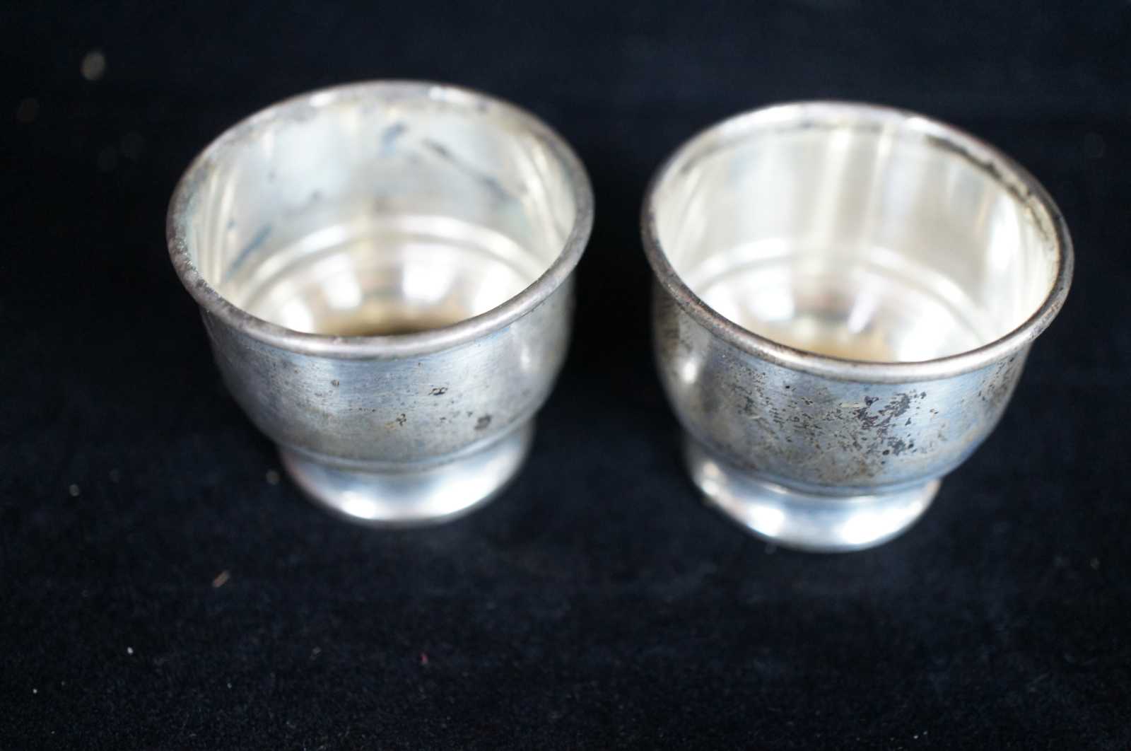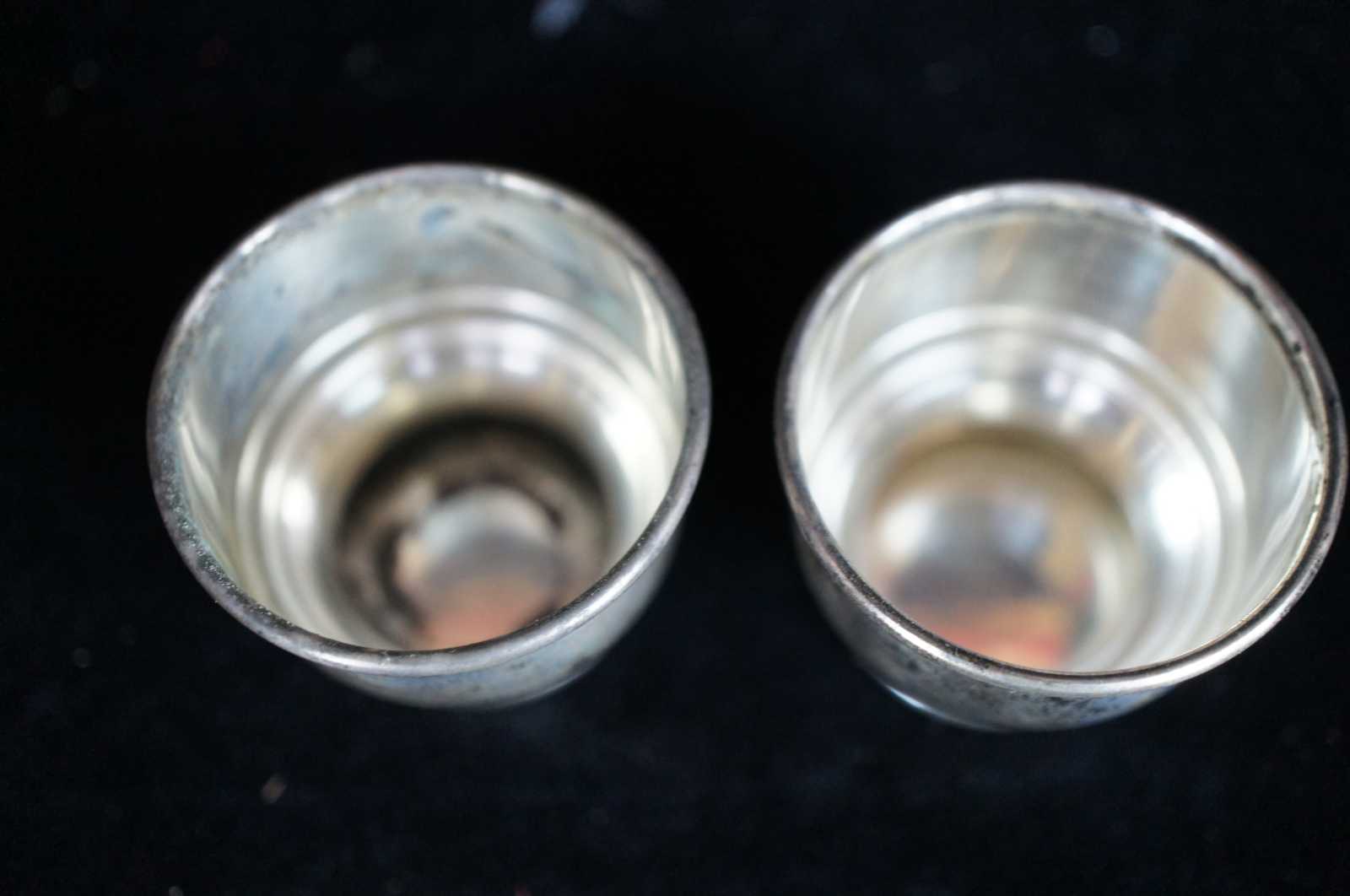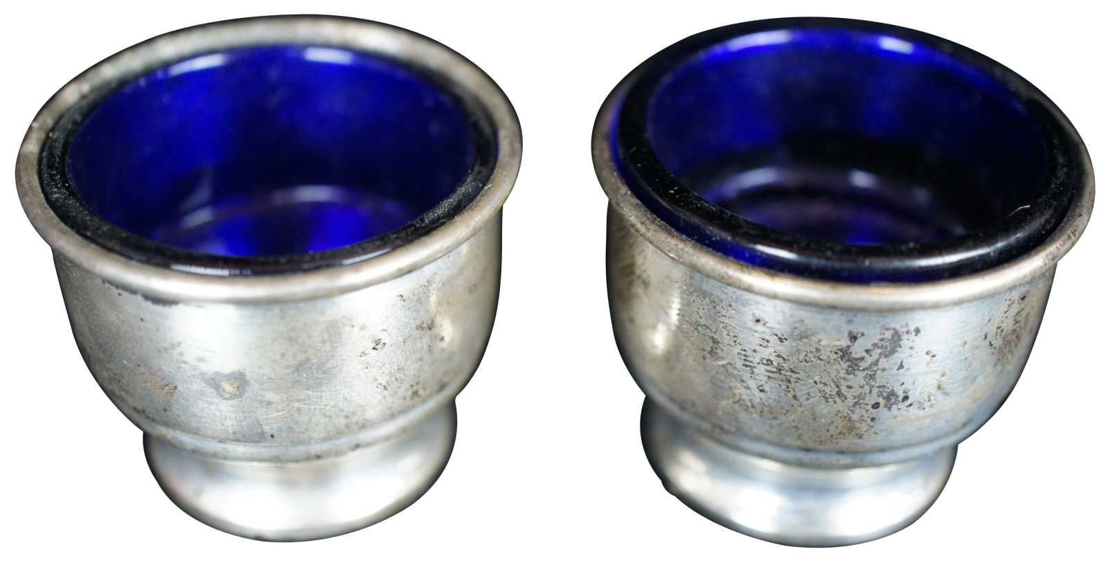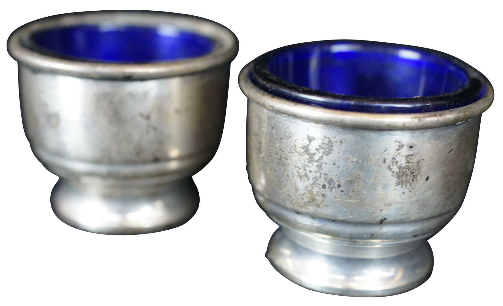 Two antique sterling silver salt cellars featuring cobalt glass inserts. Marked -W- on base.