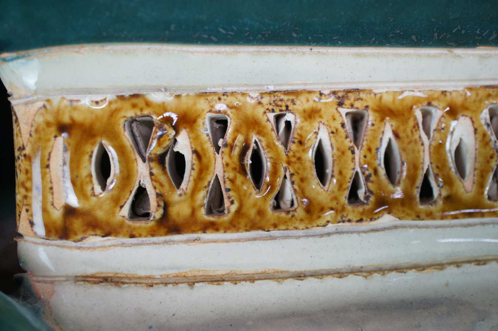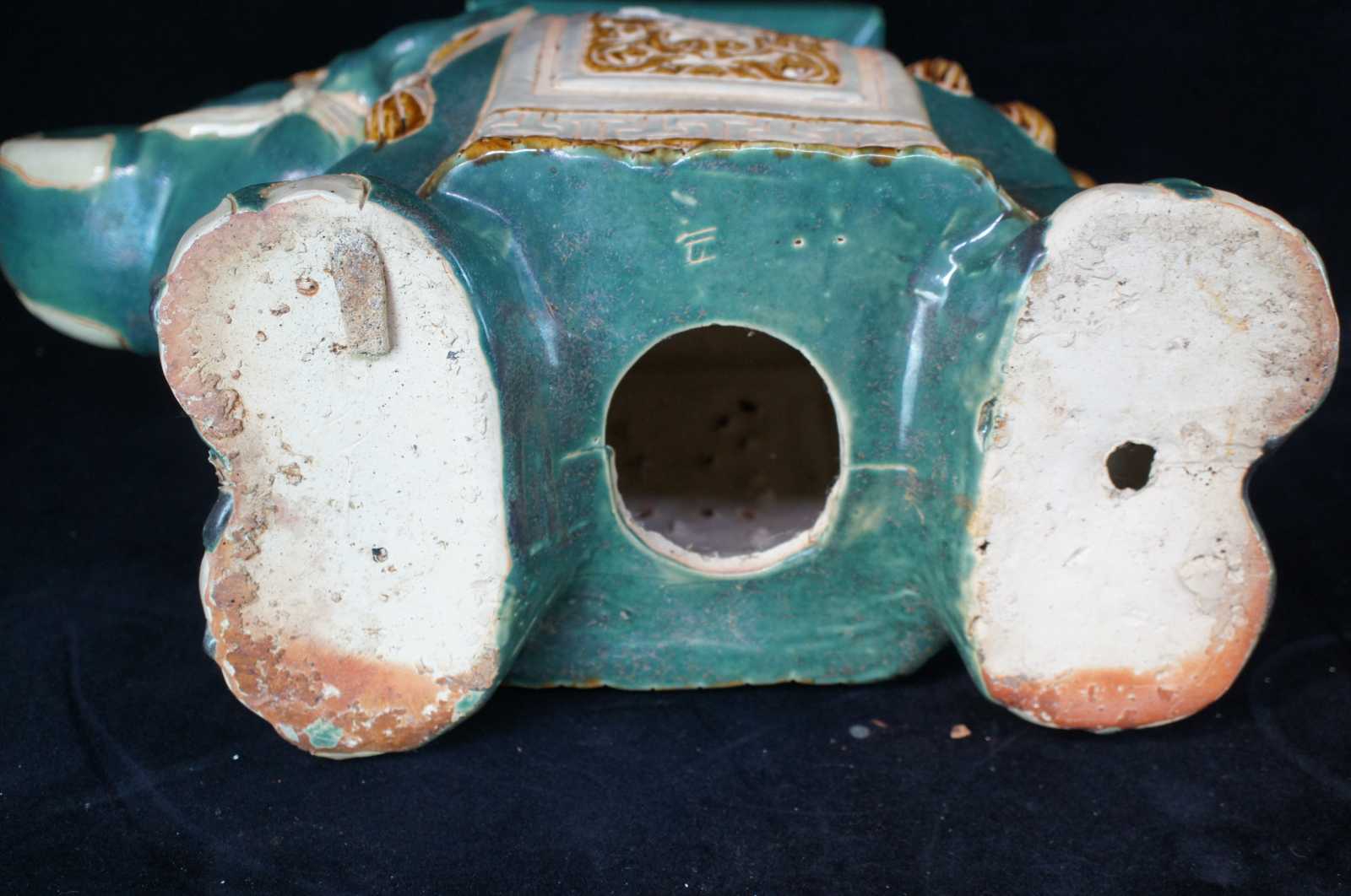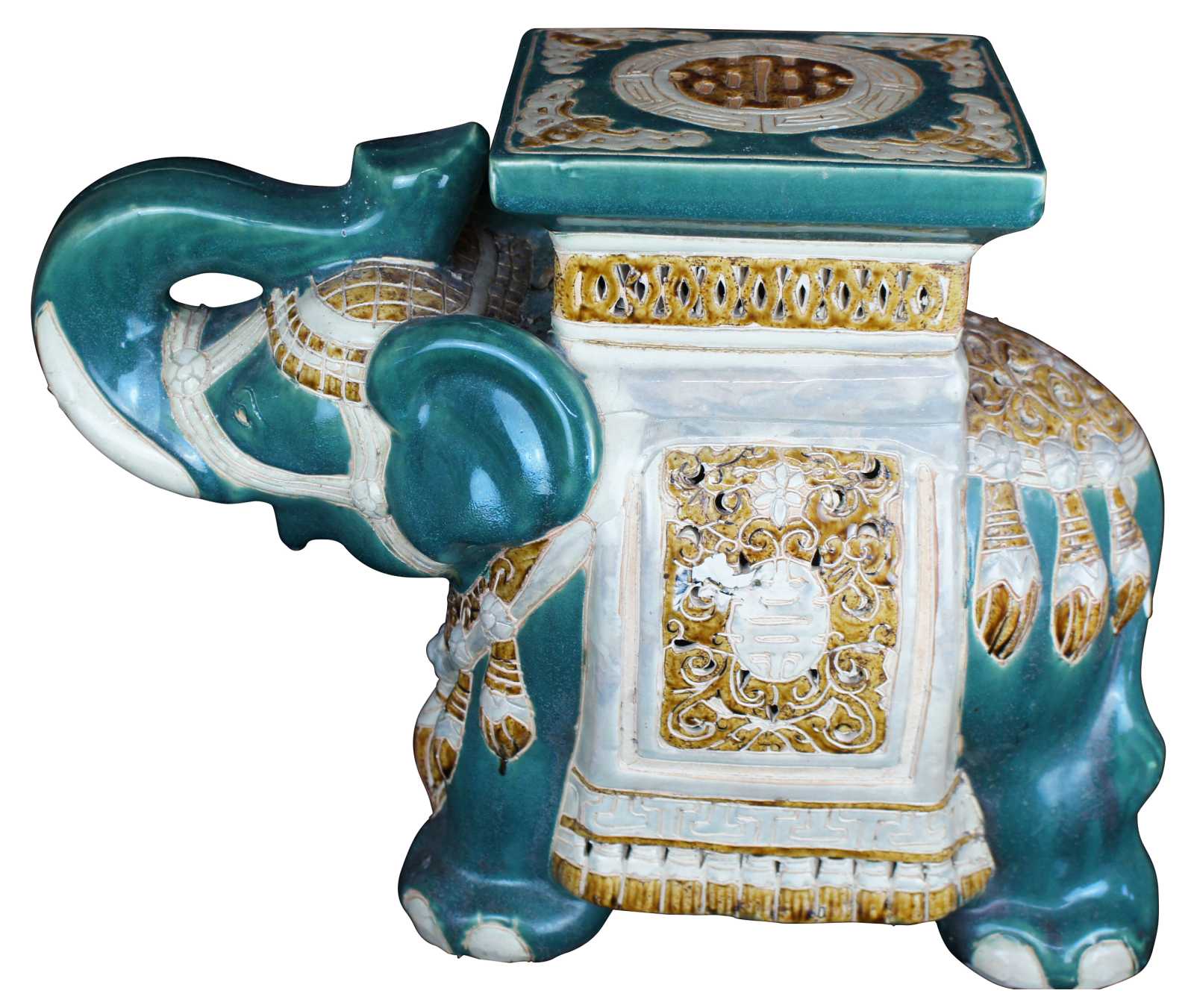Vintage Chinese ceramic lucky elephant garden stool, plant stand or side table featuring glazed finish with pierced accents and bat design.
