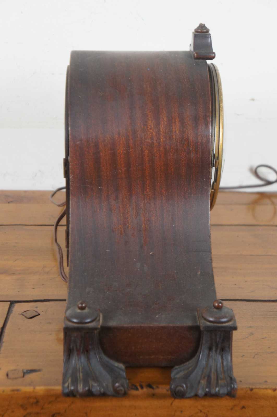 Antique 1933 Art Deco Herschede electric humpback mantel, hall or parlor clock with elegant inlaid mahogany and carved accents, gold tone ormolu face, and Westminster chimes.