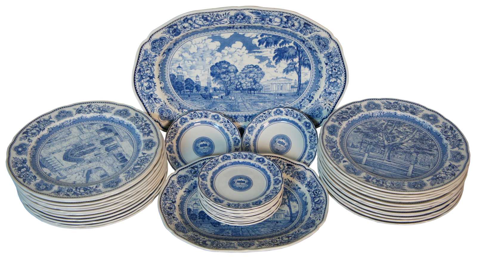 Antique 38 piece set of Wedgwood collegiate china showing the buildings of Yale University. Set matching platters in two sizes, a set of 12 matching bread plates, and 24 dinner plates comprising two each of twelve different patterns.