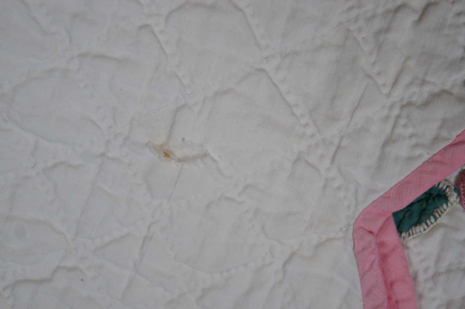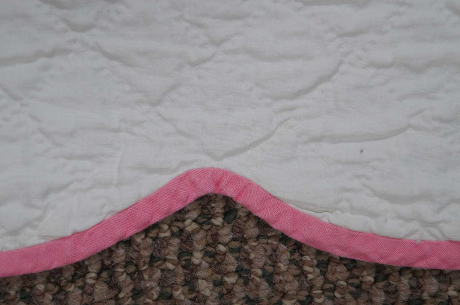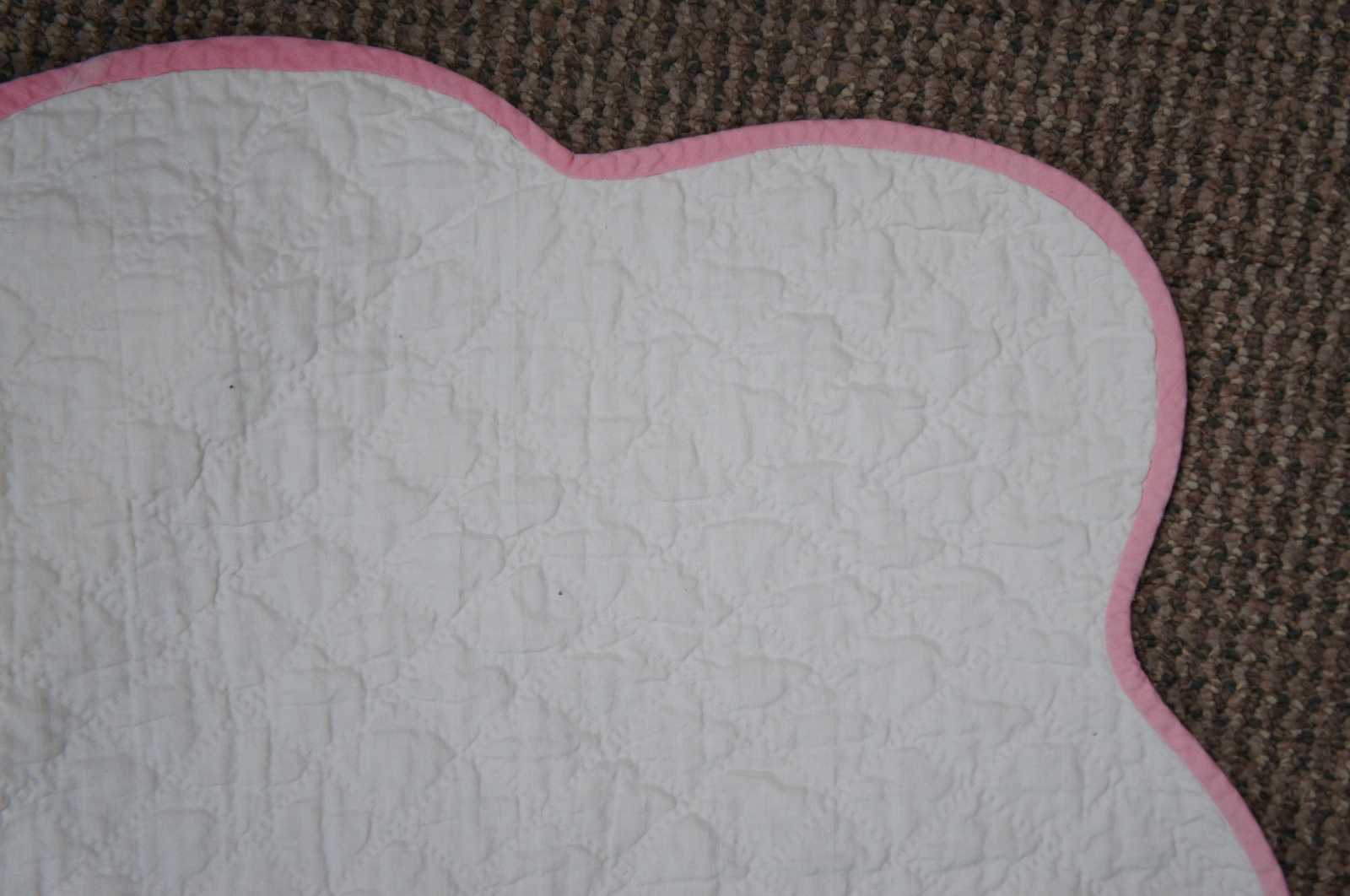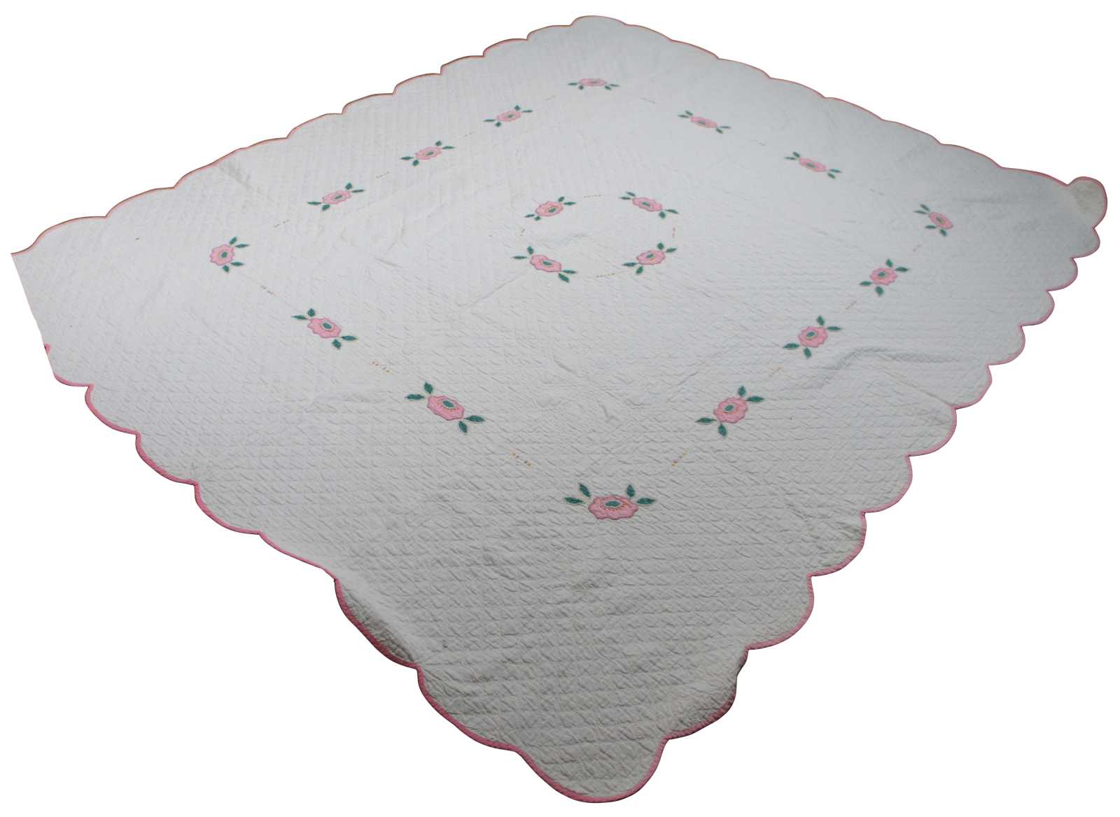 Antique hand stitched white quilt with scalloped edge and a subtle design of applique pink flowers.