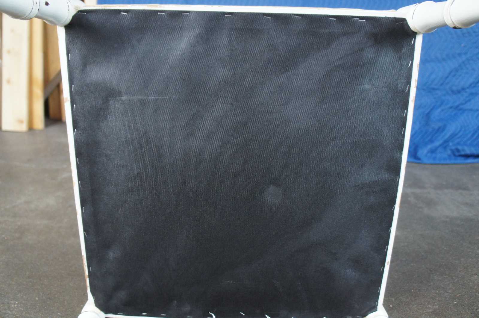 Vintage Ballard Designs square form ottoman or foot stool. Features a white distressed finish allowing the natural understones of the wood to be seen trhogh. Features turned legs and beige fabric with double cording.