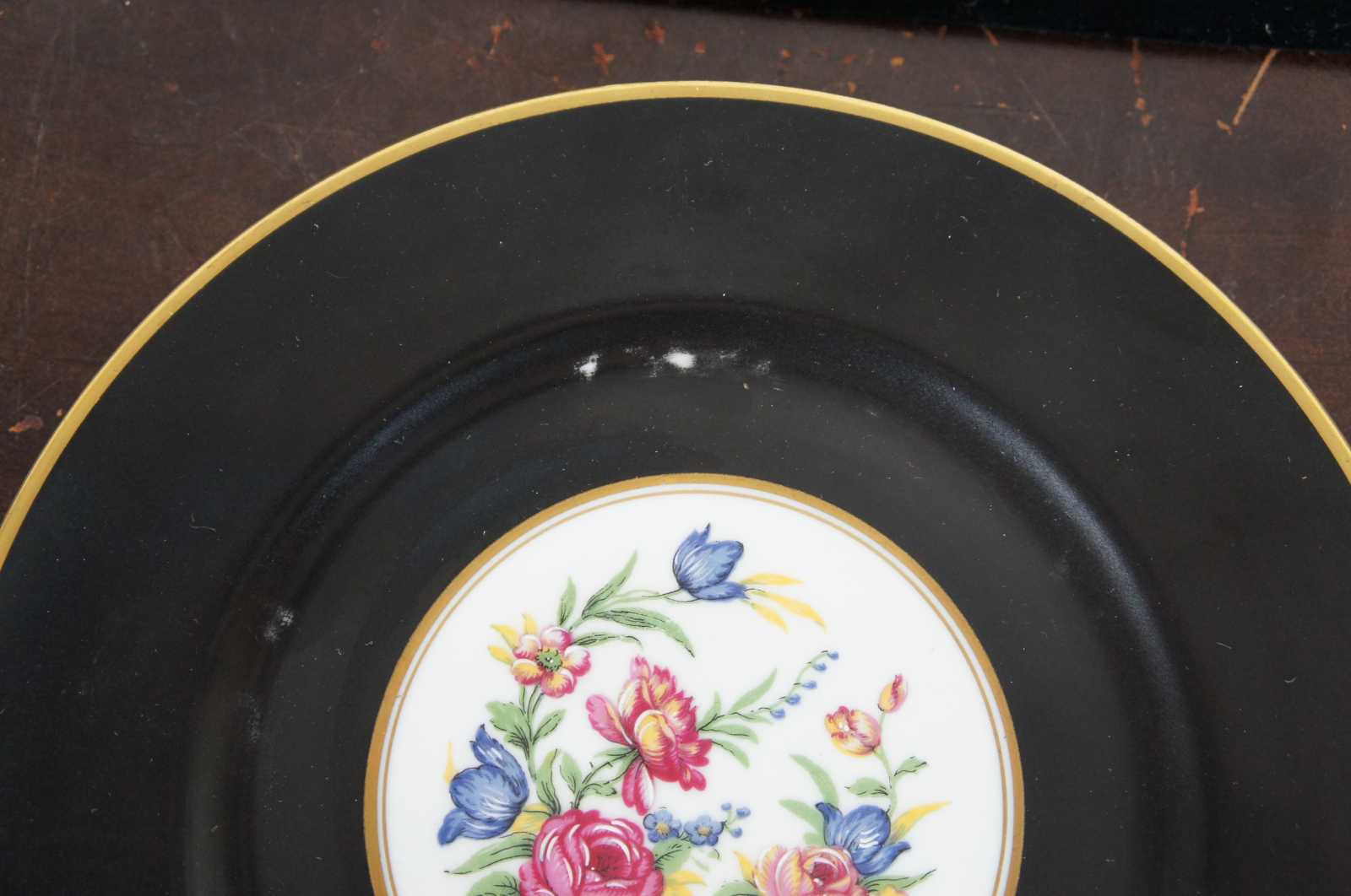 Set of eleven L. Bernardaud & Co aka B&Co Limoges porcelain dinner plates with matte black borders, floral center and gilded edges.
