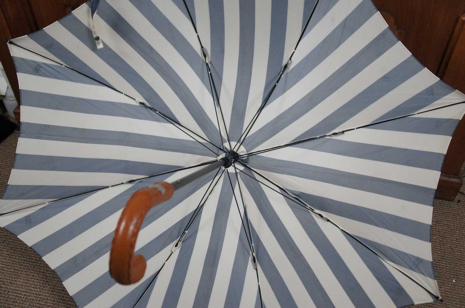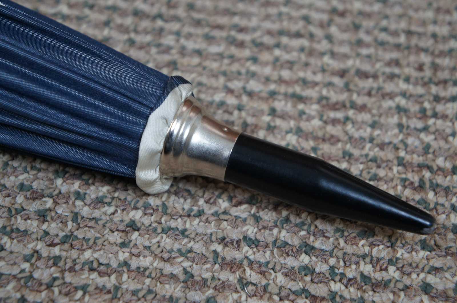 Vintage Luigi Borrelli blue and white chevron patterned umbrella with brown leather handle. Made in Italy.