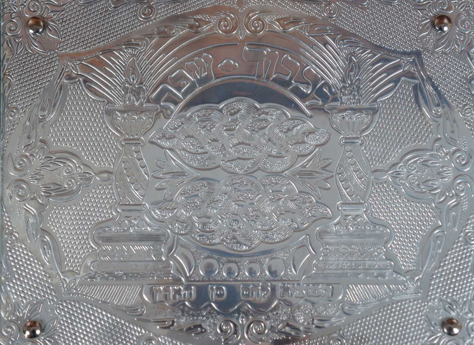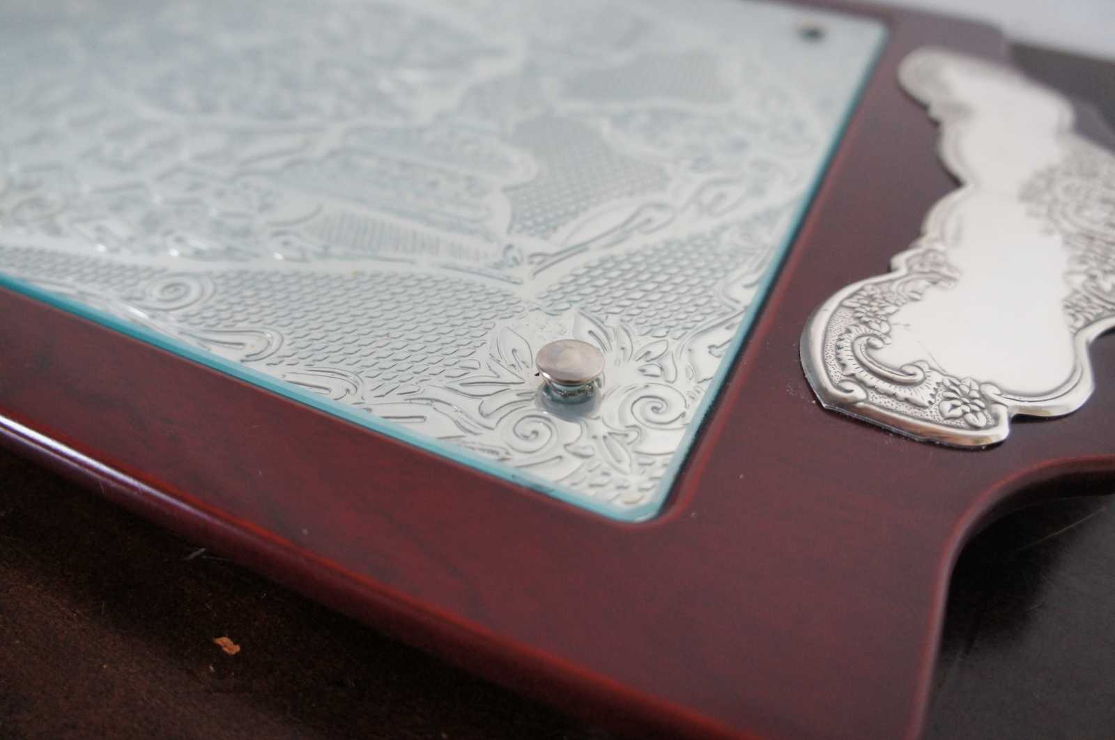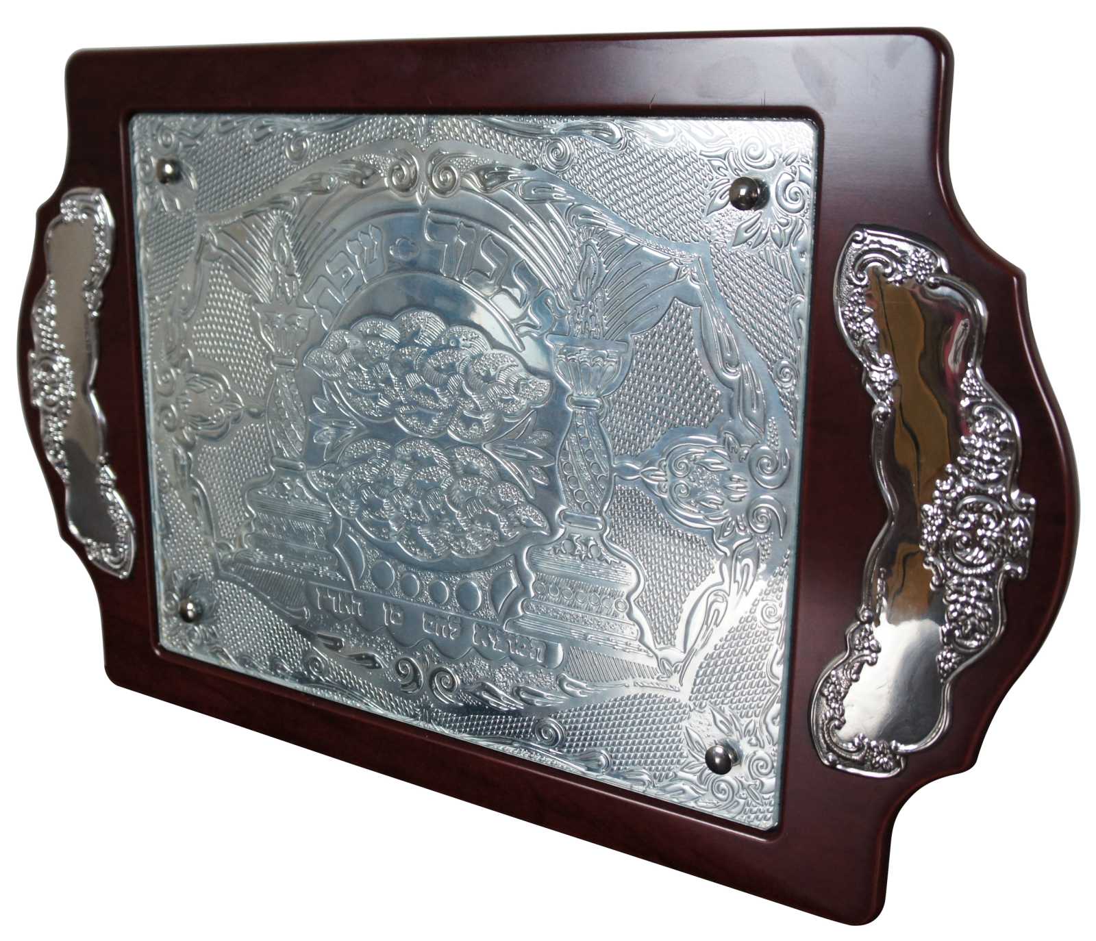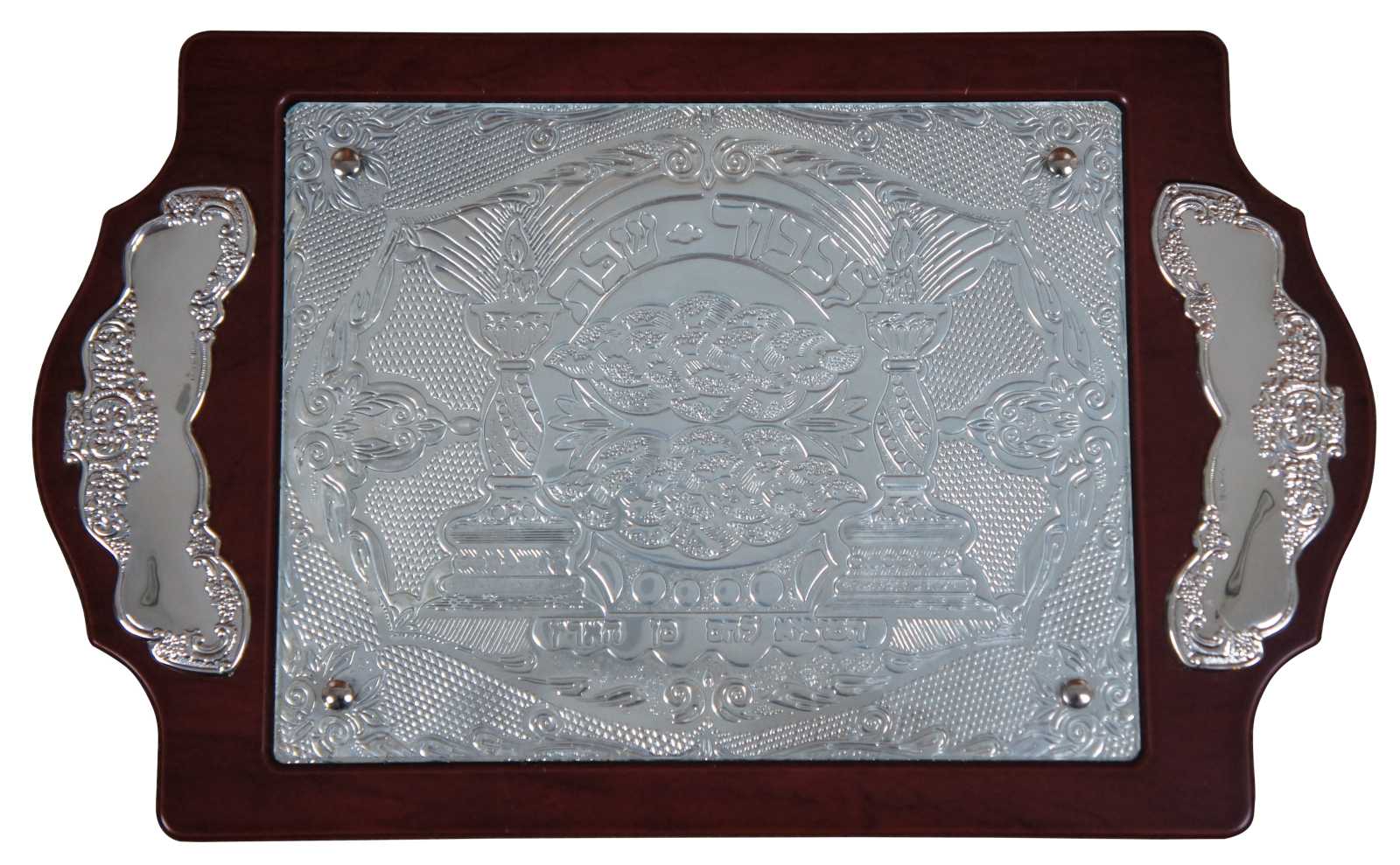 Large vintage footed mahogany, glass, and sterling silver .925 challah tray by Hazorfim silversmiths, elegantly paneled sterling silver art inlaid in the handles and the center, protected by a piece of glass secured with silver capped screws. The inlays are expertly engraved with flowers and textured designs around a central motif of two torches or candlesticks and challah loaves. Made in Israel. Includes original box. Hzorfim 77001.