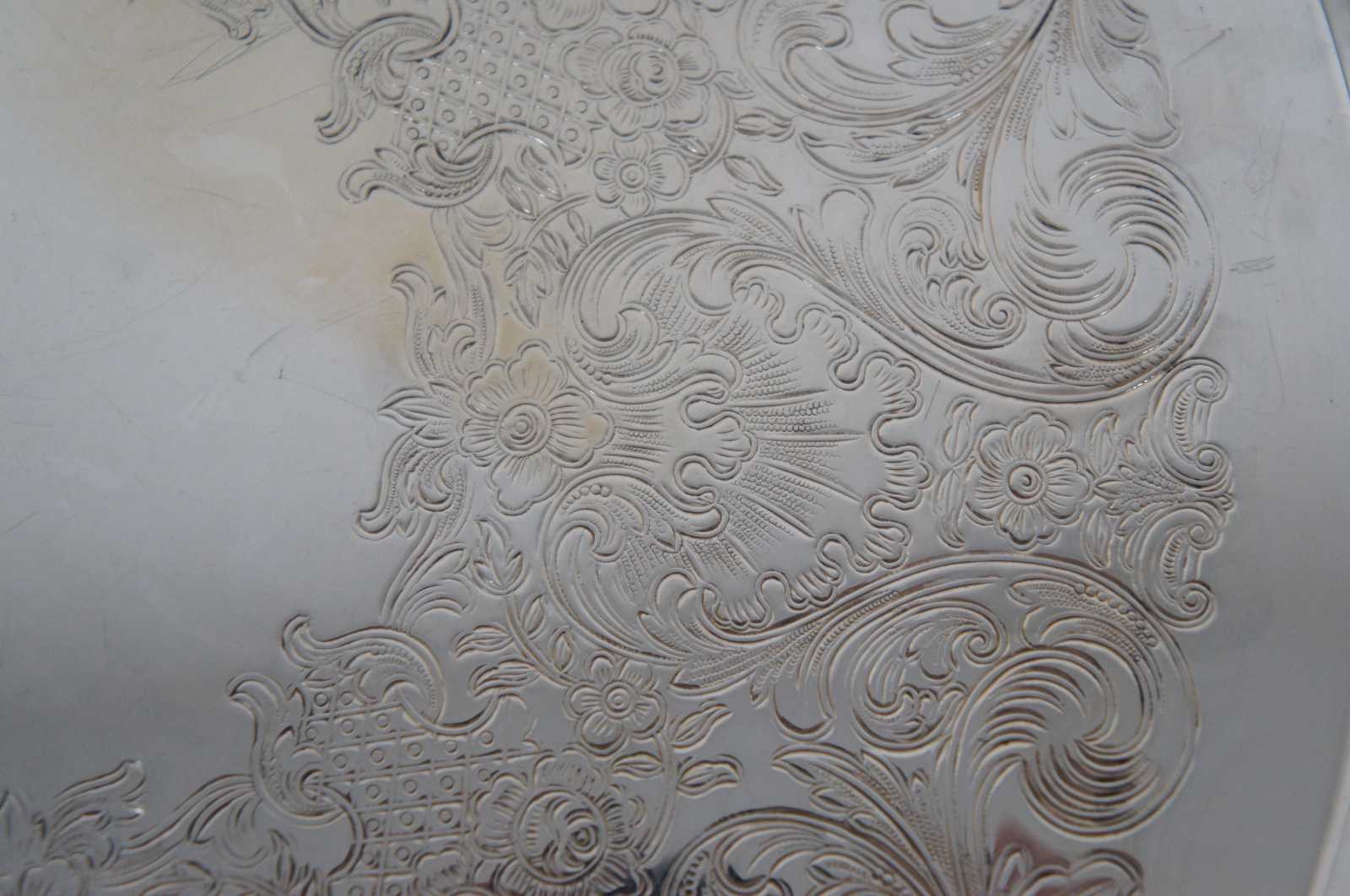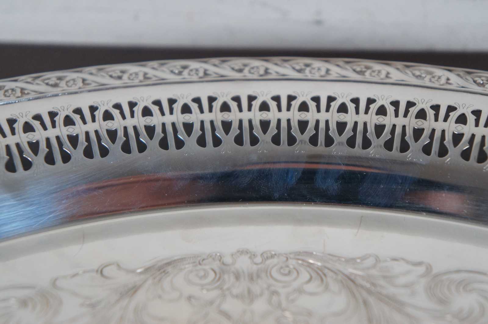 Vintage pierced edge round silver plate serving tray by William Rogers and Sons in the Spring Flower pattern.