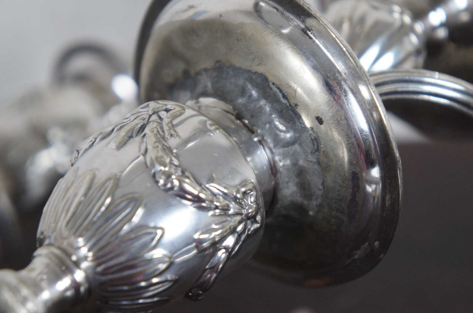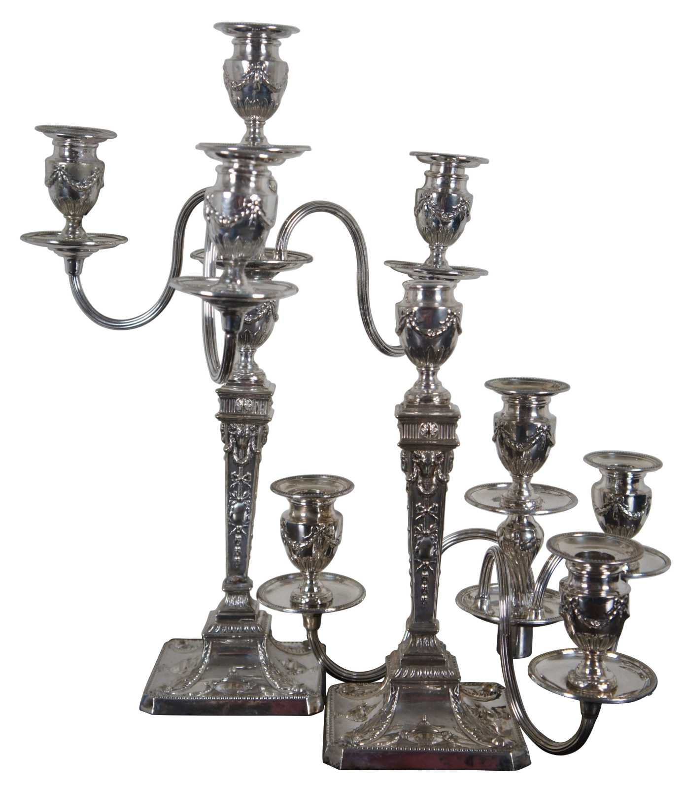 Antique Georgian silver plate three arm, four light candelabras, convertible to a single candlestick, crafted by William Hutton & Sons with ribbed, curving arms, rams heads, ribbons, and art nouveau / neoclassical accents.