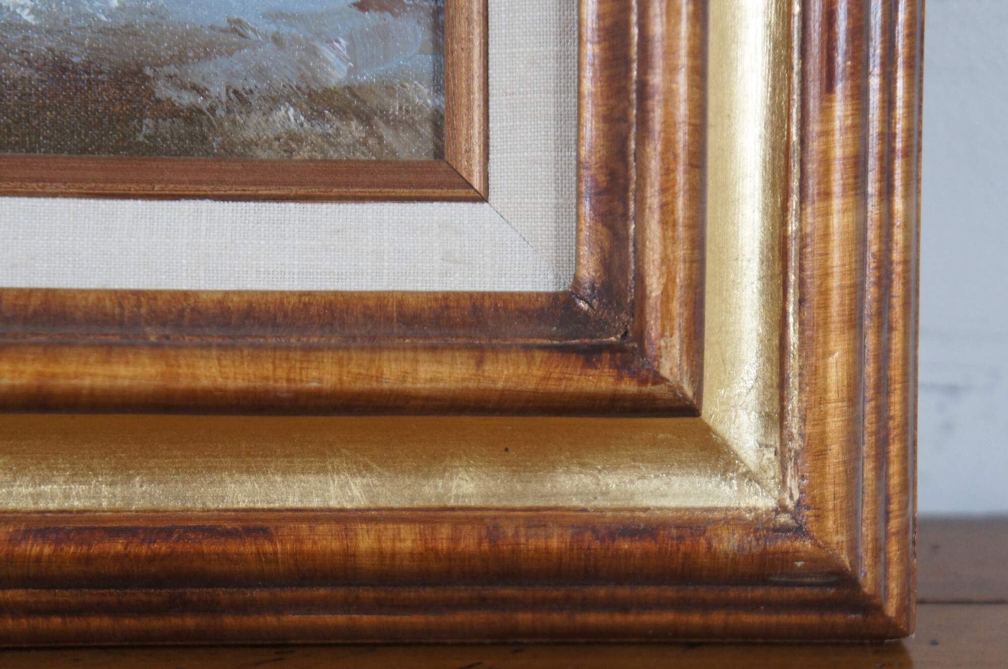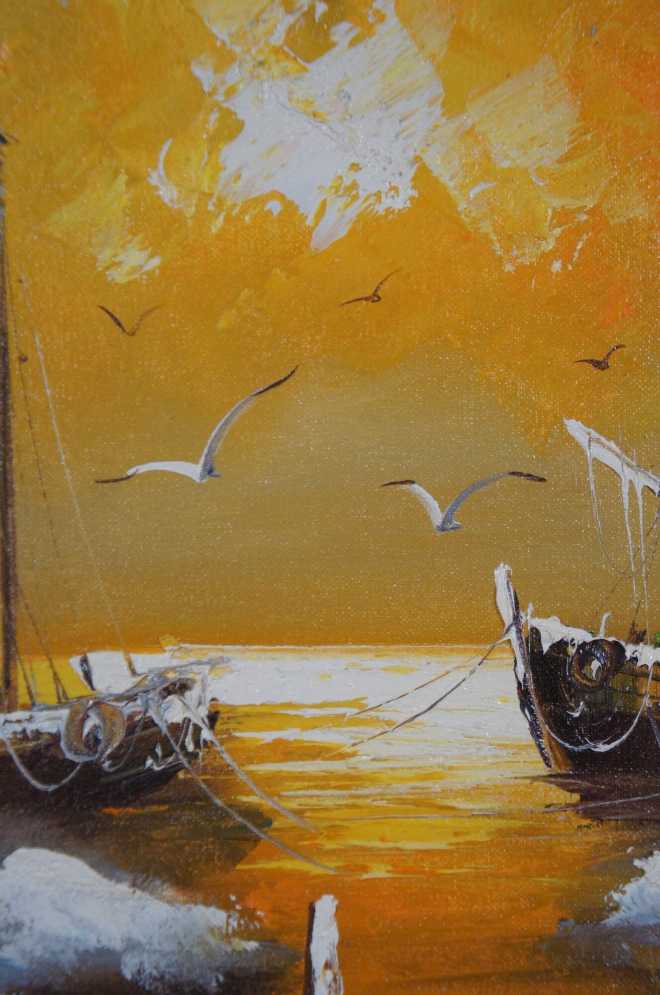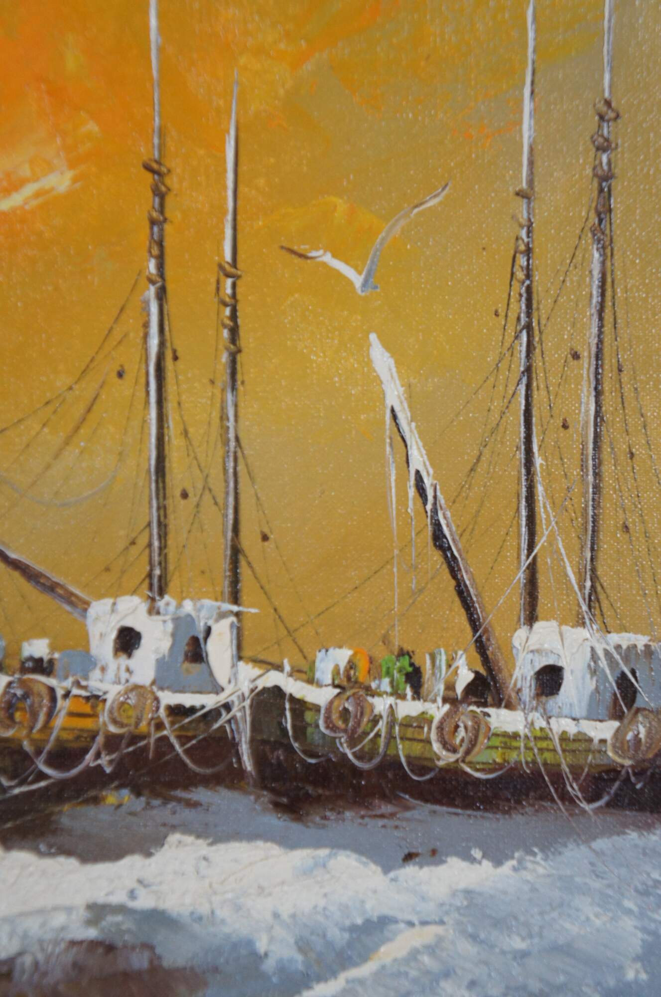 Vintage oil on canvas painting of three fishing boats floating in a bay / harbor with snow on the water, under a golden sunset. Signed De Marco / Demarco.