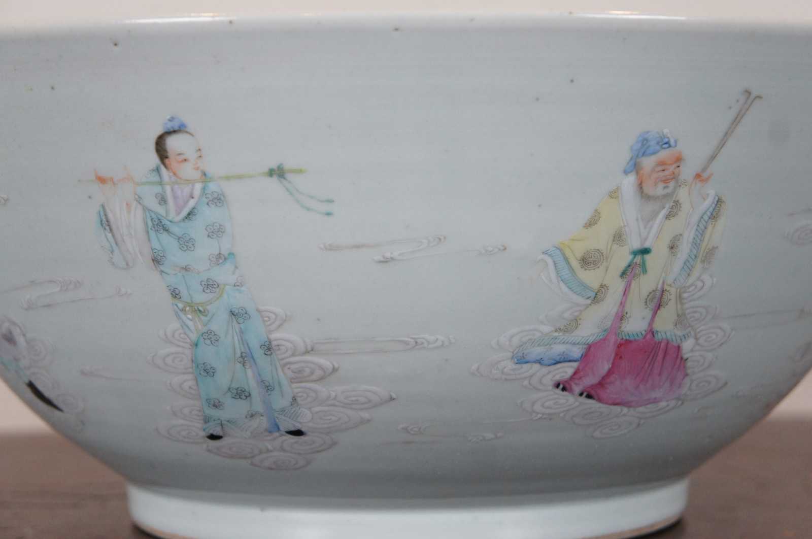 Antique 19th century Meji era, Japanese polychrom porcelain bowl, hand painted in the arita or imari style with the Seven Lucky Gods standing on clouds. “In Japanese folklore the Shichifukujin are the Seven Lucky Gods who may also be known as the Seven Gods of Happiness or the Seven Gods of Good Fortune. The seven gods are in fact of diverse origin as some are originally from Buddhism, some are from Shinto, and still others come from Chinese tradition.
