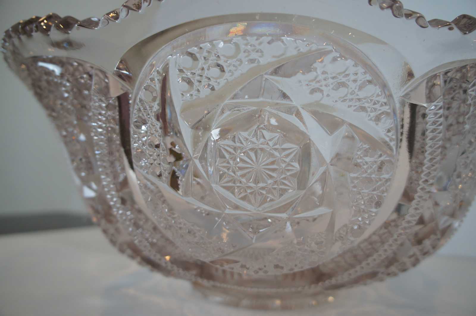 Large vintage pressed glass punch bowl with a scalloped sawtooth edge and geometric star pattern.