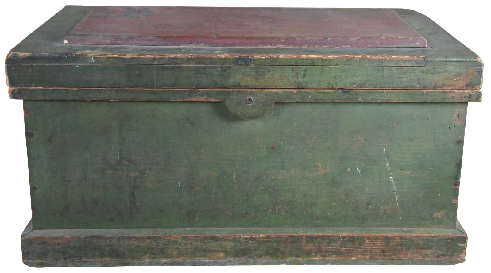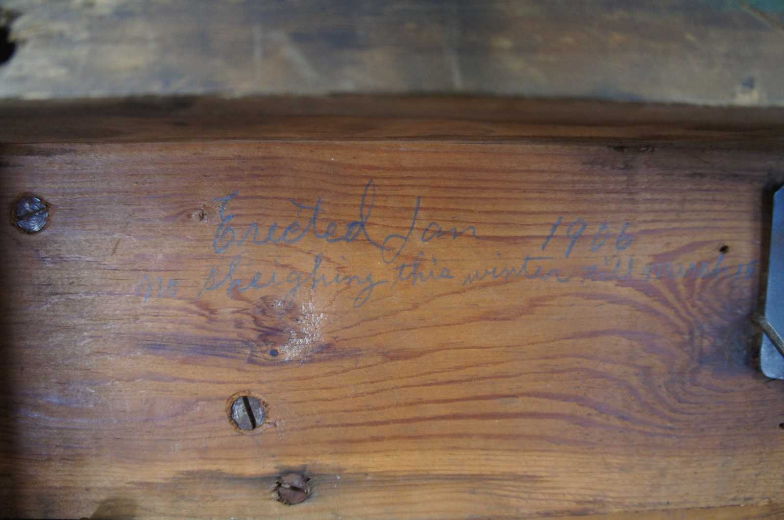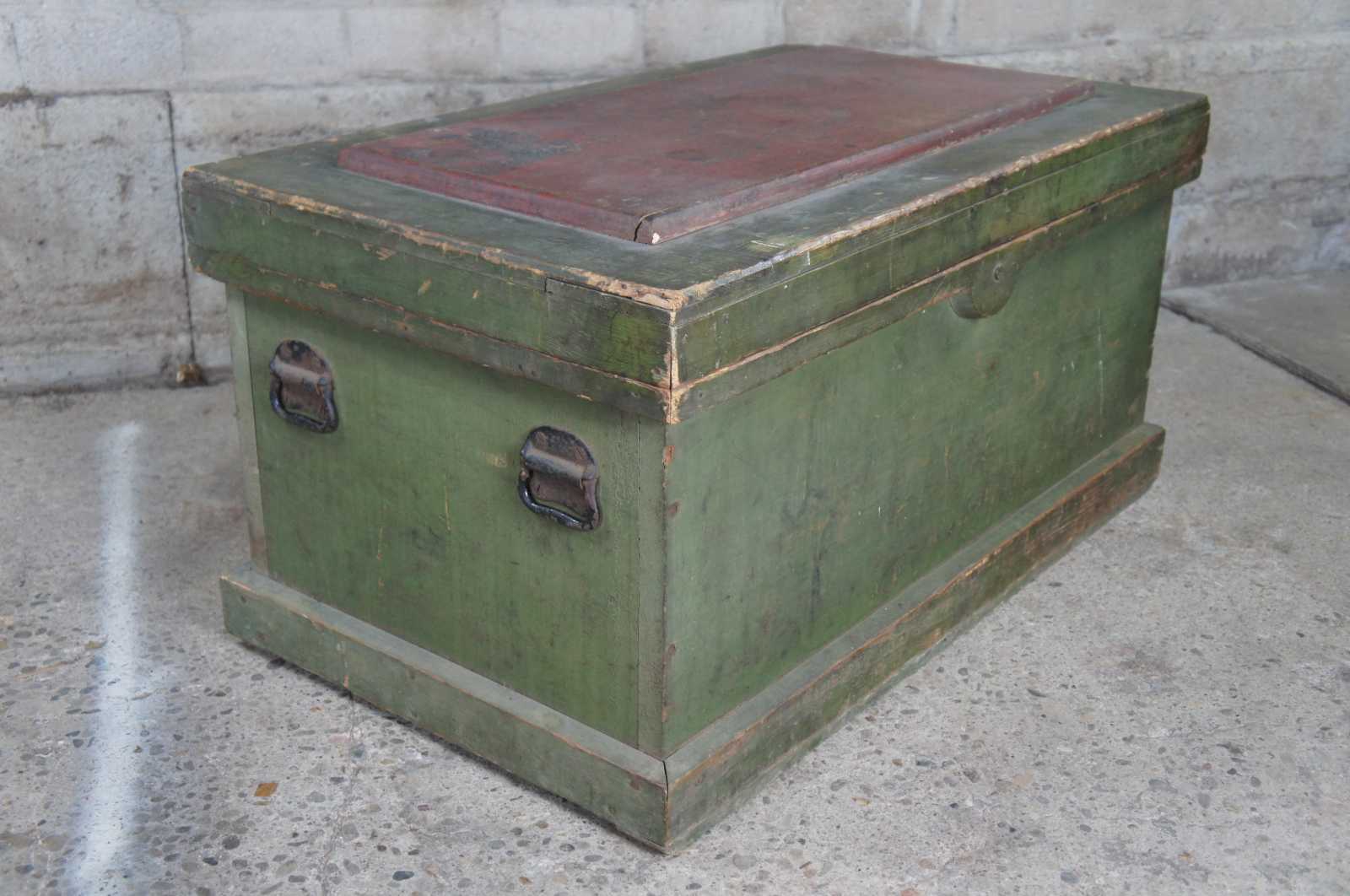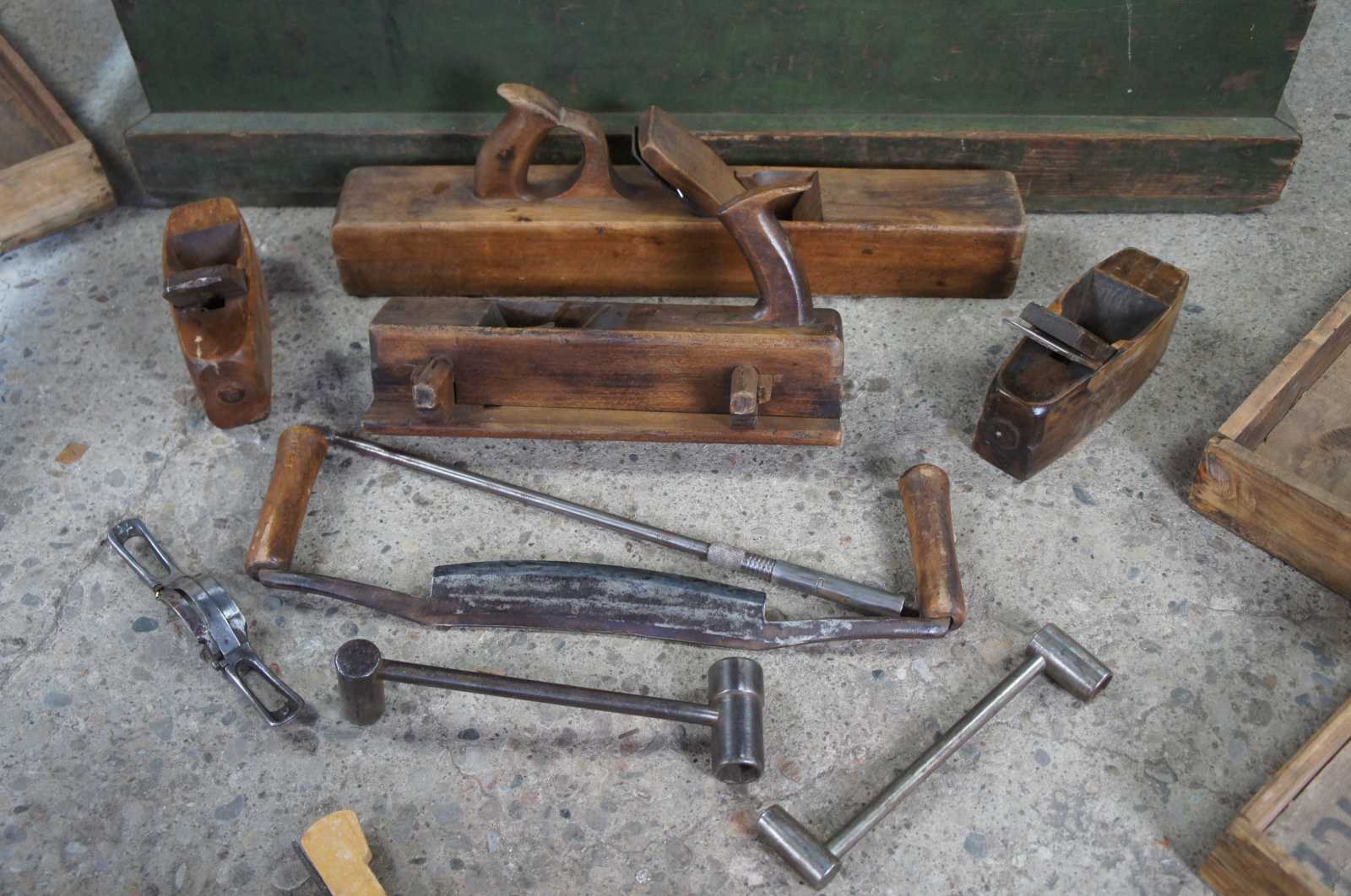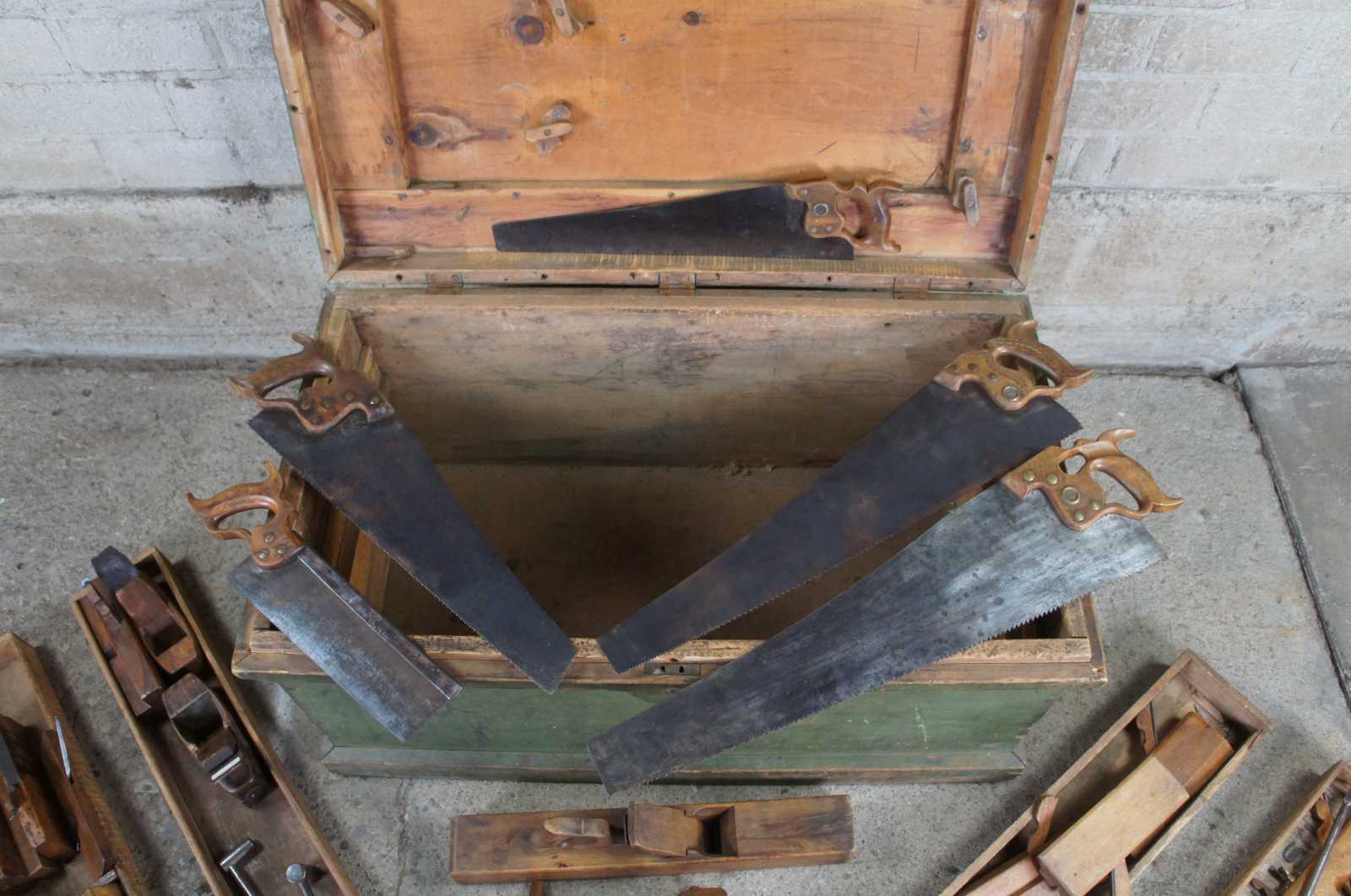 An exceptional and rare antique pine carpenters tool chest or trunk featuring five Disston hand saws, a large lot of antique planers and various extras. Marked along the upper lid, "Erected January 1906, No sleighing this winter until March 15""