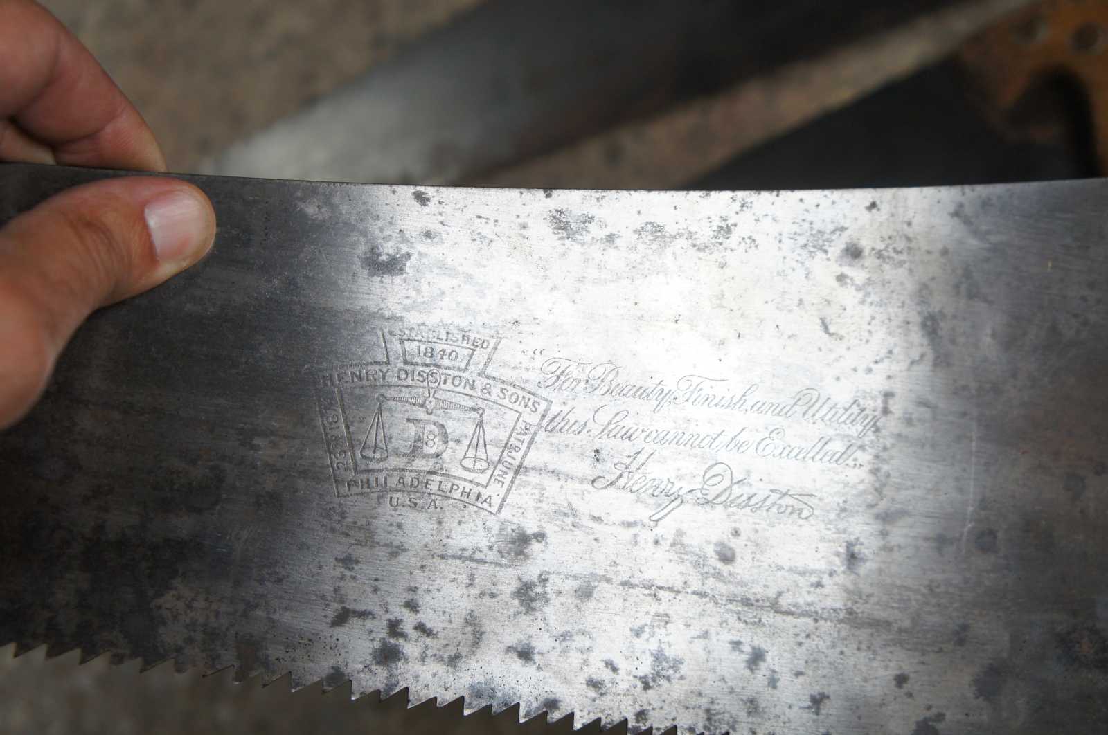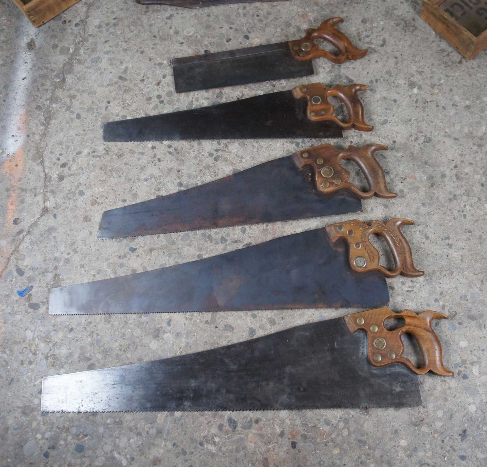 Each of the Henry Disston saws have a beautiful tiger maple contoured handle and mostly engraved blades. The trunk lid features a unique locking design custom fit for each saw handle. Below the lid are 4 fitted holders oriented over 2 shelves allowing them to neatly stow away.