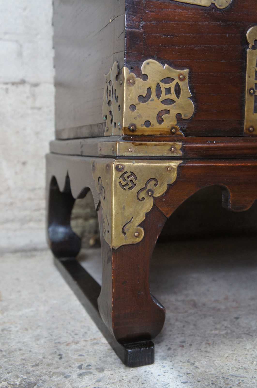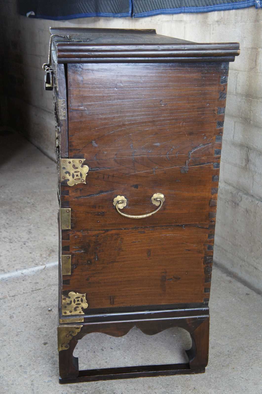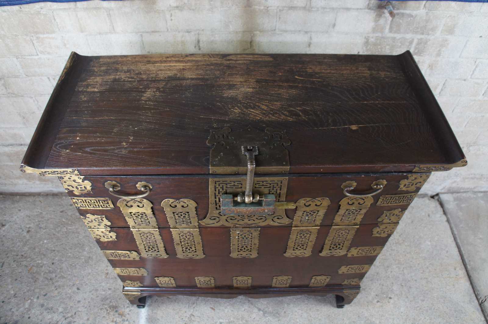 Antique Korean Bandaji chest or trunk featuring Zelkova elm frame with brass accents. The Korean name bandaji (literally meaning "half closing") derives from the hinged door in the front of this chest. This type of chest was one of the most essential, and most commonly found, pieces of furniture in a Korean household. Clothes, documents and valuables would be stored inside while folded blankets would be placed on top during the day (which explains why it is called a "blanket chest" in English). This chest, with its richly decorated fittings and extensive metalwork, was produced in the northern provinces of the Korean peninsula, mid nineteenth century; Kyong'gi Province, Joseon Dynasty (1392 - 1897).