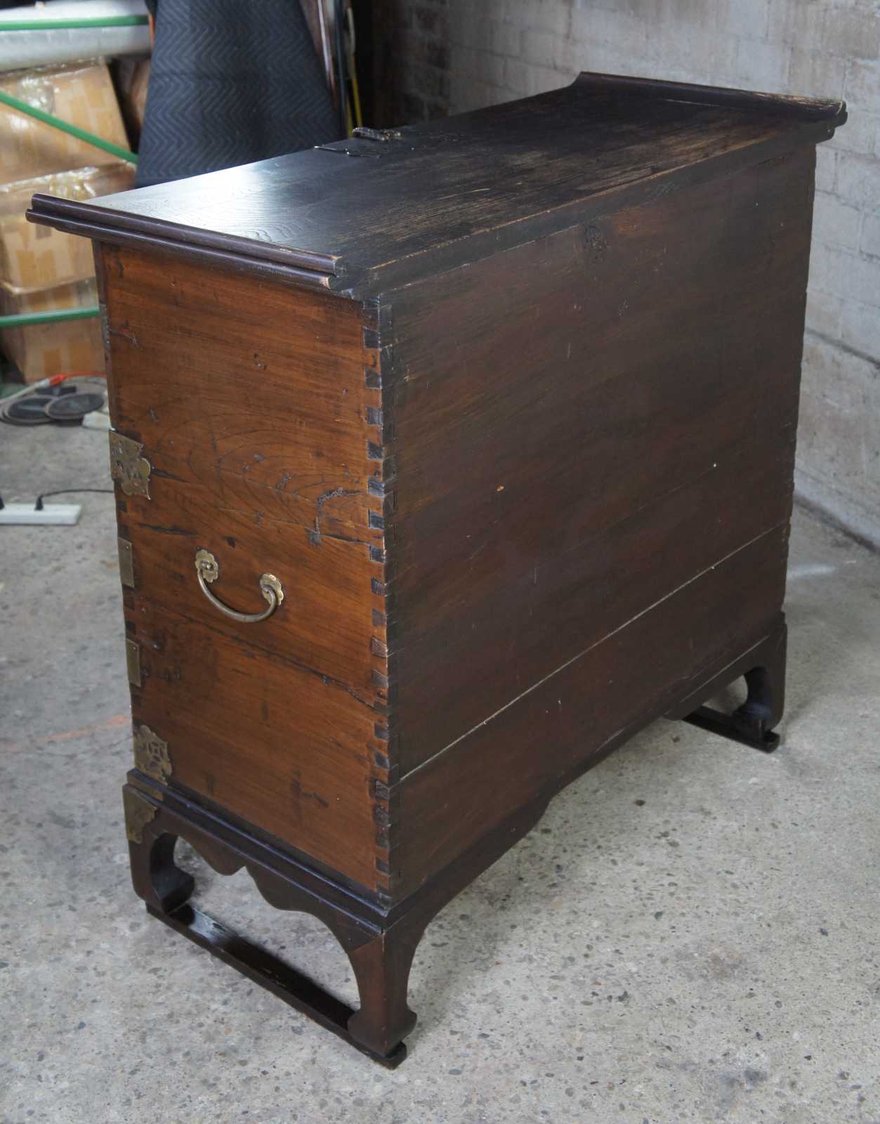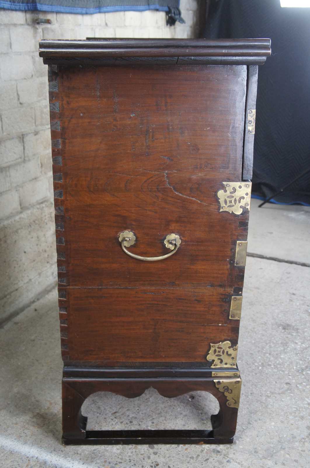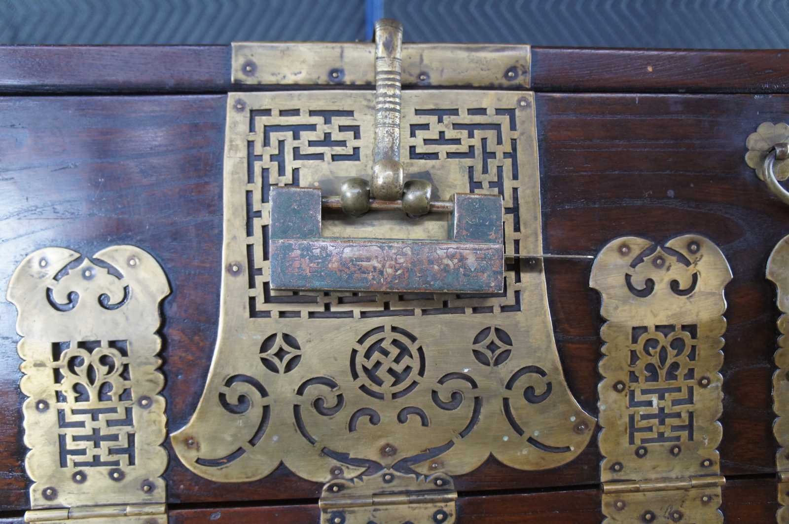 Antique Korean Bandaji chest or trunk featuring Zelkova elm frame with brass accents. The Korean name bandaji (literally meaning "half closing") derives from the hinged door in the front of this chest. This type of chest was one of the most essential, and most commonly found, pieces of furniture in a Korean household. Clothes, documents and valuables would be stored inside while folded blankets would be placed on top during the day (which explains why it is called a "blanket chest" in English). This chest, with its richly decorated fittings and extensive metalwork, was produced in the northern provinces of the Korean peninsula, mid nineteenth century; Kyong'gi Province, Joseon Dynasty (1392 - 1897).