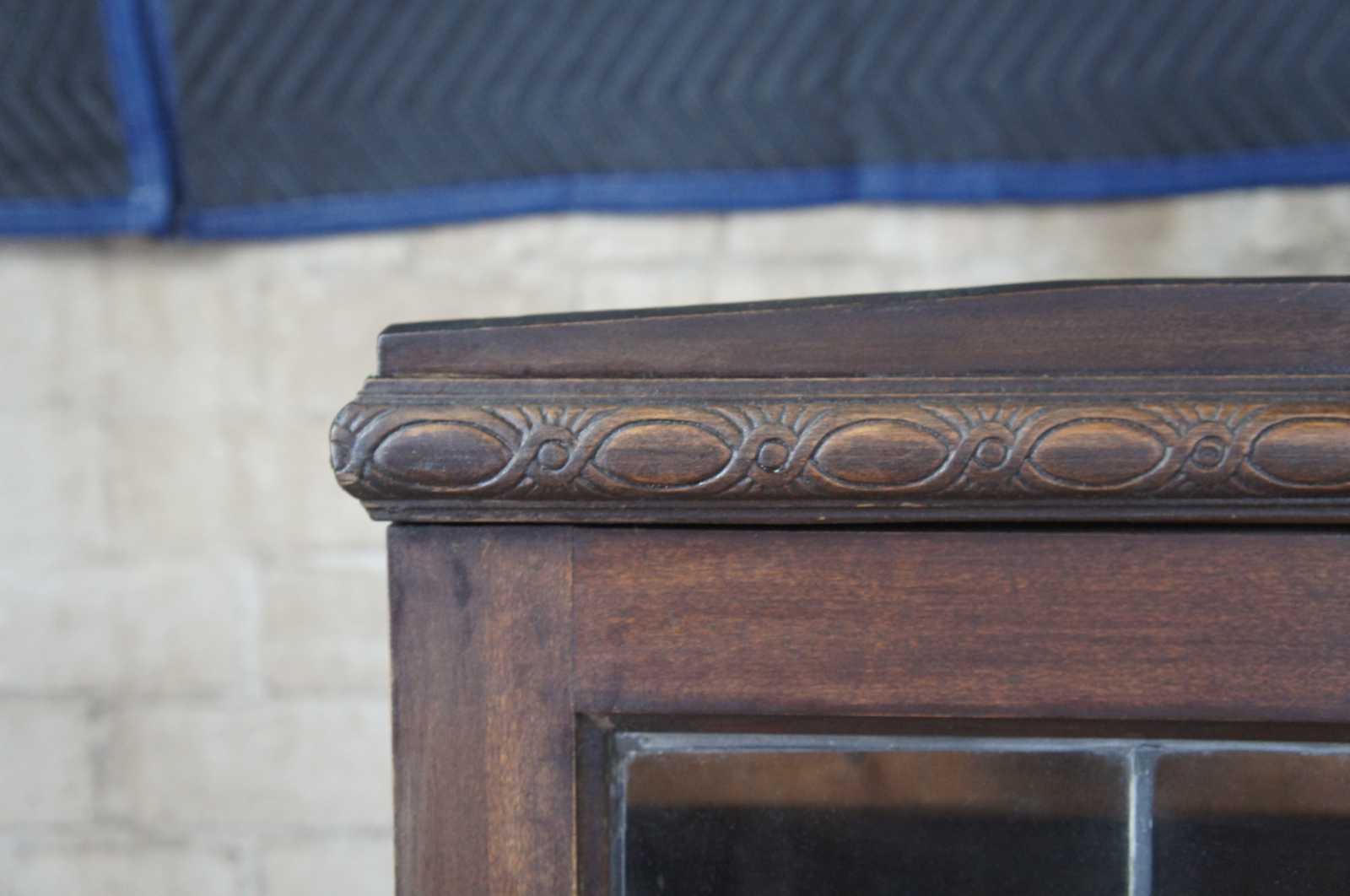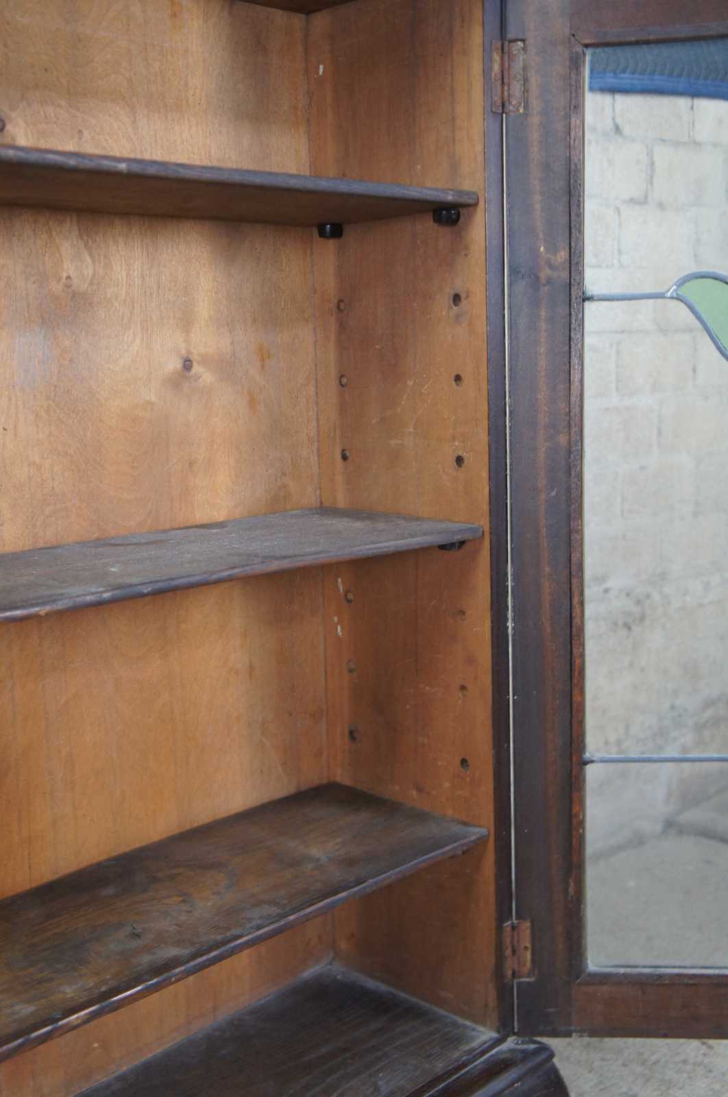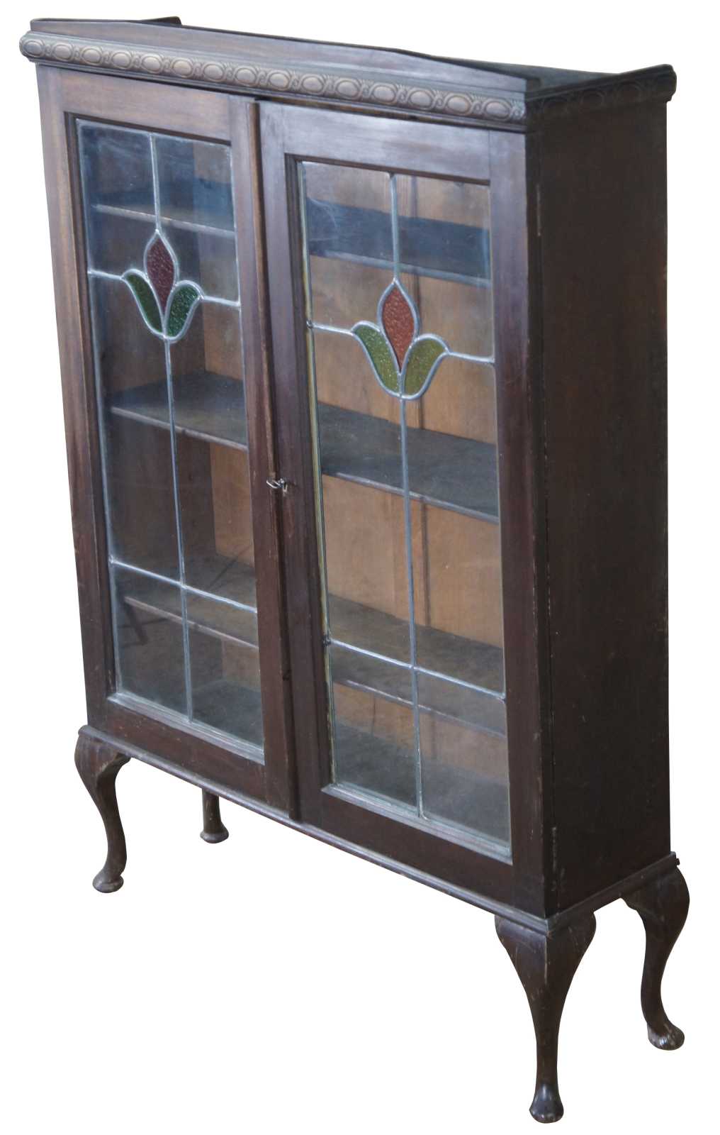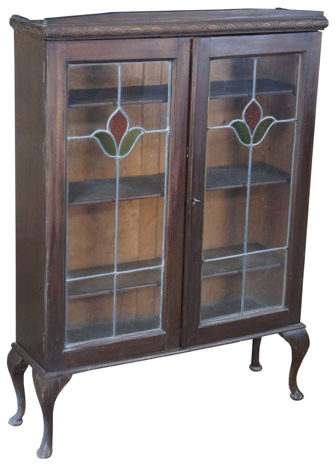 Antique English leaded glass curio cabinet or bookcase featuring Queen Anne styling with a rose or flower slag glass insert and cabriole legs.