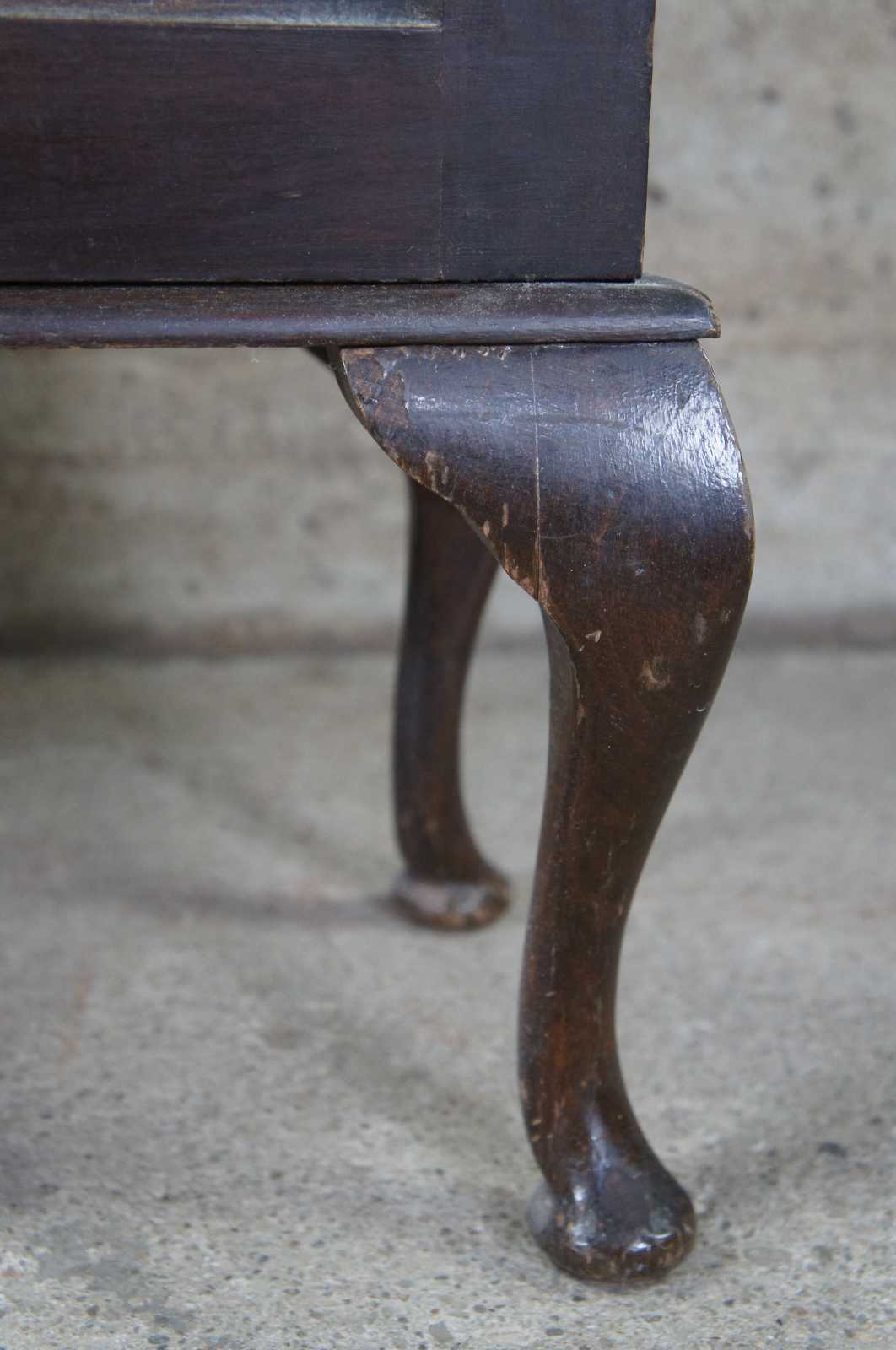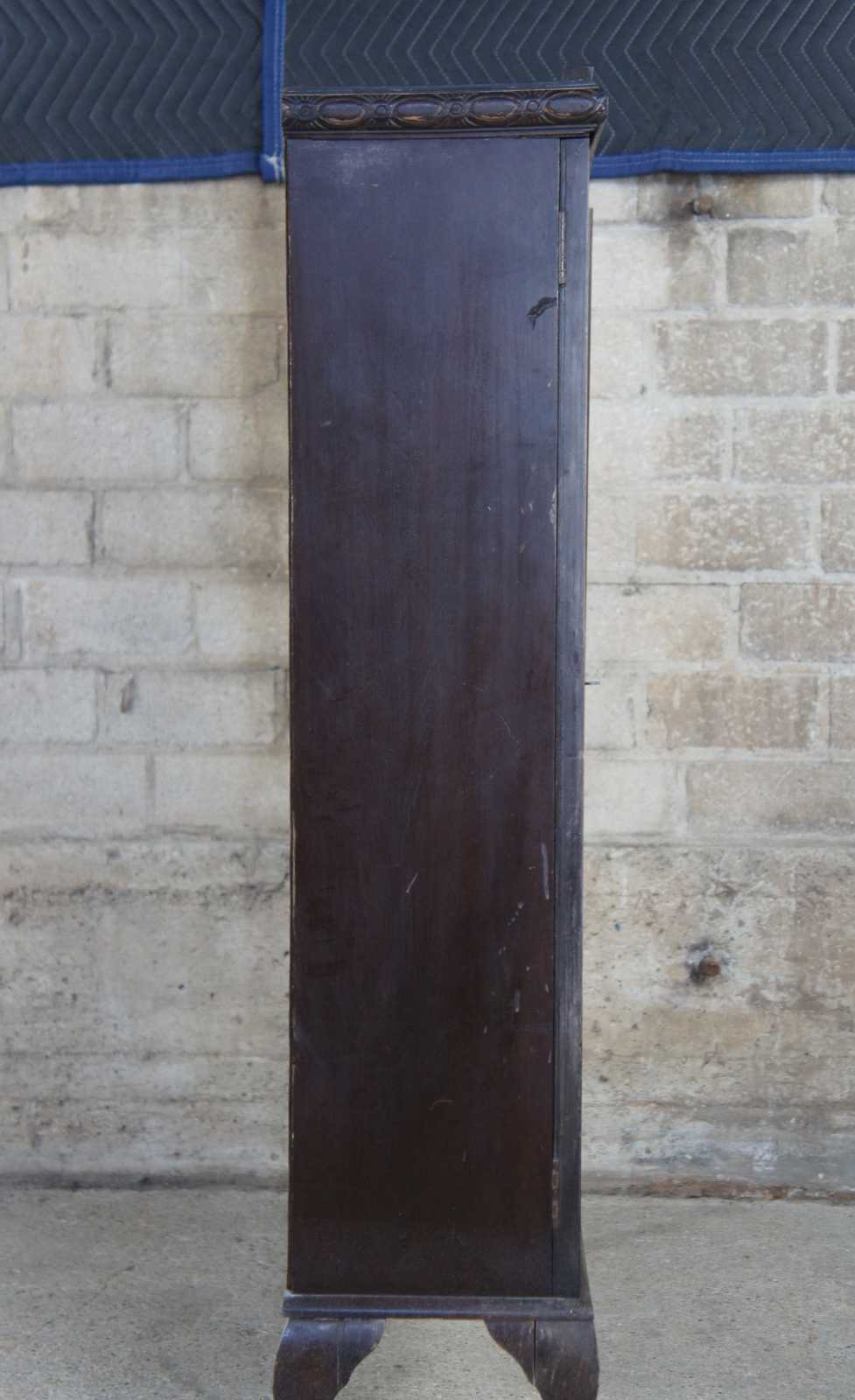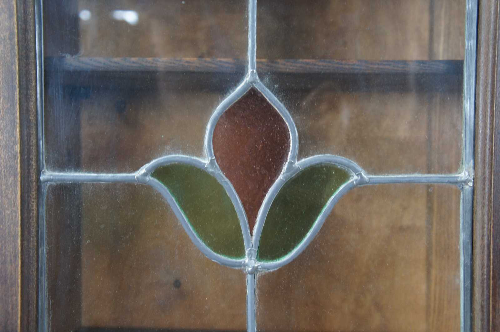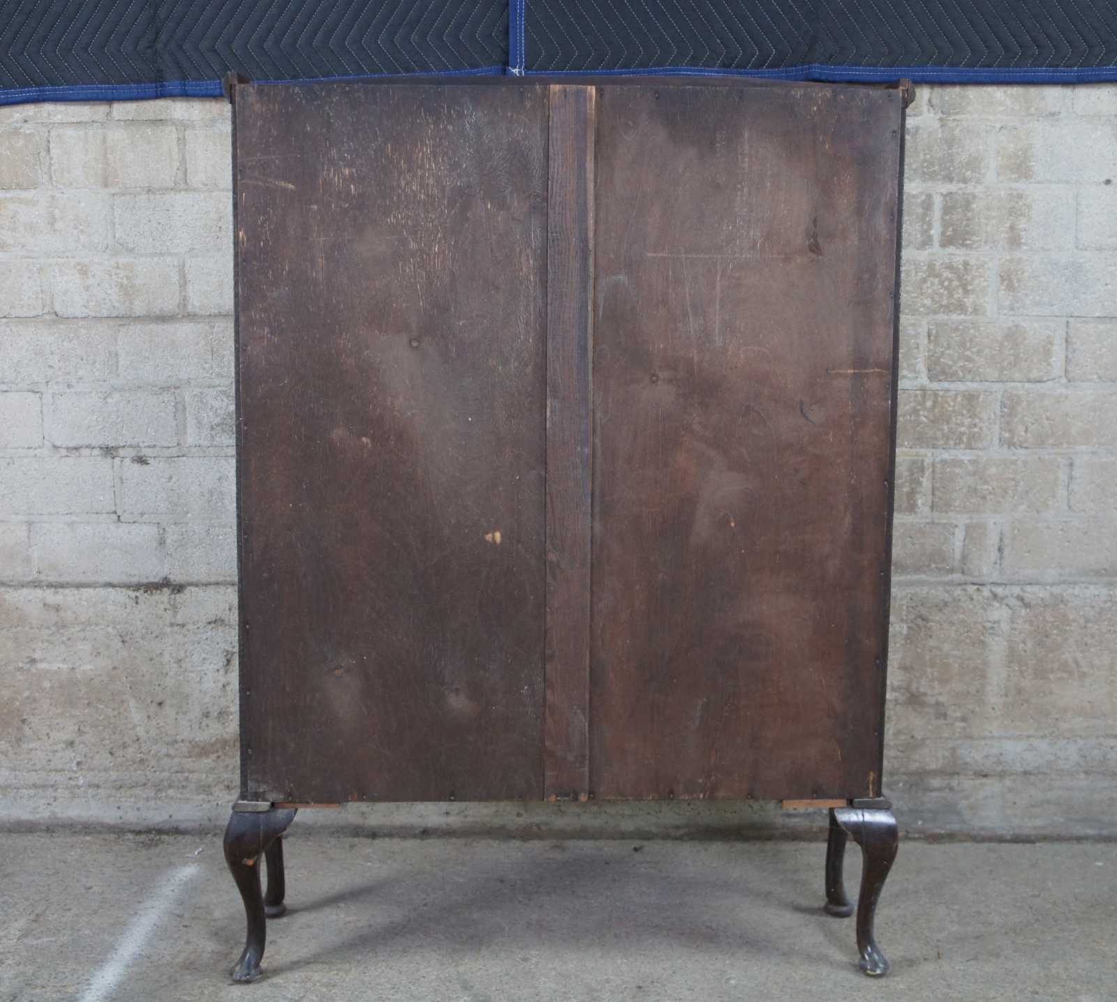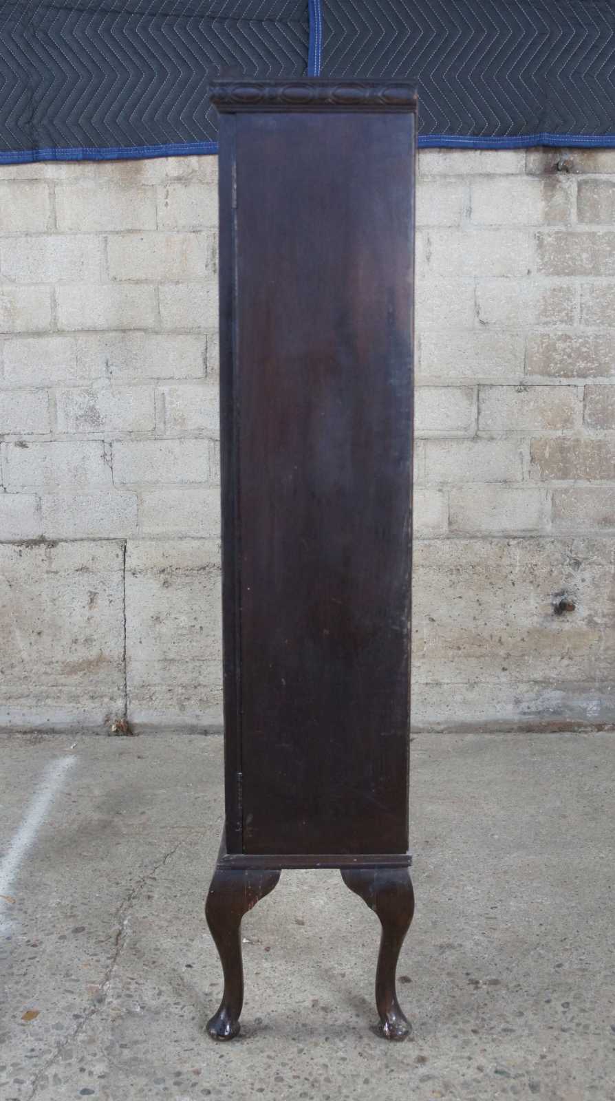 Antique English leaded glass curio cabinet or bookcase featuring Queen Anne styling with a rose or flower slag glass insert and cabriole legs.