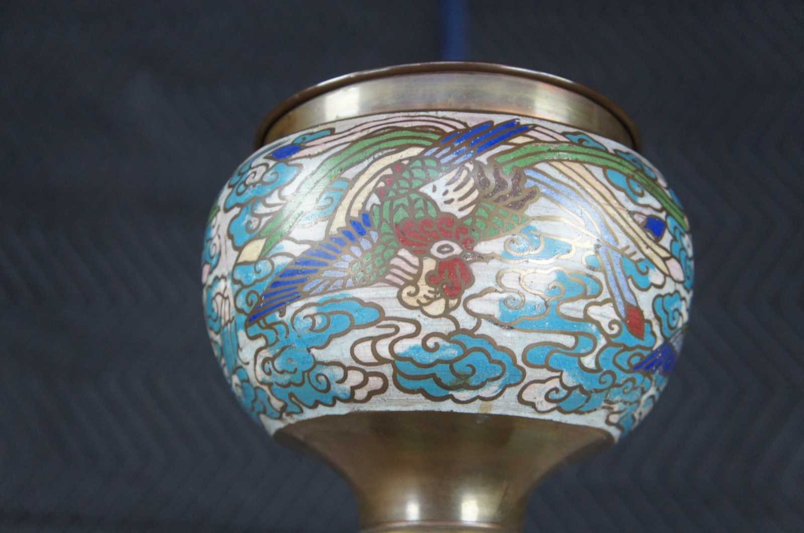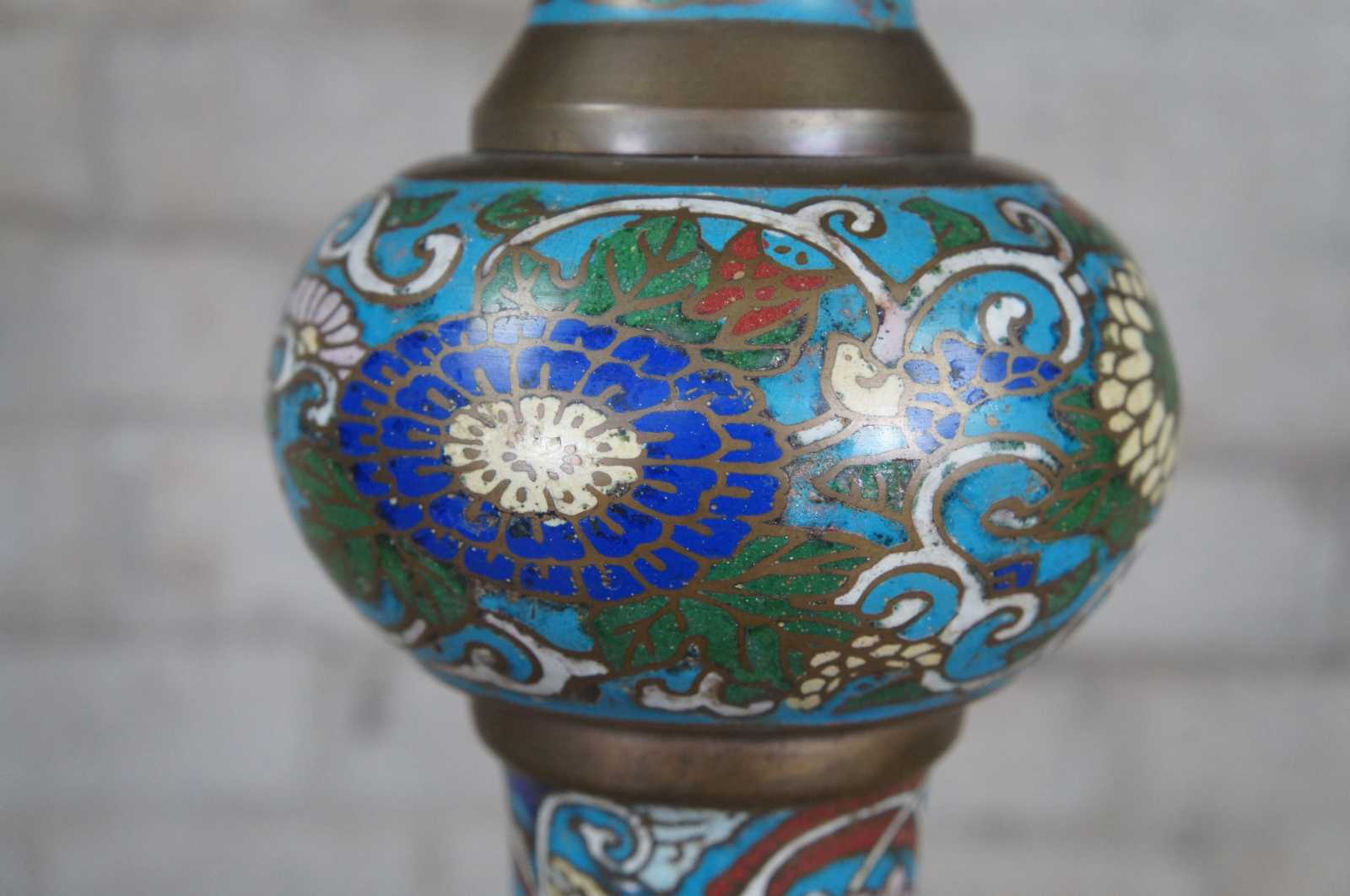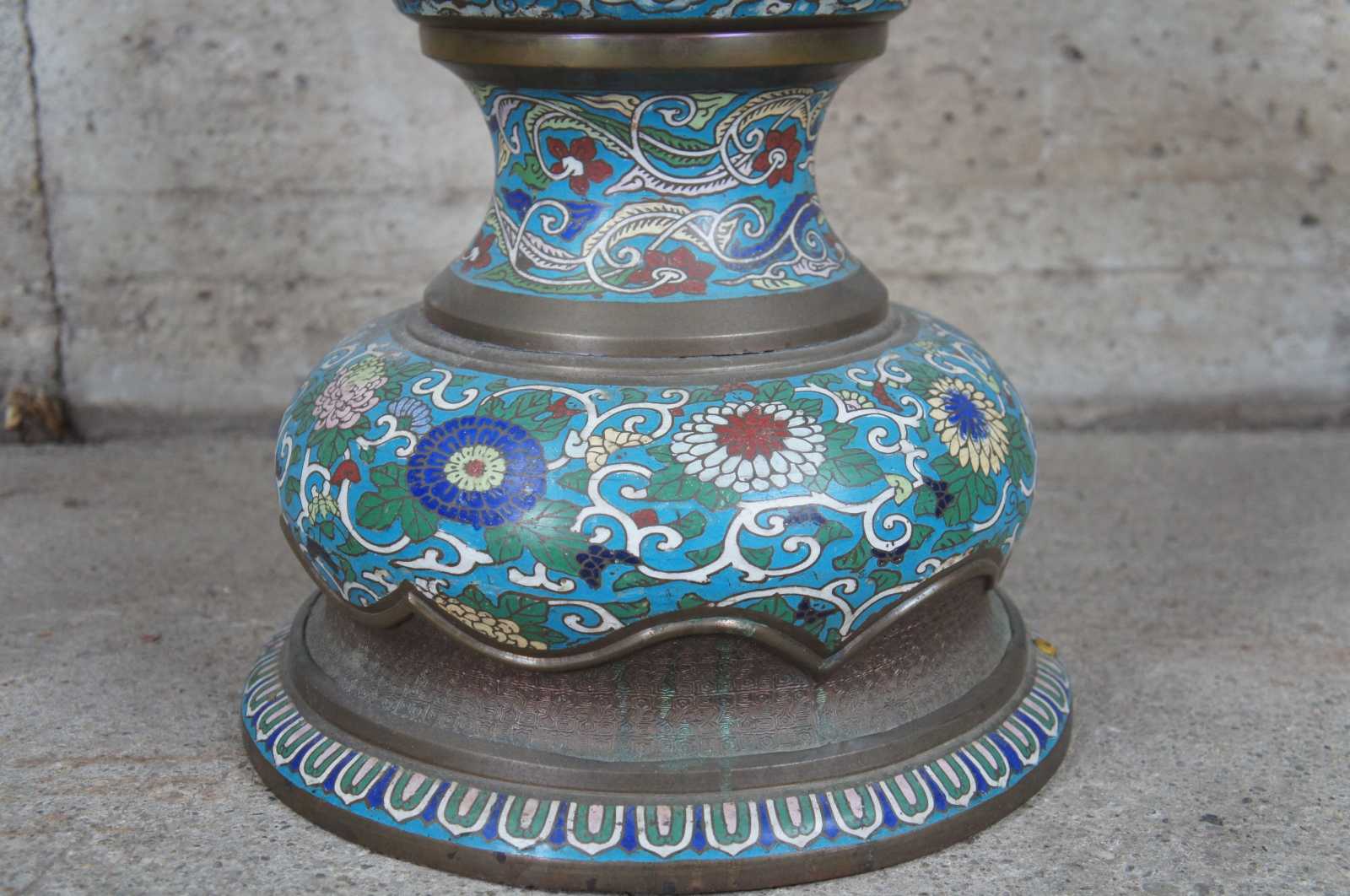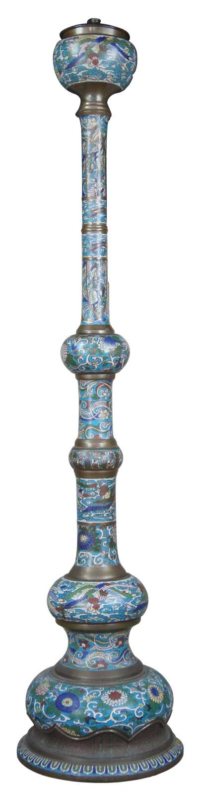 Monumental antique cloisonne floor oil lamp featuring champleve enamel design of stylized animals, figures and vined florals against a field of clouds and brass accents.