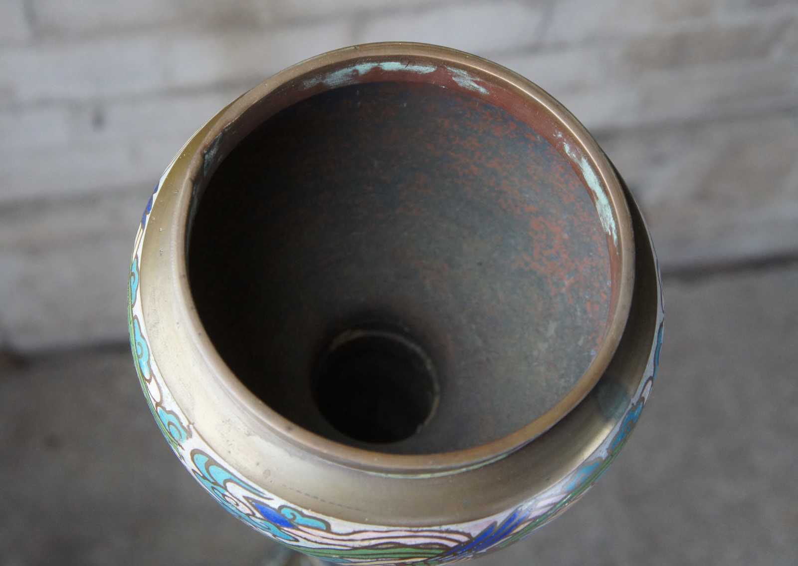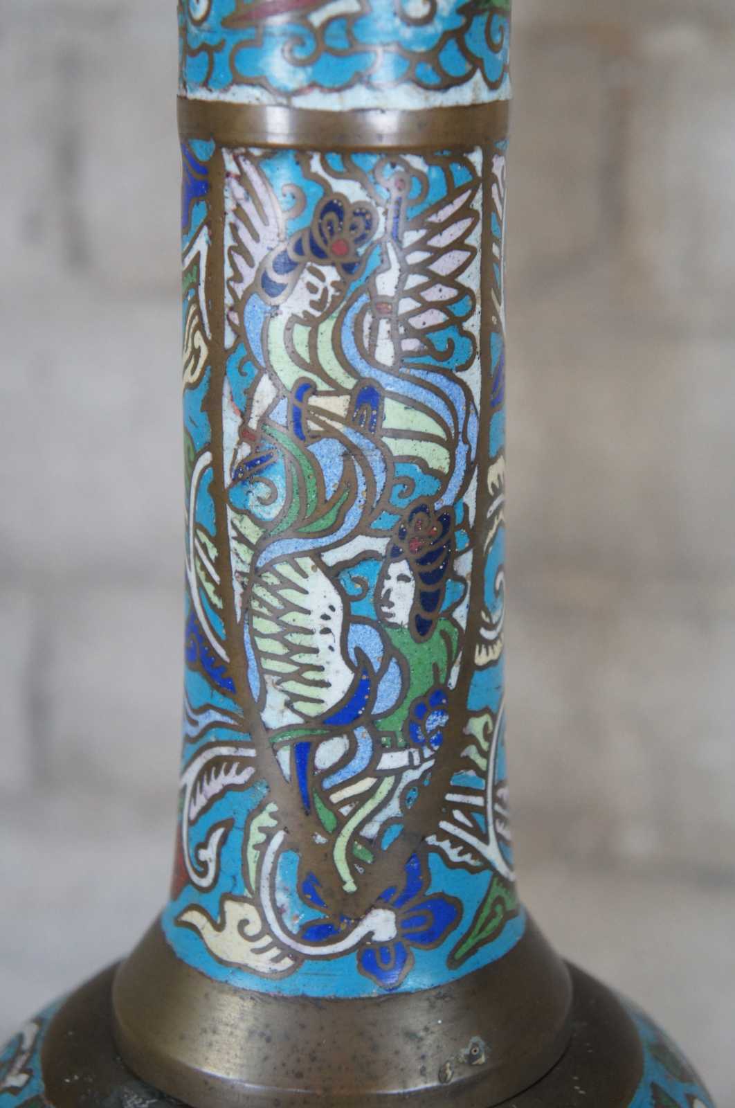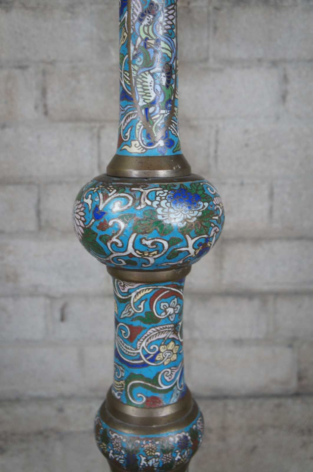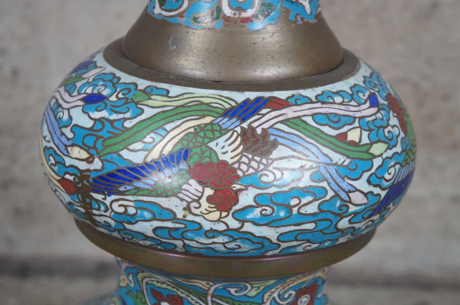 Monumental antique cloisonne floor oil lamp featuring champleve enamel design of stylized animals, figures and vined florals against a field of clouds and brass accents.