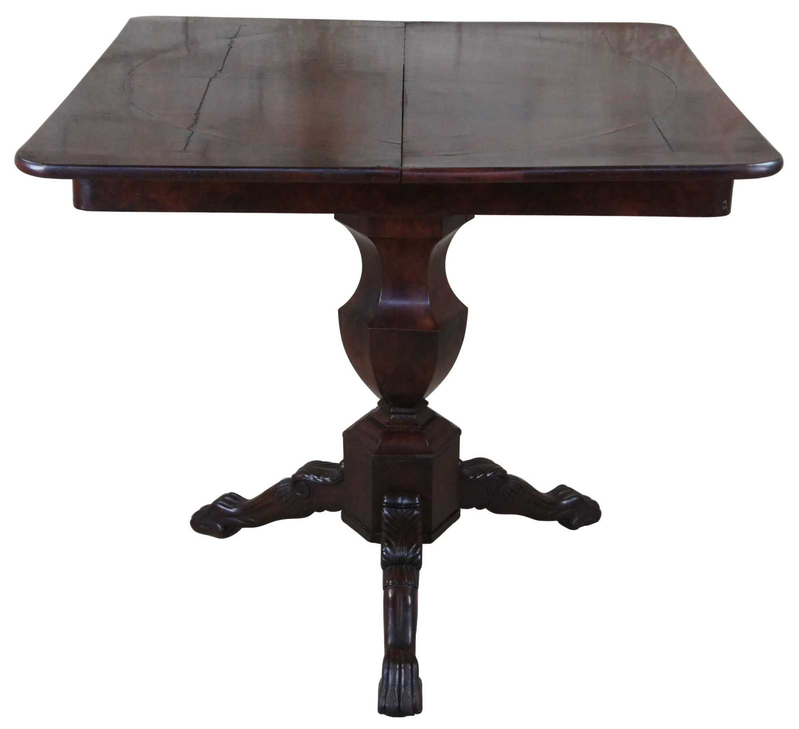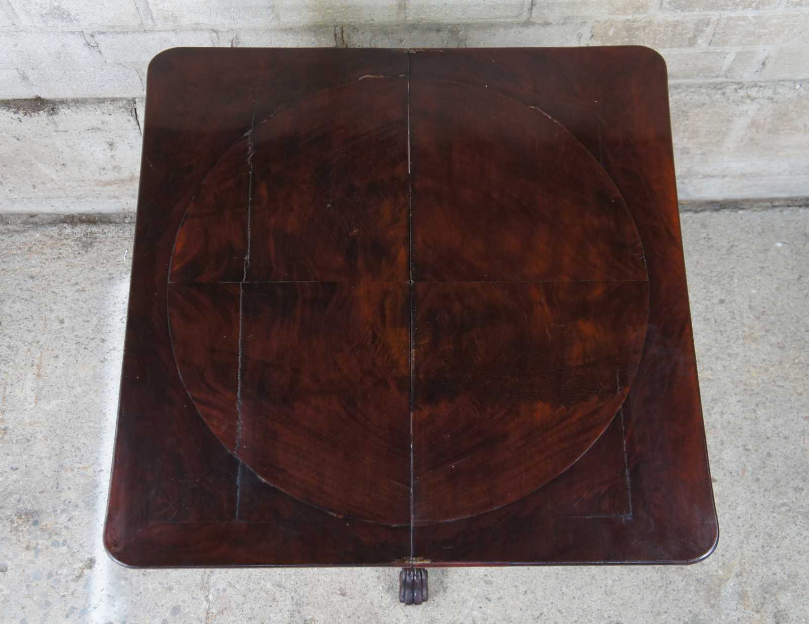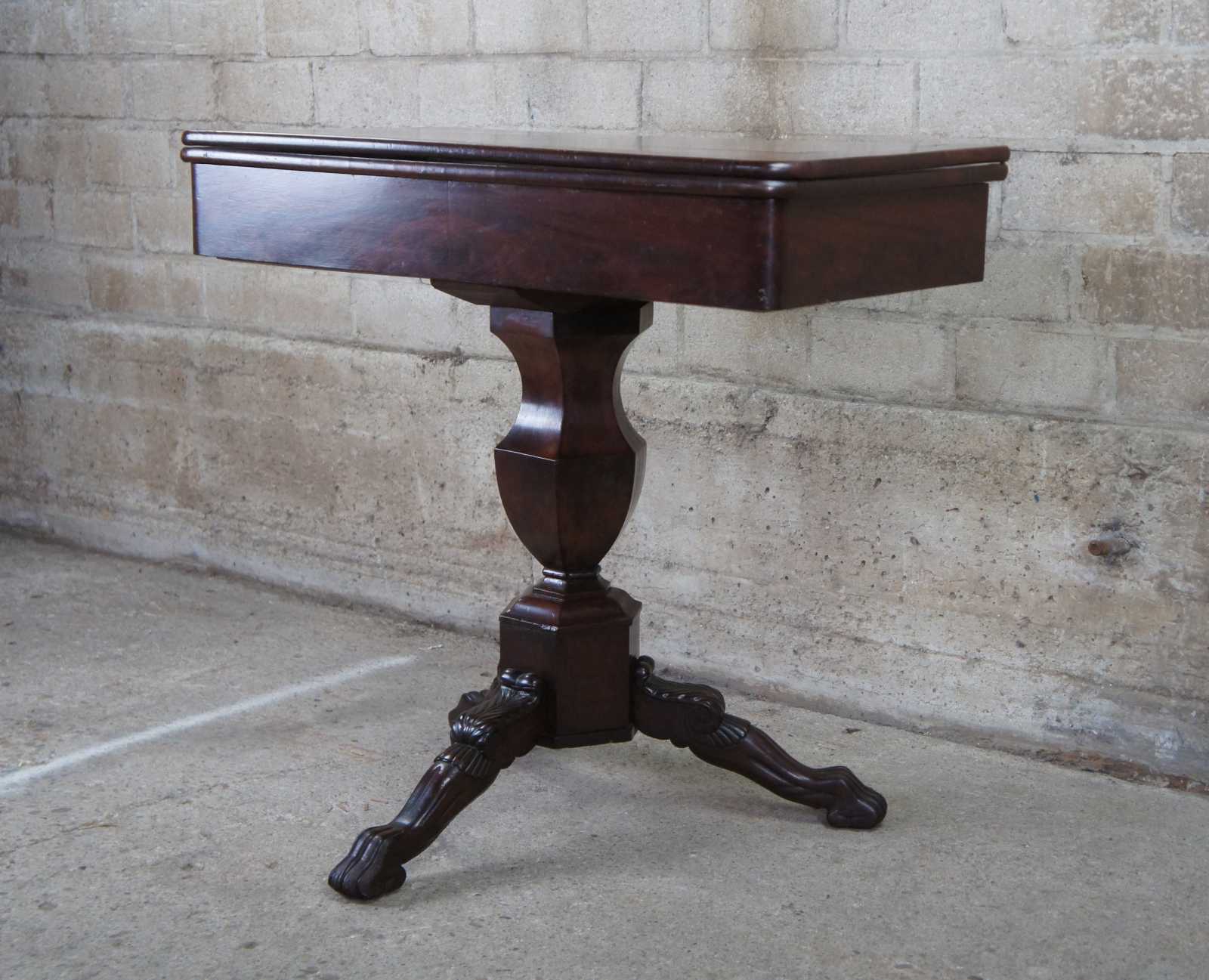 An exquisite American Empire flame mahogany paw foot game table, circa 1830s. Features a rectangular top that flips open to a square form with circular crotch veneer center. The top is supported by a turned baluster leading to a carved tripod base with scrolled and toned legs leading to paw feet. Storage below top allows for games and accessories to be concealed.