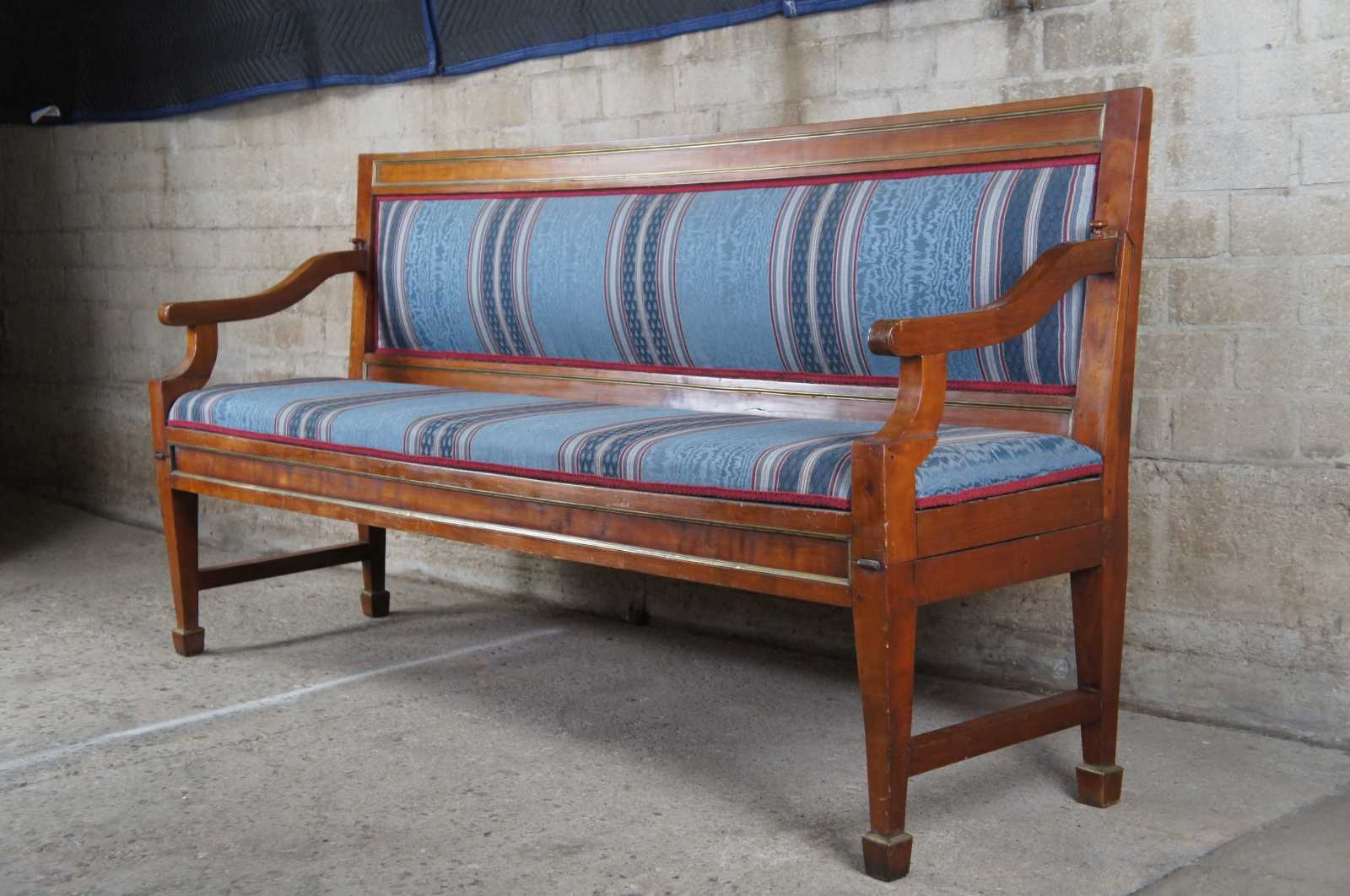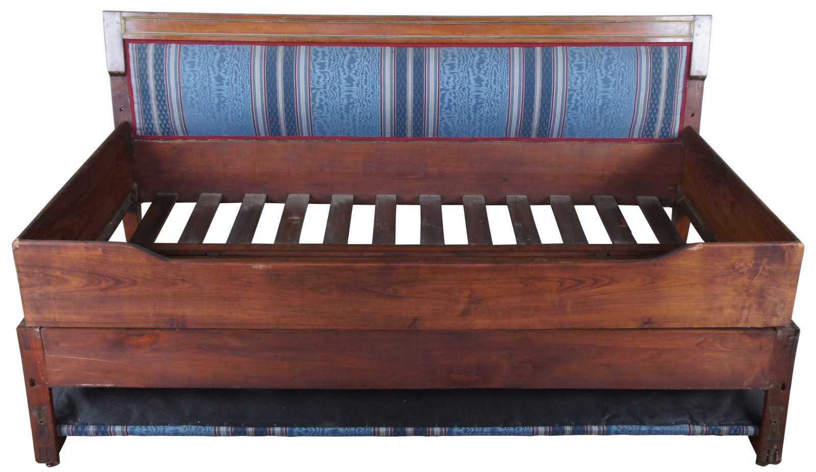 Early 19th century museum quality English Regency convertible hall bench or bed. A rectangular form made from mahogany with with brass ormolu. Upholstered in a striped blue and red fabric with red cording. The bench is supported by square tapered legs leading to spade or marlboro feet. When ready to sleep the brass bolts along the back side can be released allowing it to fold open into a flat surface with a built in frame for mattress. Also known as a "hide a bed or sleep bench"