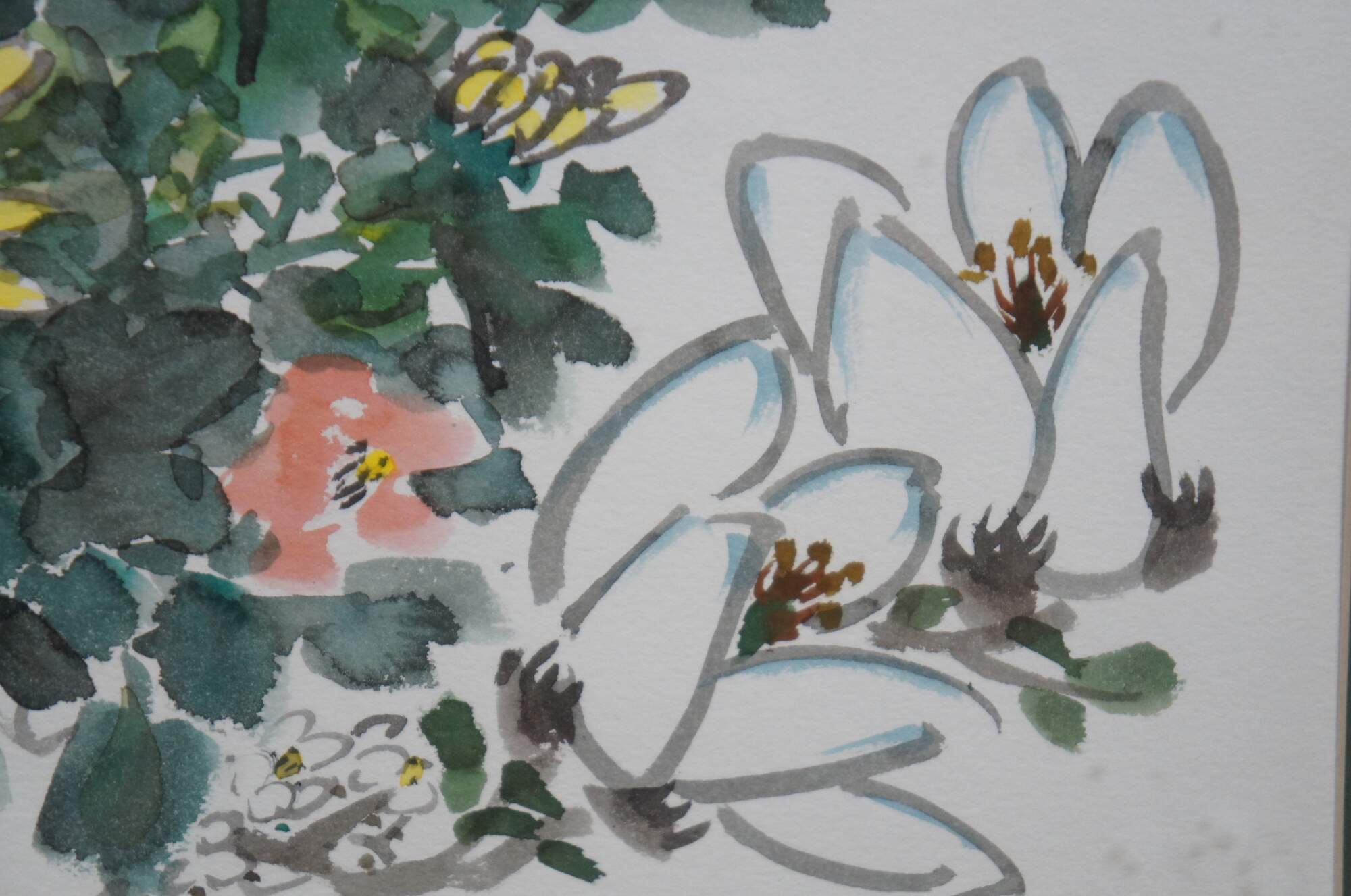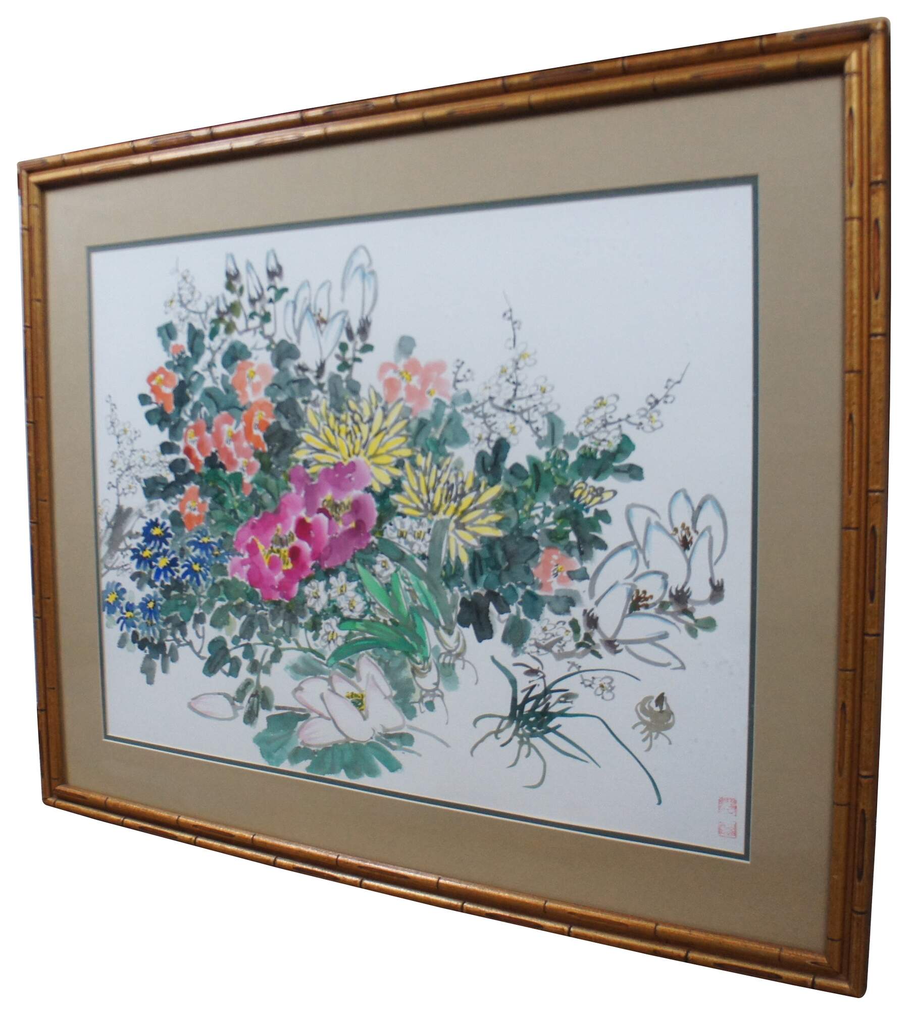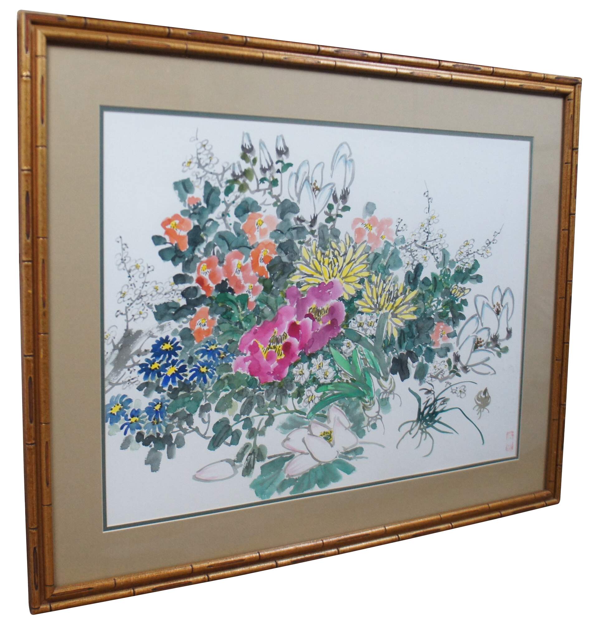 Vintage chinoiserie watercolor painting showing a variety of flowers on a plain white background, faux bamboo frame. Attributed to Zhongxiang Liu. Circa 1980s.