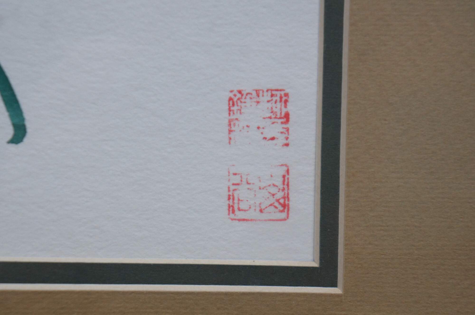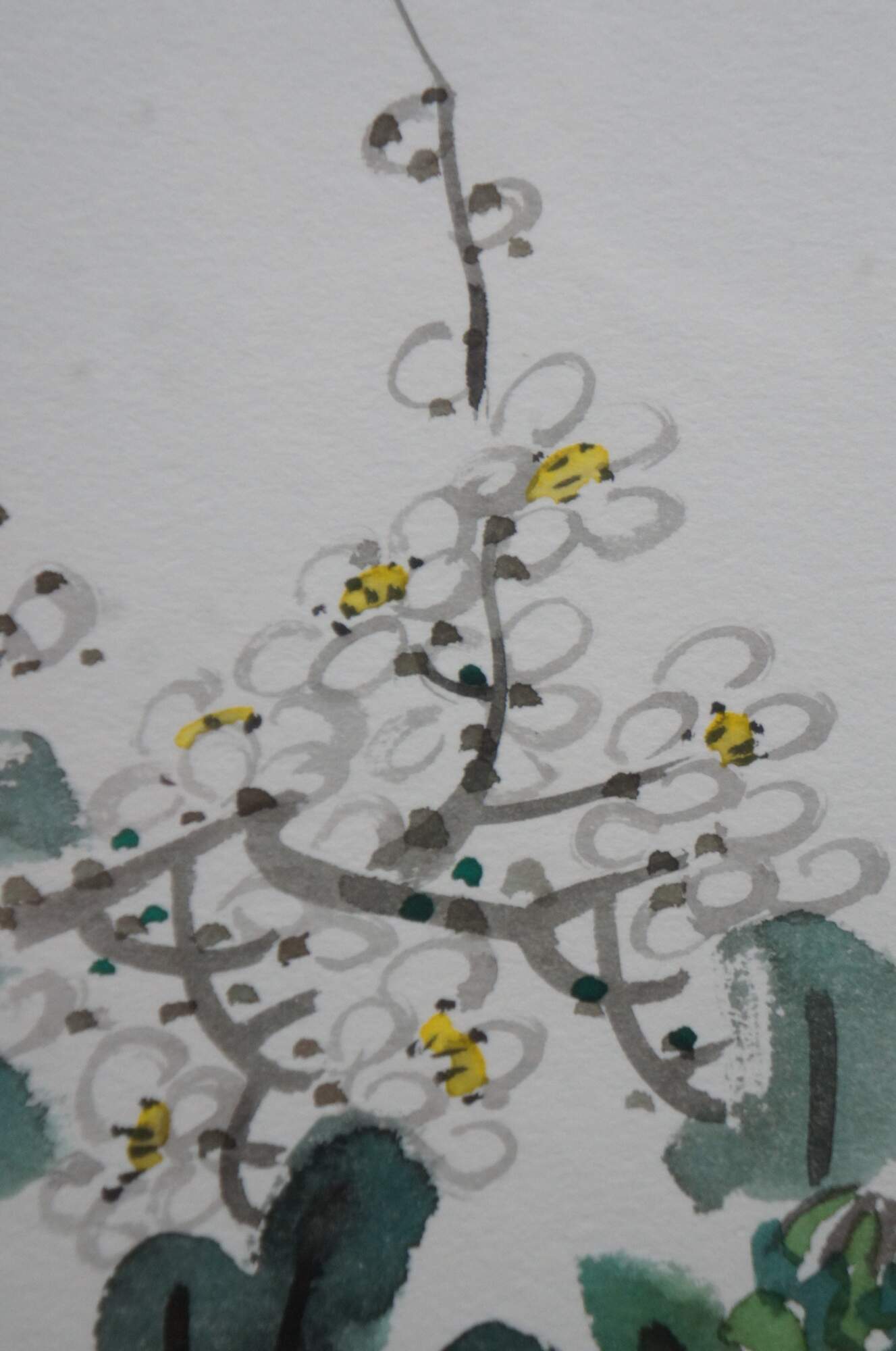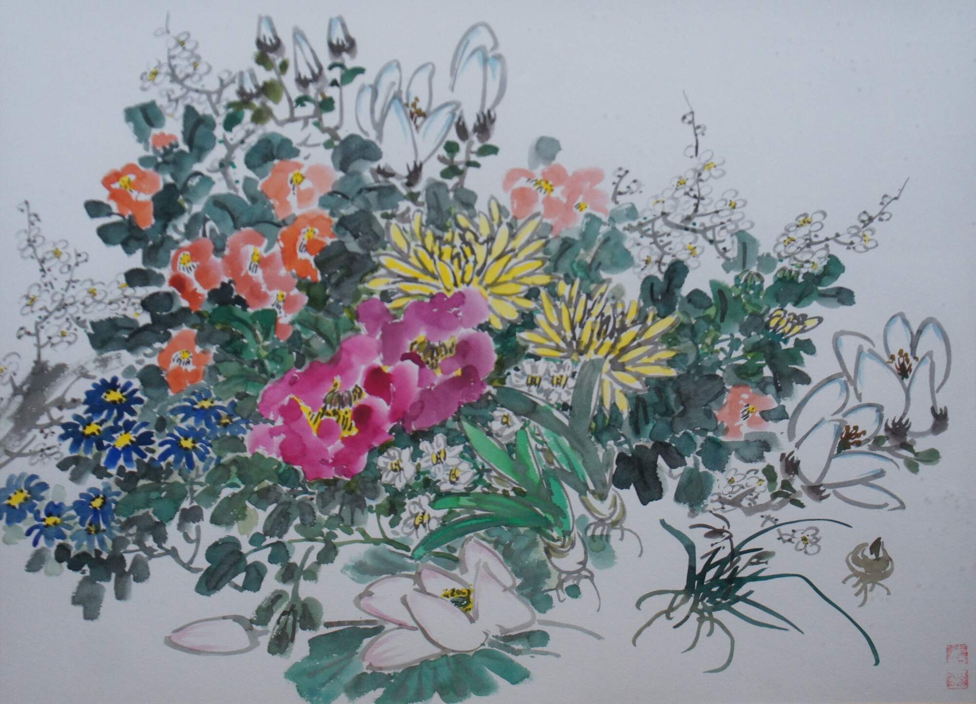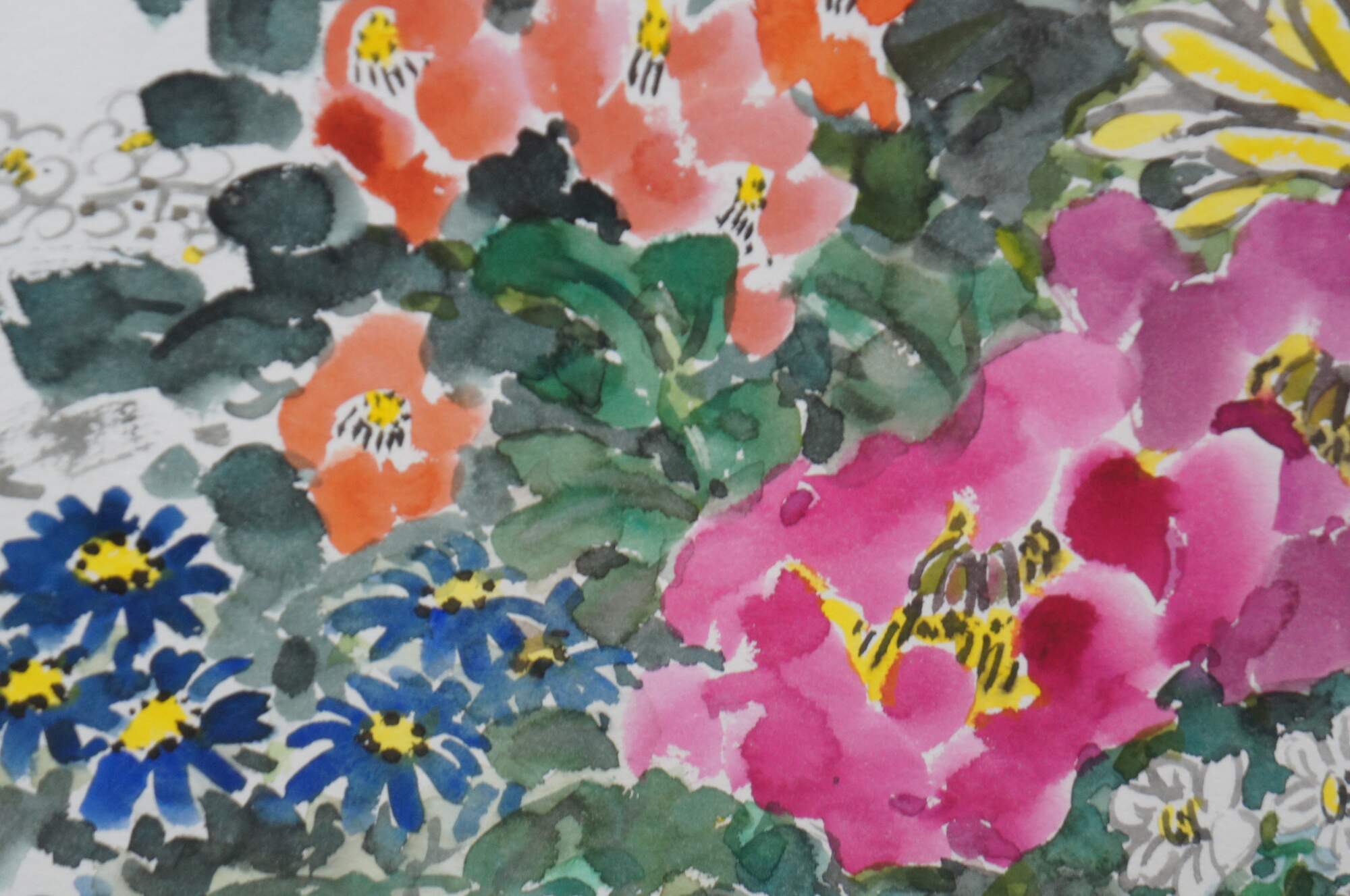 Vintage chinoiserie watercolor painting showing a variety of flowers on a plain white background, faux bamboo frame. Attributed to Zhongxiang Liu. Circa 1980s.