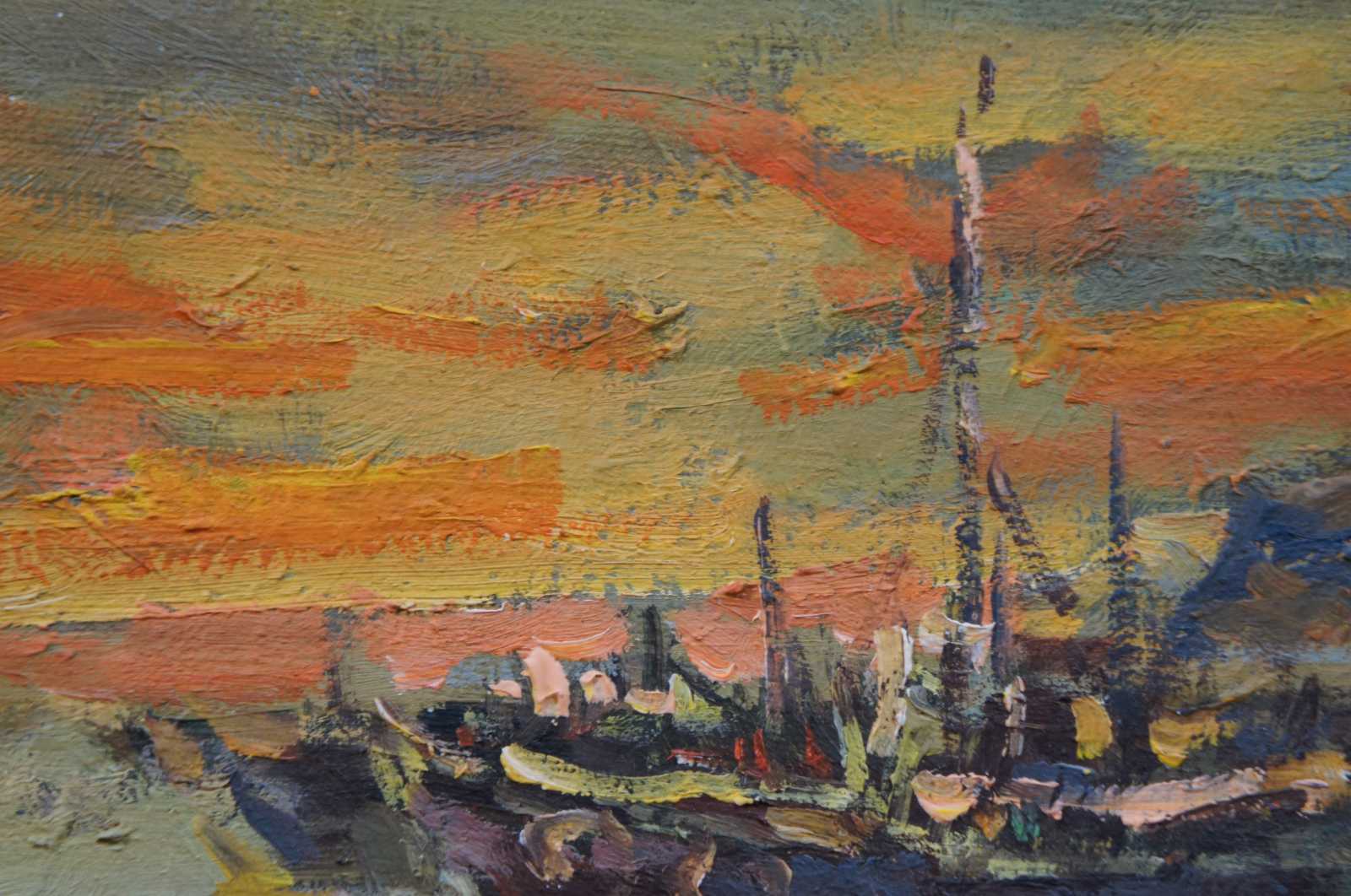 Vintage impressionist style oil on canvas harbor scene at sunset, signed Chul.M.Kim and marked on the back “Simmon Sun Art Gallery 1986.”
