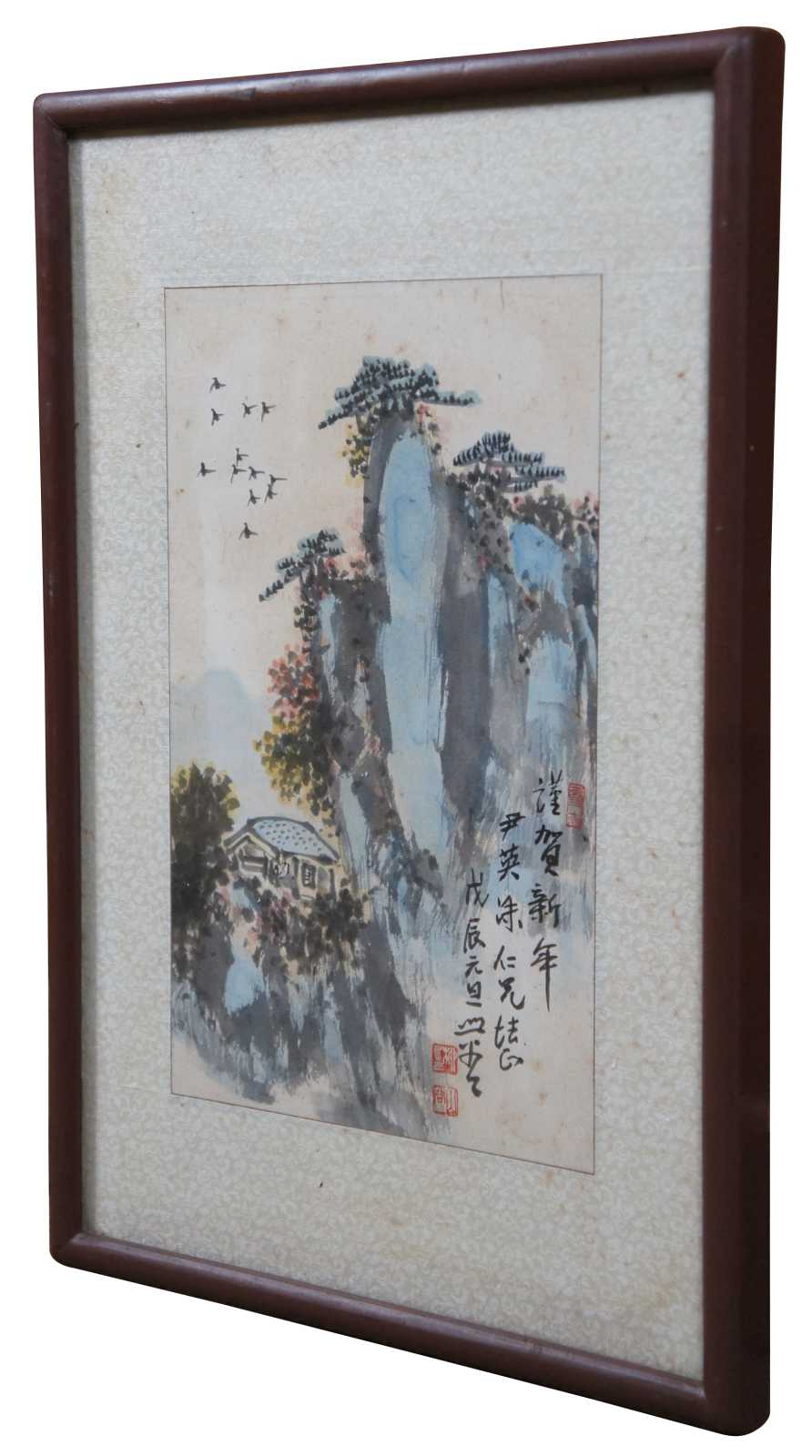Vintage Korean watercolor painting showing a mountain landscape with a cottage and flying birds. Titled Congratulations to the New Year.