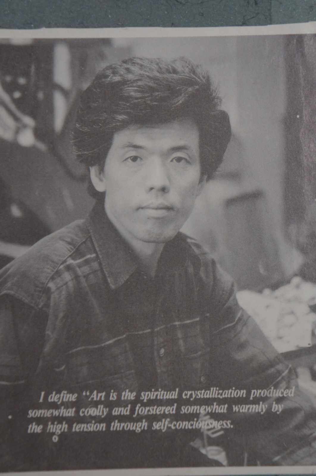 Vintage large hand painted golden fan by Tak-Young Jung from his 1991 solo exhibition “The Admiration of Life Through the Symbolization of Colors“ at the Modern Art Gallery in Los Angeles, CA. “Long regarded as paradigmatic in histories of modern art in Asia, abstraction assumed new urgency in the hands of ink painters like Jung Tak-young (b. 1937). During the politically and socially turbulent early decades of postwar Korea, Jung played an exemplary role in the Korean emergence of a self-consciously abstract ink painting through sustained experimentation that included rejecting the use of ink, the very material that crucially defined ink painting. For Jung, abstraction was a necessary platform for rethinking entrenched concepts of medium, presence, and form in hopes of arriving at a more expanded view of contemporary art.” Signed lower left.