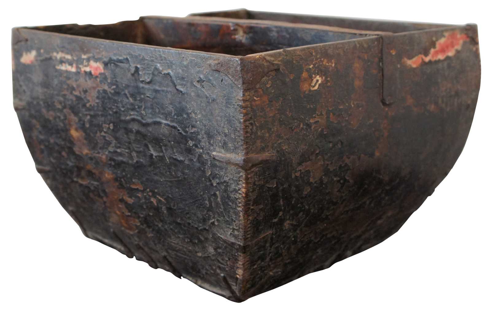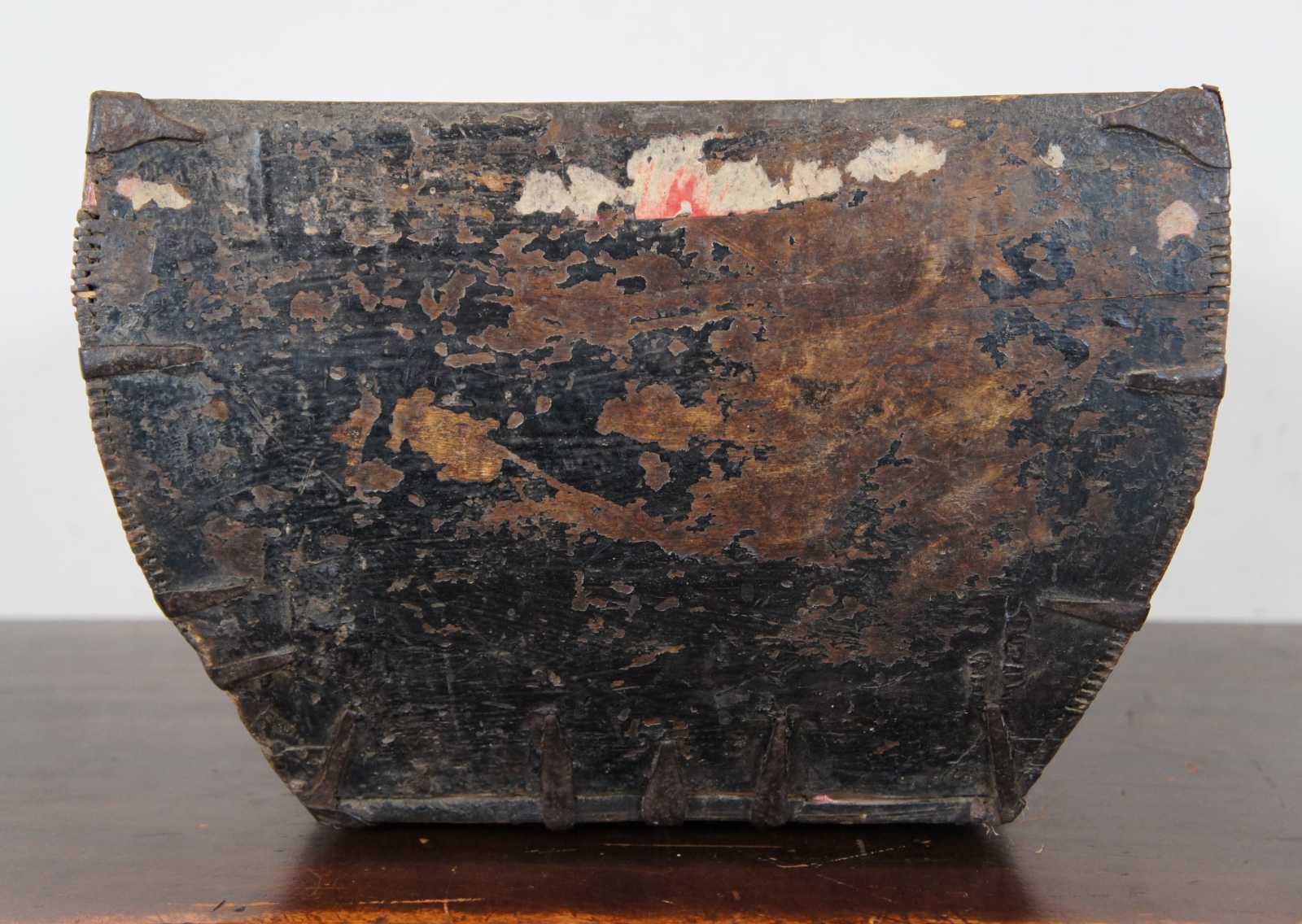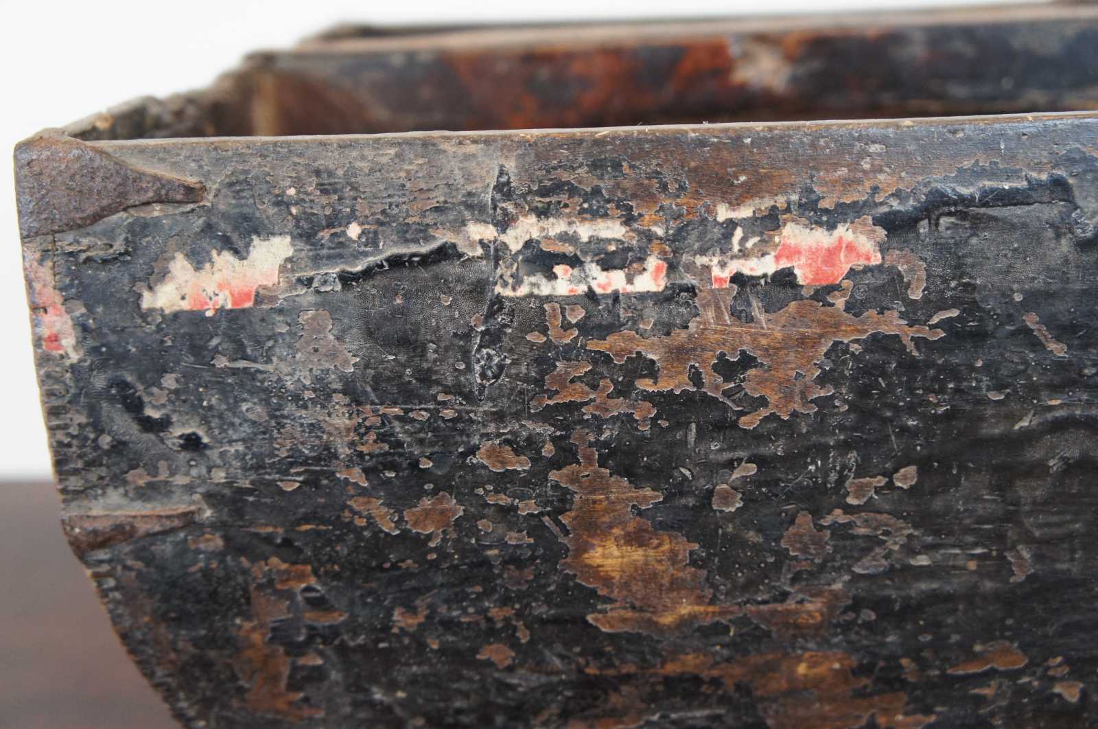 19th century Chinese wooden grain or rice measure / harvesting bucket with handle across the middle and primitive iron accents.