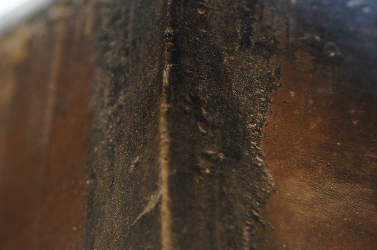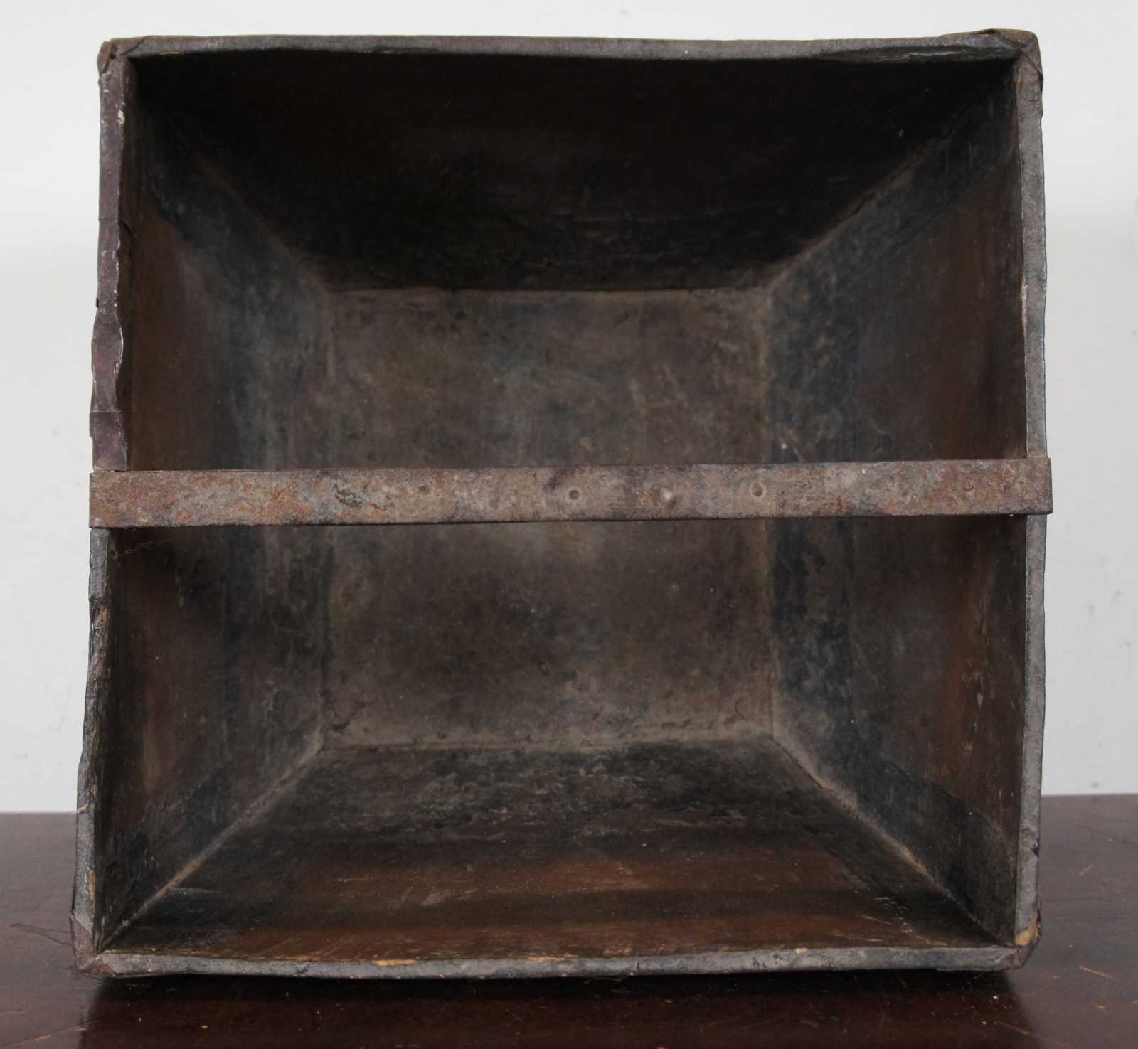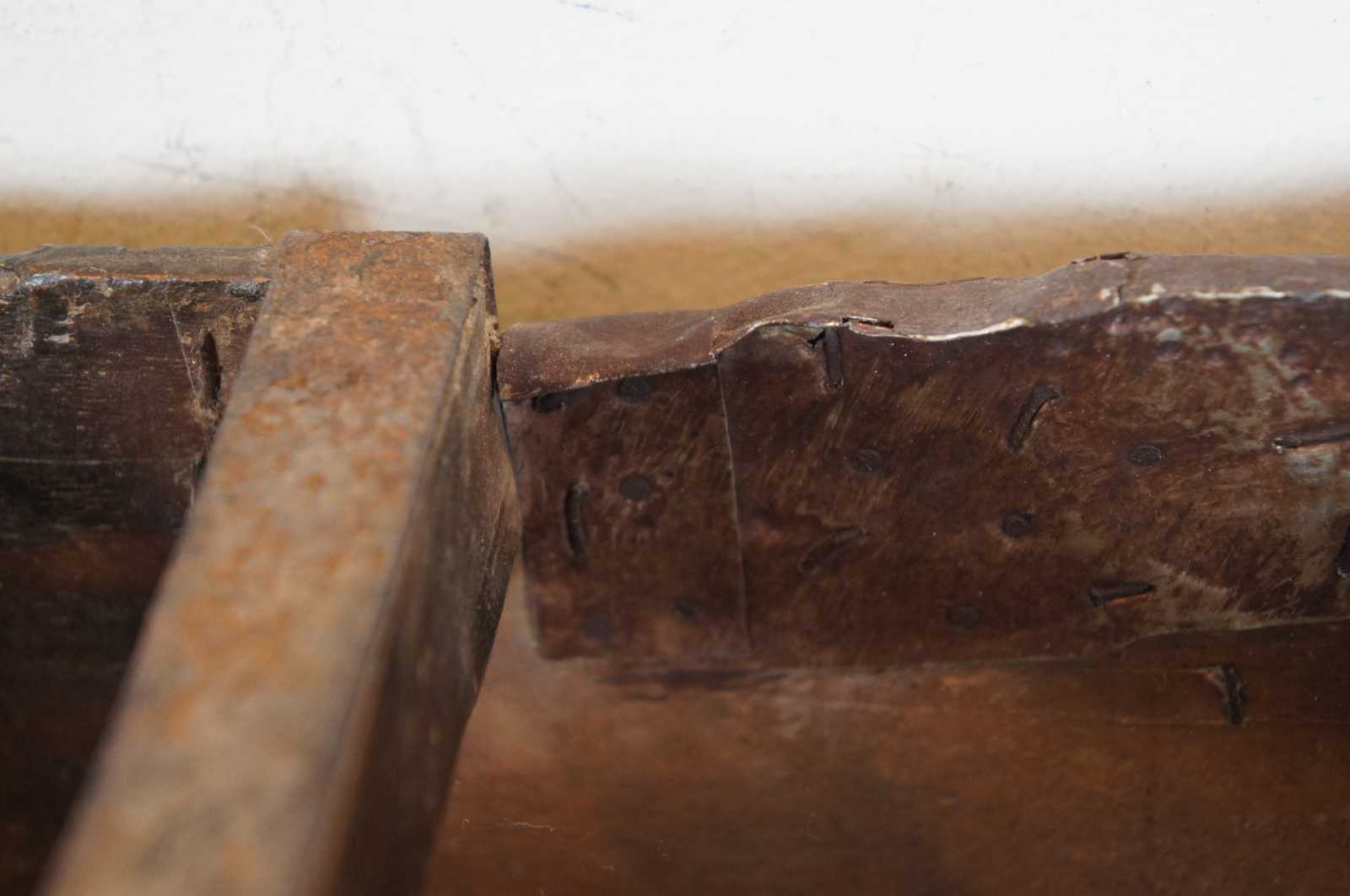 19th century Chinese wooden grain or rice measure / harvesting bucket with handle across the middle and primitive iron accents.