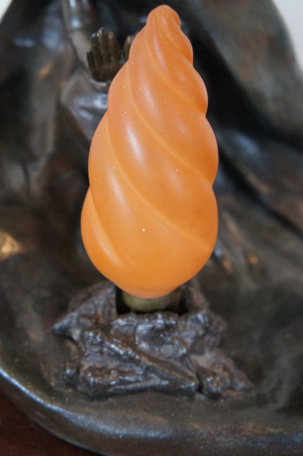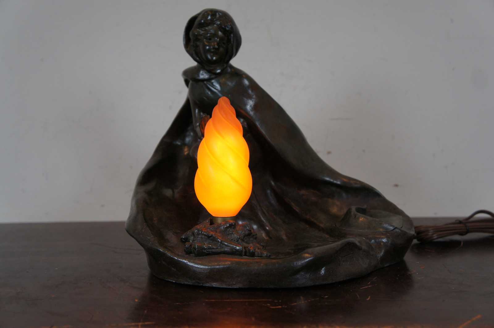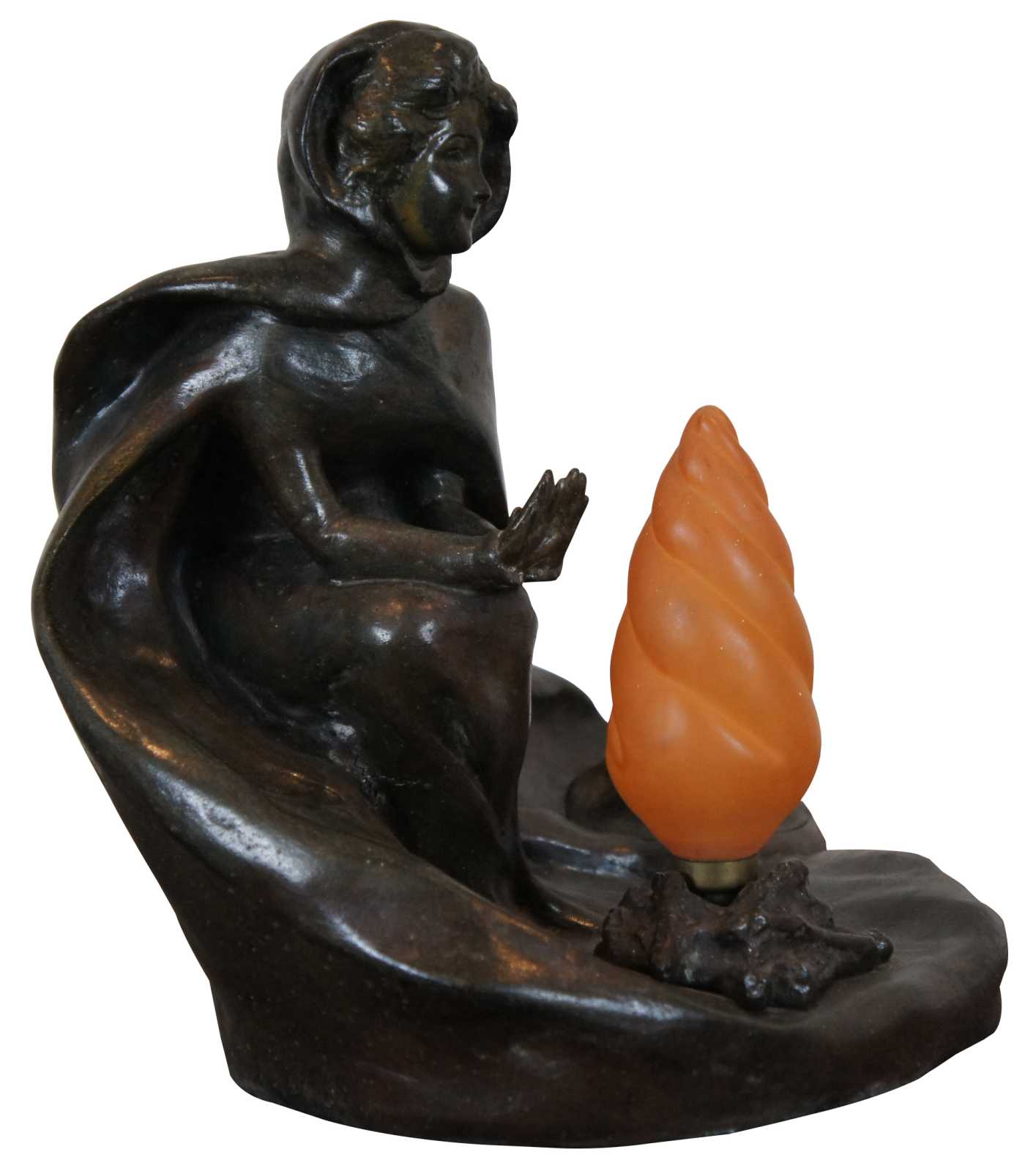 Antique 1920s art nouveau Georges Van Der Straeten bronze budoir lamp sculpture in the shape of a young woman warming herself at a camp fire, with inkwell or keepsake compartment.