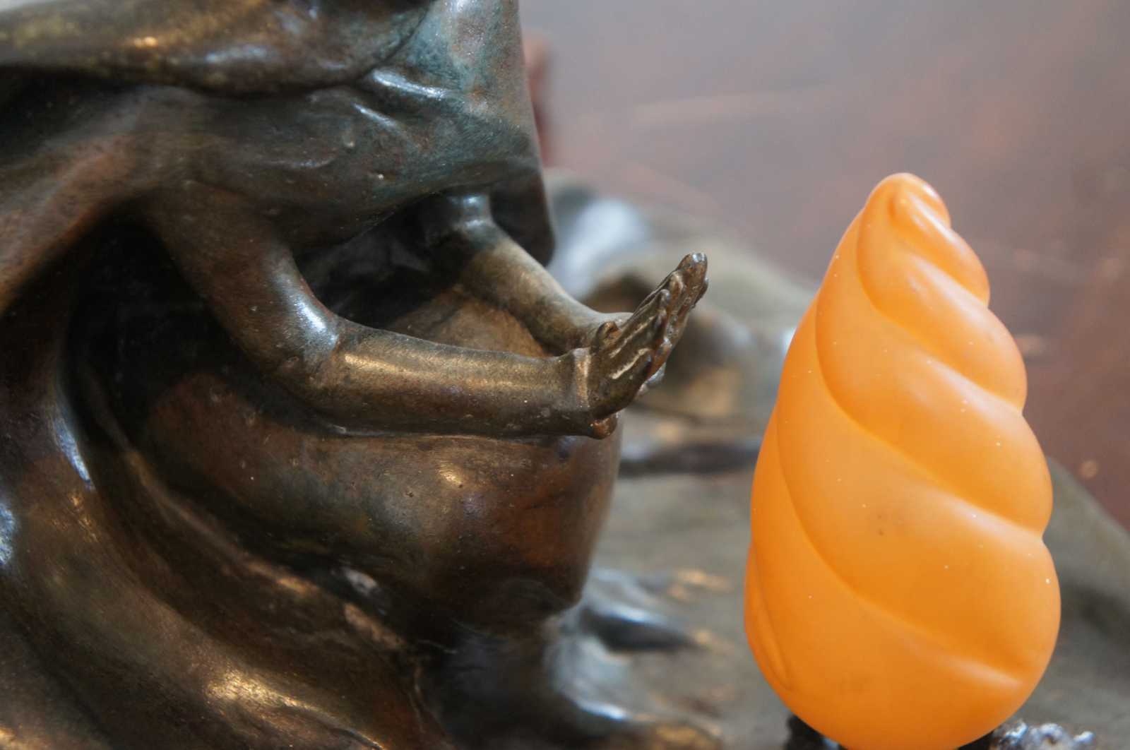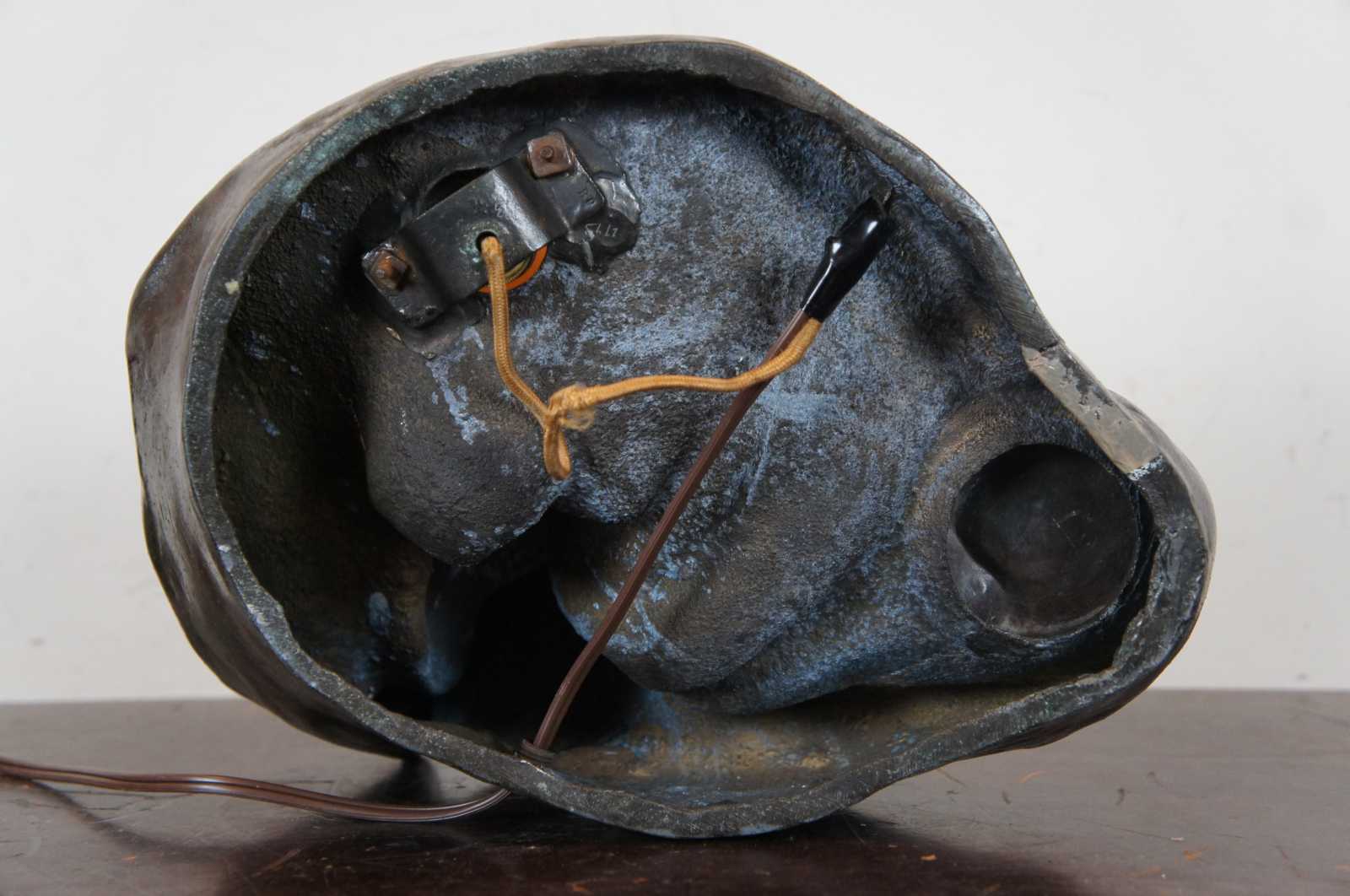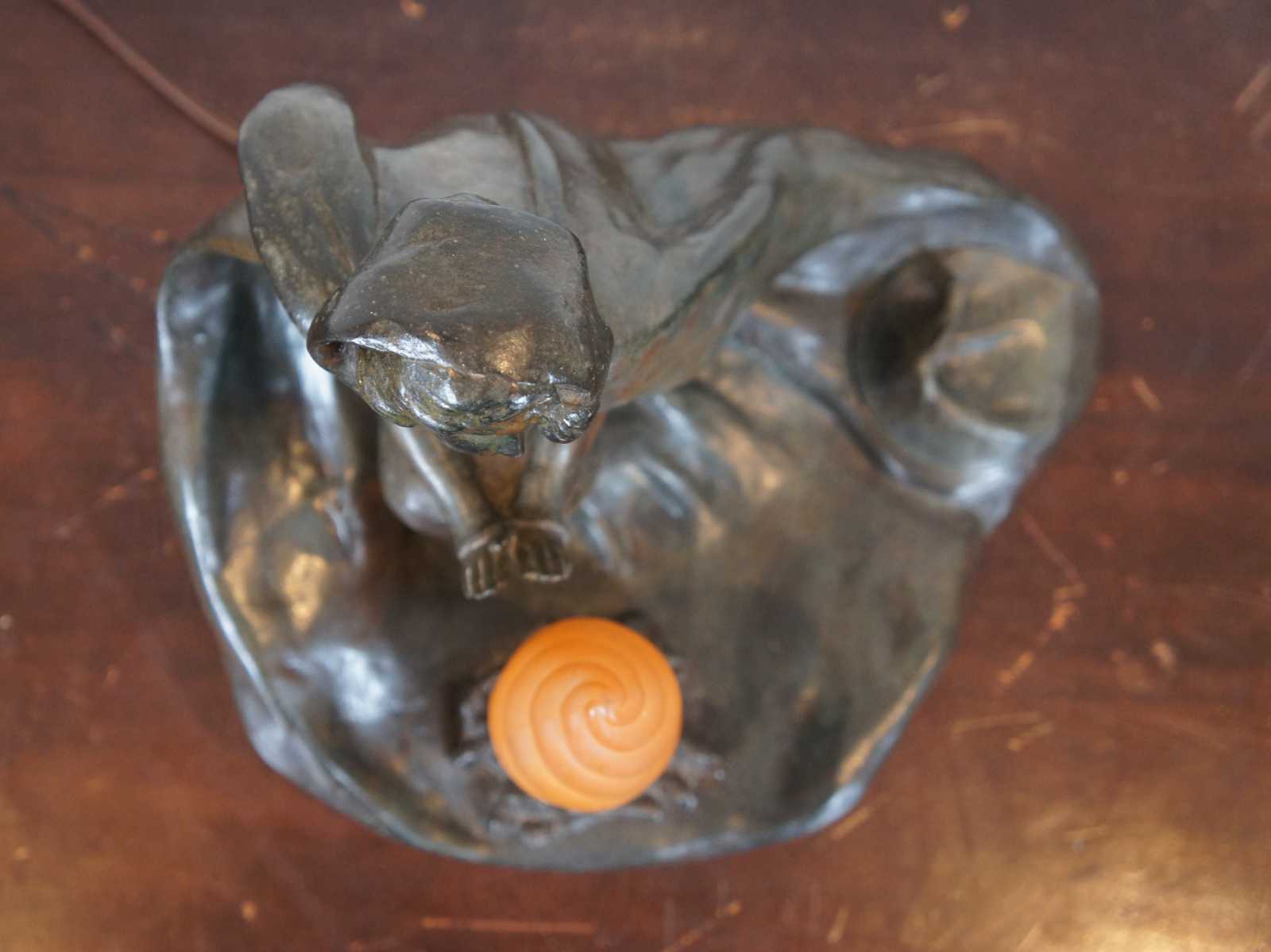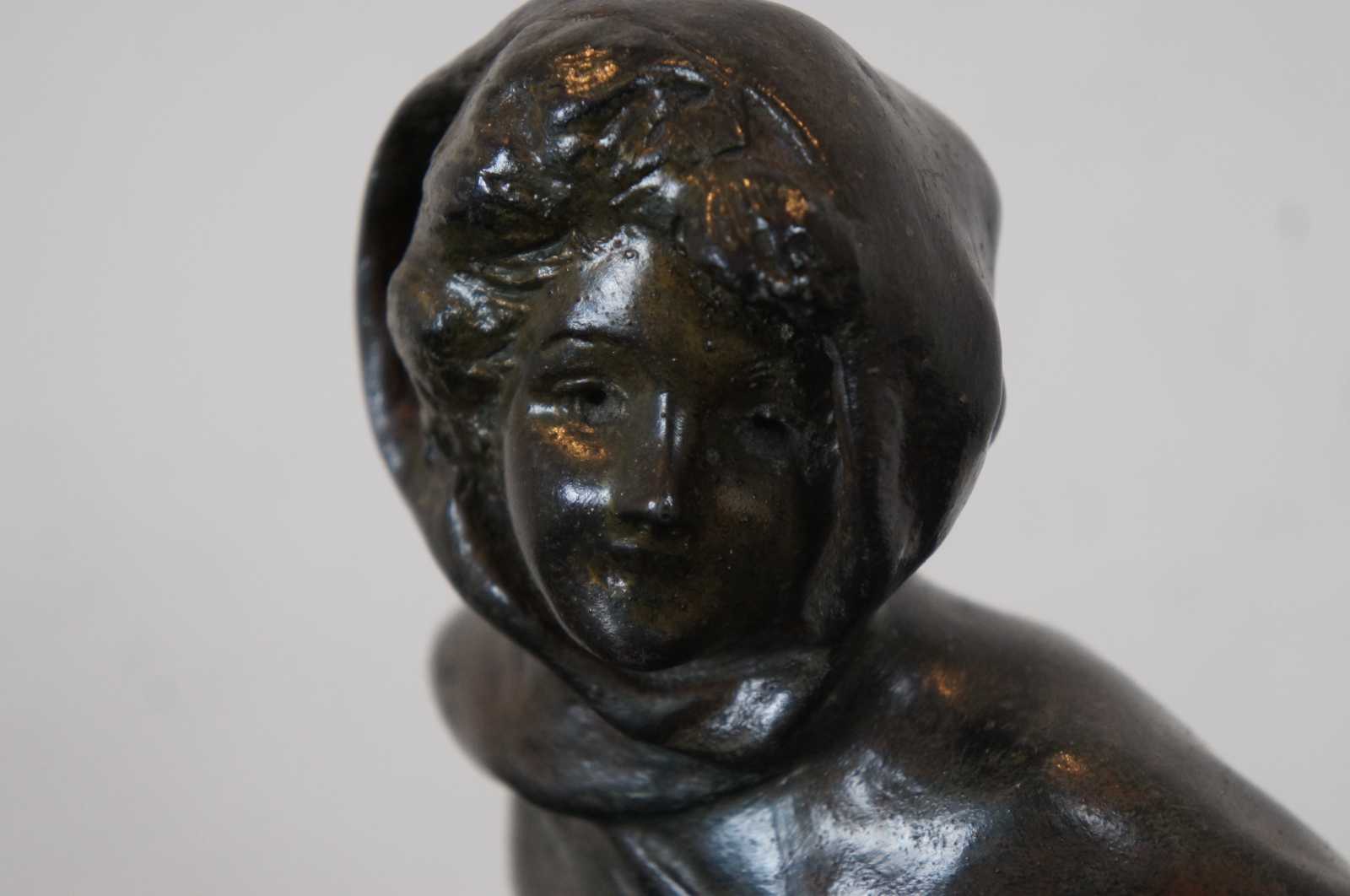 Antique 1920s art nouveau Georges Van Der Straeten bronze budoir lamp sculpture in the shape of a young woman warming herself at a camp fire, with inkwell or keepsake compartment.