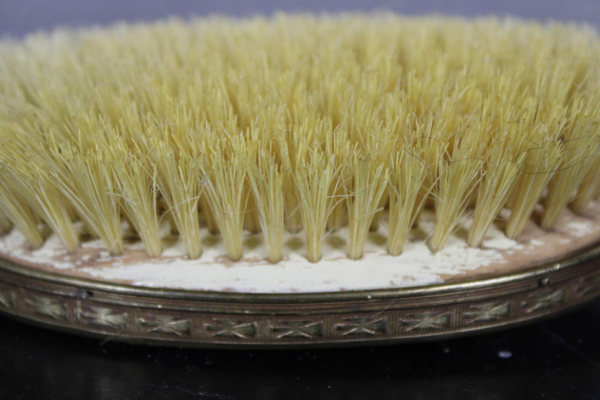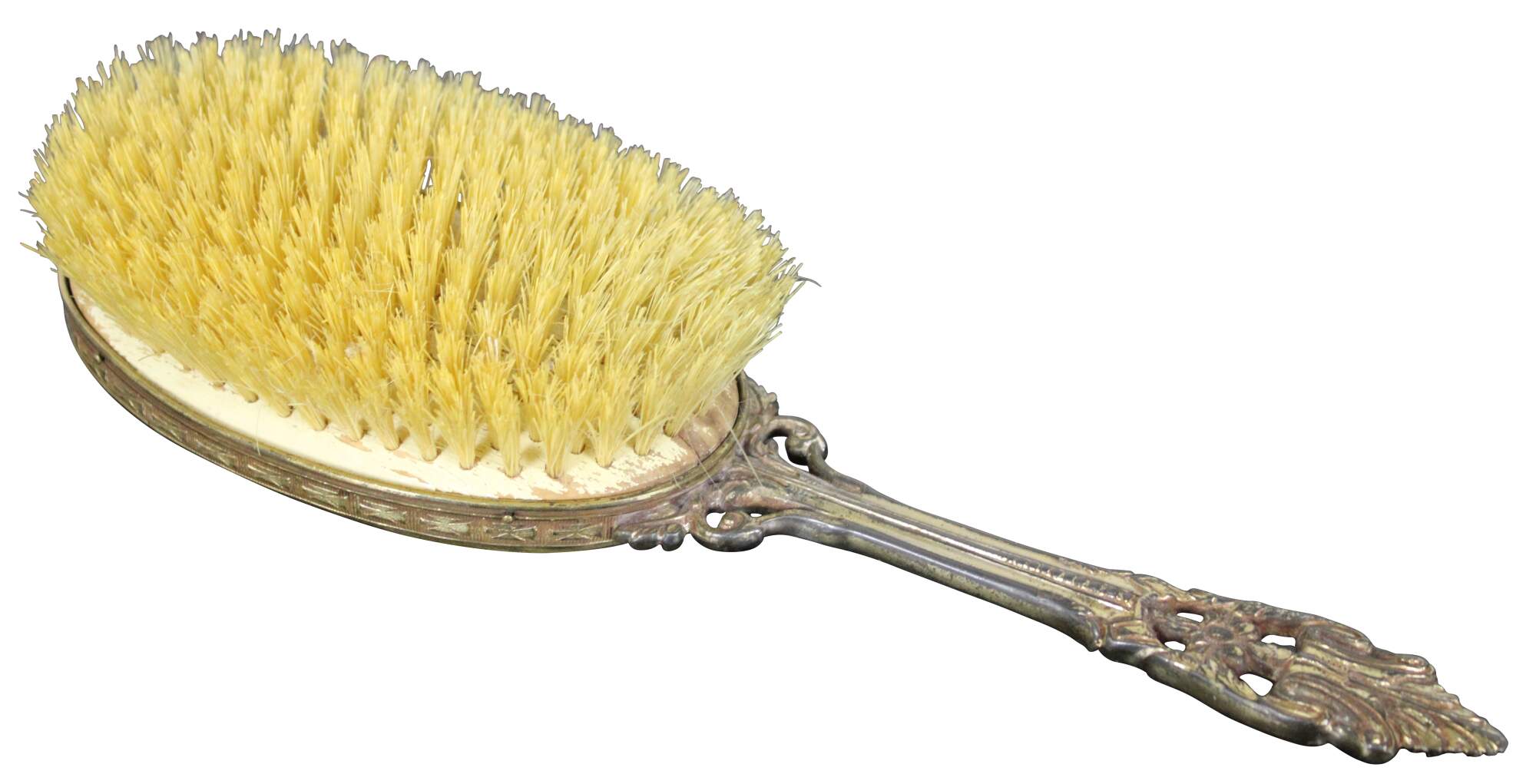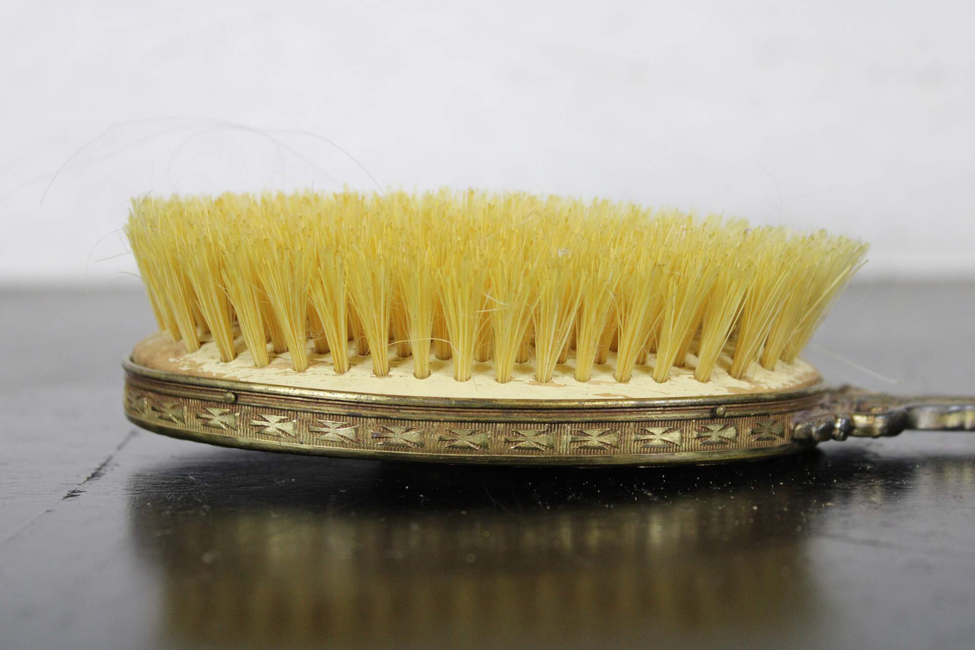 Antique brass handled hair brush with wooden bristle pad, horse hair bristles, black plastic back and guilloche enamel cameo accent.